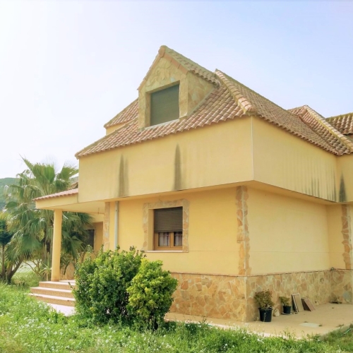 The well-kept house has 3 bedrooms, 3 bathrooms, kitchen with dining area, a bright and friendly living room with glas panels. One of the bedrooms with bathroom is separated from the main house. The outdoor area with partially covered terraces invites to linger in the sun or shade. The outdoor spaces are easy to maintain and have an automated irrigation system.