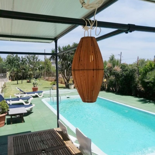 The plot has many plants and mature trees that create a green oasis by the pool. This has an oval shape and a size of around 60 m².