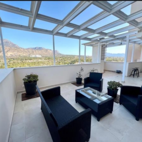 The penthouse is Duplex style with mezzanine and private terrace with views to the sea and the mountain. It further contains 4 bedrooms, 2 bathrooms, 1 kitchen dining room, 1 large living room, 1 office, 1 storage room for bikes and 1 garage underground in the same building.