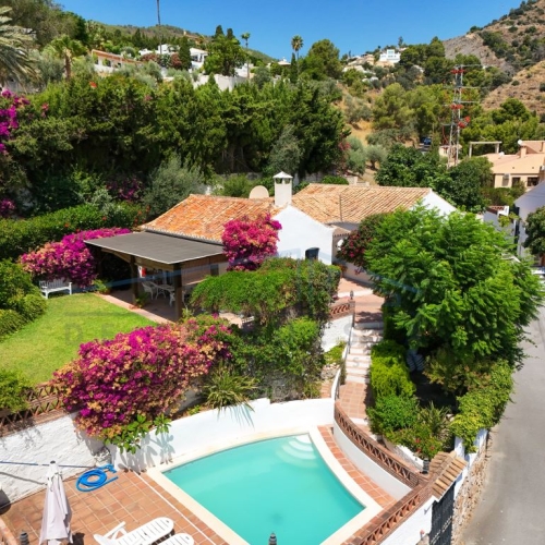 Fra stuen træder du ud på husets perle, en stor overdækket terrasse med vidunderlig udsigt over Alboranhavet og Cerro Gordos bjerge. Den omgivende have med sin frodige græsplæne og forfriskende pool er det perfekte sted til solbadning og afkøling på varme dage, samt til afslapning med familie og venner om aftenen. Terrassen er smukt dekoreret med autentiske søjler.