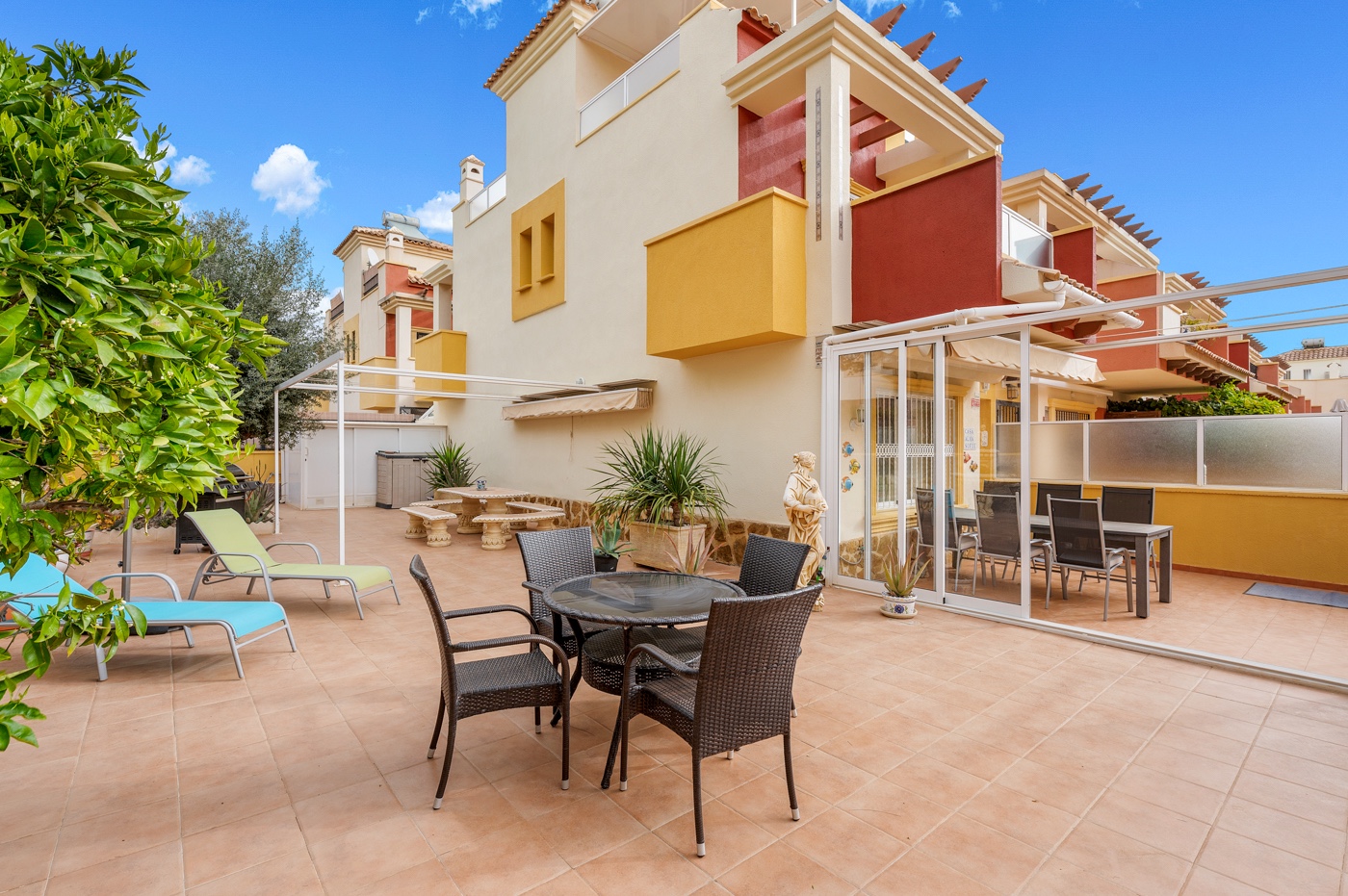 Located in the highly sought-after area of Villamartín on the beautiful Costa Blanca, this charming south-facing corner townhouse offers the perfect combination of space, privacy and Mediterranean lifestyle. The property sits on a large private corner plot of over 200 m², allowing plenty of outdoor space and sunshine throughout the day thanks to its excellent south orientation. Being a corner property also provides extra privacy, natural light and a more open feel compared to standard townhouses. The home is distributed over three levels: Ground floor: bright living and dining area, separate fully equipped kitchen, one bedroom and one bathroom — ideal for guests or convenient single-level living. First floor: two spacious bedrooms, both with their own private balconies, plus a second bathroom. Top floor: a private rooftop solarium, perfect for sunbathing, relaxing or creating a chill-out area with excellent privacy. The property is part of a gated residential community with access to a beautiful communal swimming pool, ideal for enjoying the warm Mediterranean climate. The location is another major highlight. The house is within easy reach of restaurants, bars, supermarkets and shops, and just a few minutes from the popular shopping destination La Zenia Boulevard — one of the largest shopping centres in the region Key Features Corner townhouse with large 200+ m² plotSouth-facing orientation (sun all day)3 bedrooms / 2 bathrooms1 bedroom on the ground floorSeparate fully equipped kitchen + closed patioPrivate balconies for both upstairs bedroomsPrivate rooftop solariumGated communityCommunal swimming poolPrime location in VillamartínMinutes from La Zenia Boulevard This property is perfect as a holiday home, permanent residence or rental investment, thanks to its prime location and excellent outdoor space.