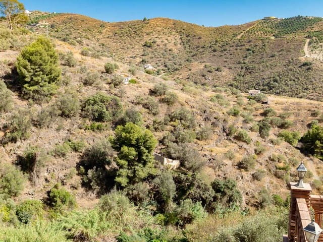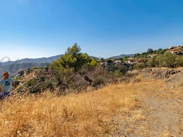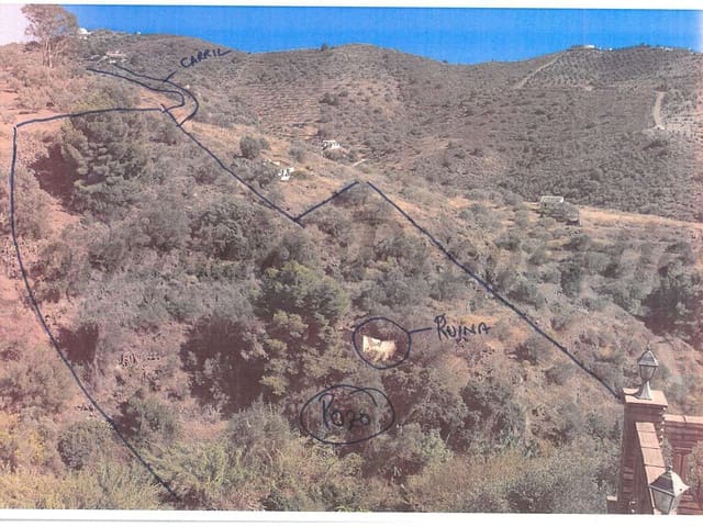 This plot is located a few kilometres outside the village of Torrox, on a south-east facing hillside, and reaches down through well-established olive trees, oaks and pines to the stream at the foot of the hill where various fruit trees have also been planted. The plot is roughly triangular in shape and has a ruin of an old cortijo about two thirds of the way down, just visible in the photograph. The plot is accessible from a road which then becomes a track which goes to the top corner of the land. From here an access would need to be created across the hillside to reach the 30m2 ruin where one could apply for building permission to reform. The plot has a water share from the water company Benagua, as well a private well on the land, down by the river, and electricity could be connected from the nearby network.