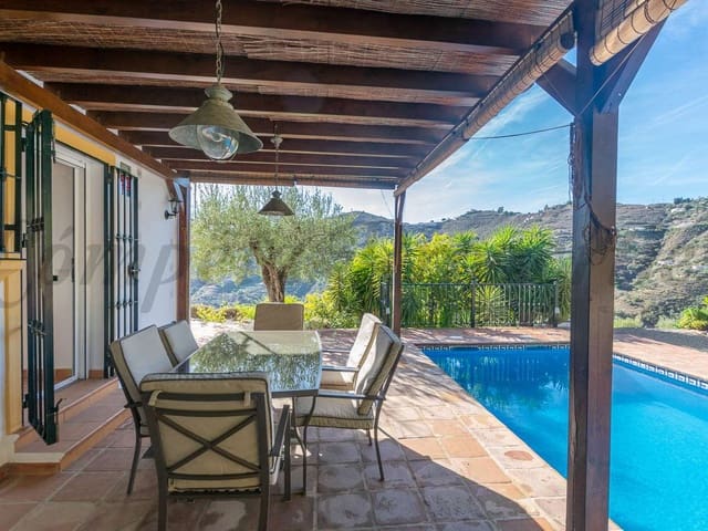 This fantastic country property is set in a peaceful area but less than ten minutes drive from the village of Cómpeta. The property has beautiful views over the surrounding verdant countryside and up to the Sierras. The living area of this superb property comprises an open plan living area with wood burning fire in the corner, fully equipped kitchen, guest toilet, utility room and two double bedrooms, both of them with ensuite facilities. The exterior of this country property is very attractive with flowers shrubs and trees. The swimming pool terrace also has a barbecue and outside kitchen area. This is the ideal place for spending ones time, sunbathing beside the pool, or relaxing with a good book under the shade of the pretty pergola. Air conditioning, gas central heating and double glazing make the property comfortable all year round.