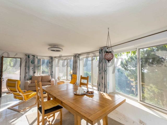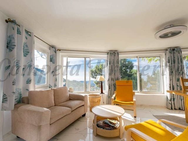 The main living area is an expansive open plan, comprising a bright conservatory, dining space, and two sitting areas with breathtaking vistas. Access to a rear terrace reveals enchanting western sunset views towards Gibraltar and the Moroccan mountains. A generously sized living space, adorned with a free-standing wood-burning stove, adds warmth to the atmosphere. Adjacent to this, a recently renovated, fully fitted kitchen awaits. A hallway leads to a family bathroom and two roomy double bedrooms. The master bedroom suite, complete with a dressing room and a newly refurbished en-suite bathroom, also has a door to the rear terrace.