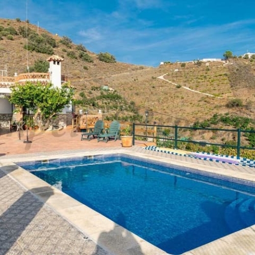 Holiday country property just 2 Km North of Torrox on the Frigiliana road. The house is rented for 4 people with 3 bedrooms (4th bedroom not in use) an en-suite shower room and a family bathroom. Spacious lounge-dining room with a fireplace, kitchen with a breakfast bar, a lovely large porch terrace for dining al fresco. The swimming pool 7m x 3m by a large terrace and a barbeque. Driveway to park 2 or 3 cars.