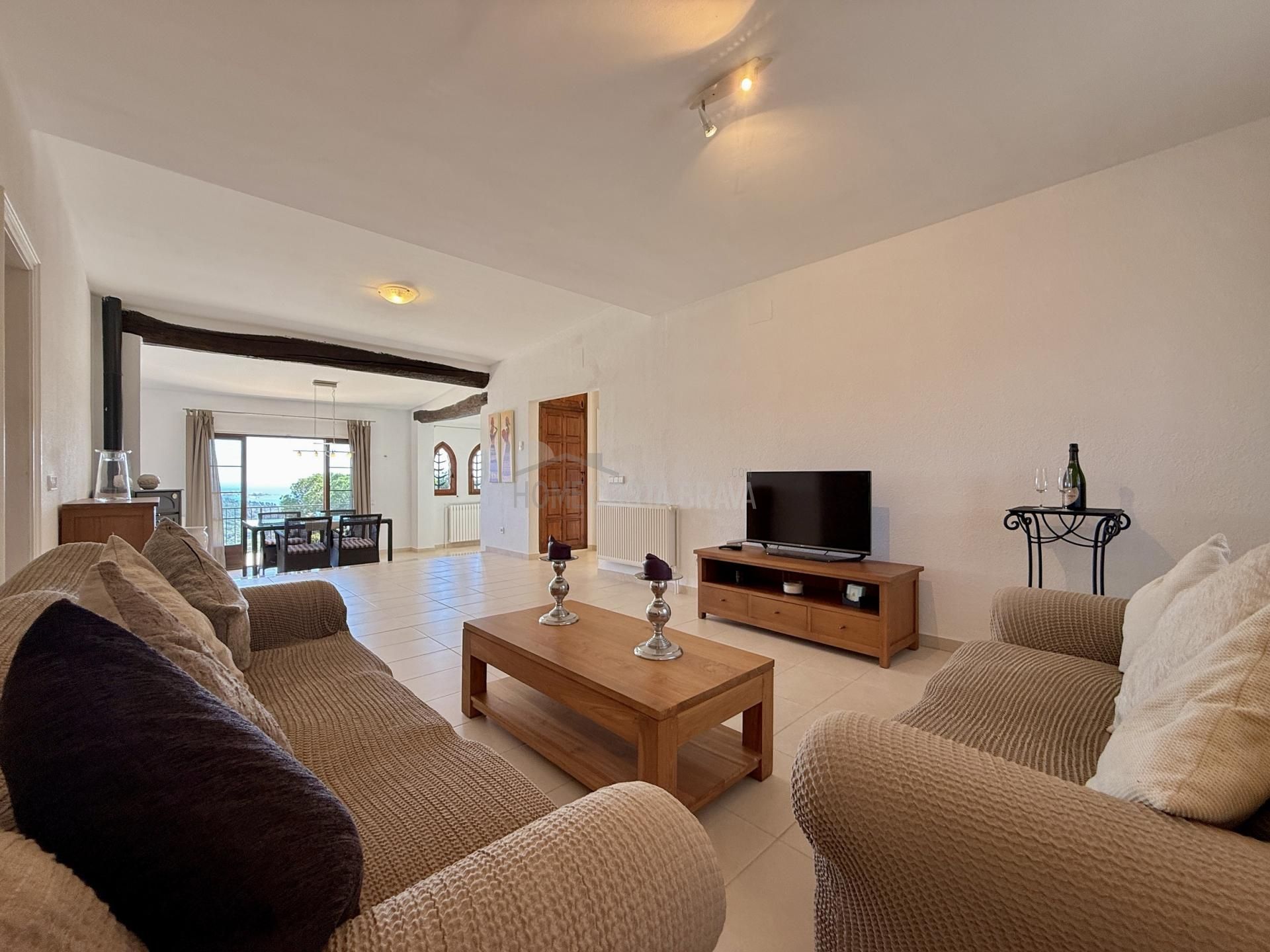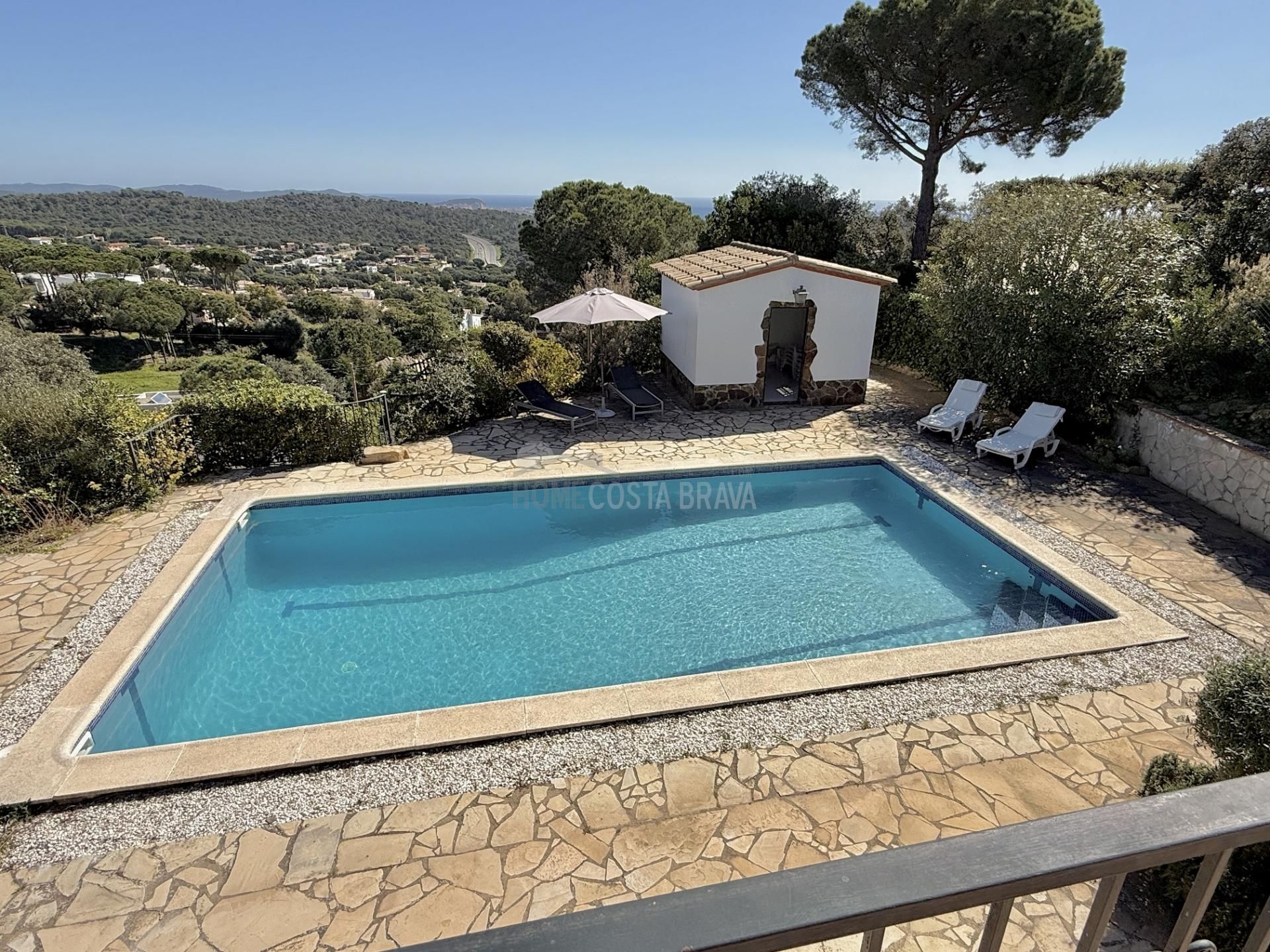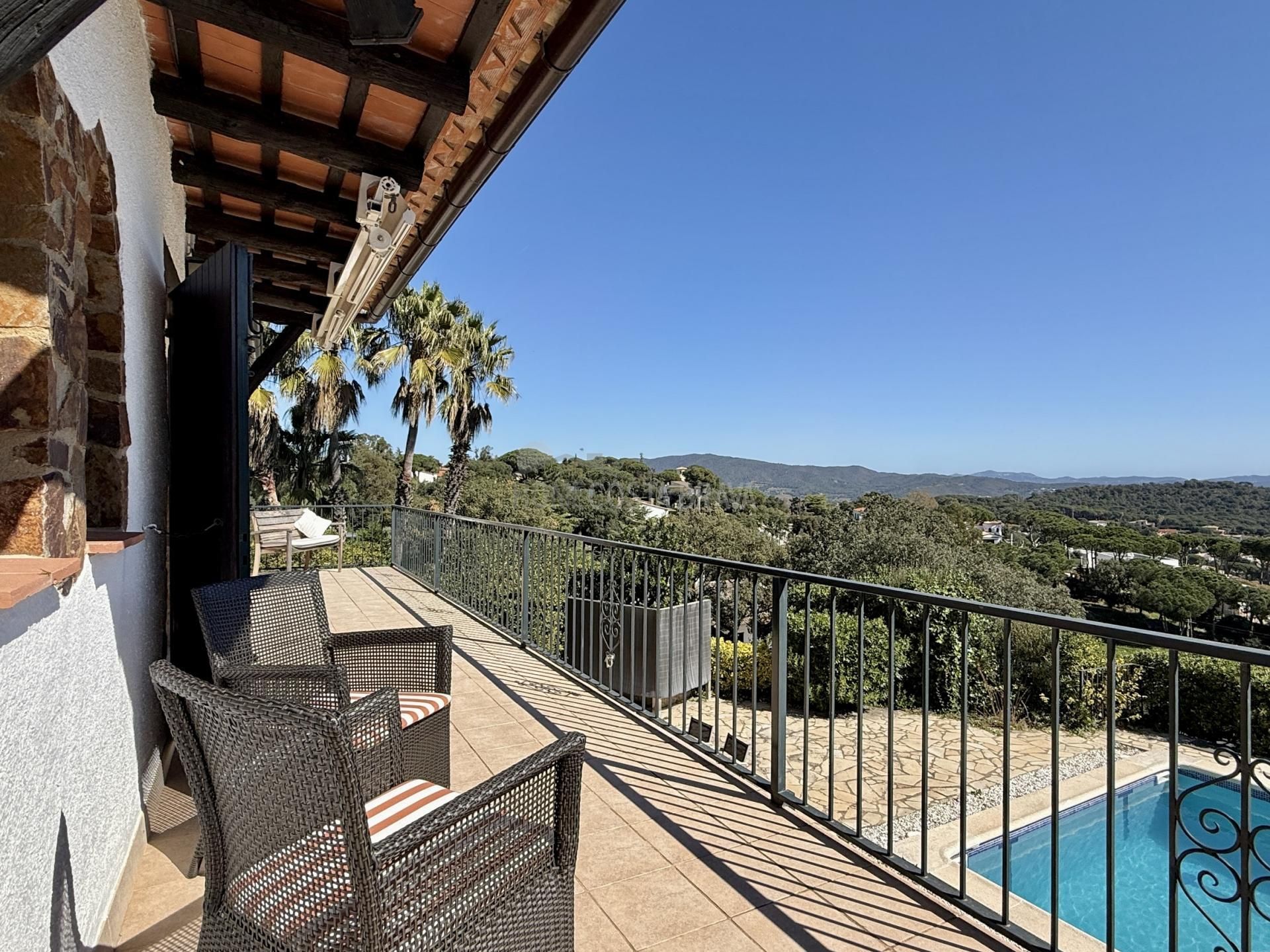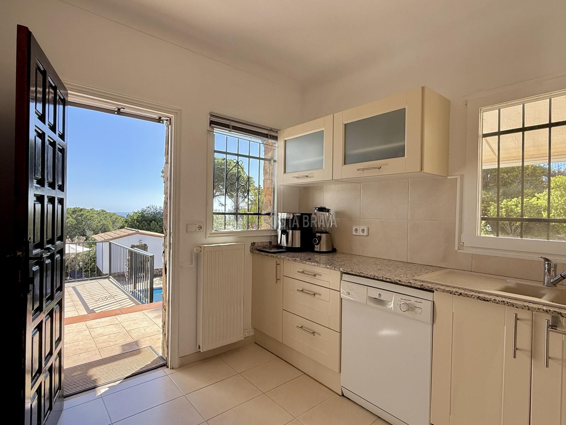 In a unique location, just 5 minutes from the beach and the lively centre of Platja d’Aro, you will find this charming villa that perfectly combines peace, space and comfort. Here you can enjoy complete privacy and a spectacular view over the Mediterranean Sea, the coastline up to Palamós and the beautiful hinterland of the Costa Brava. Layout of the house The villa is divided over two floors and is designed to make the most of both comfort and view. Upper floor (street level): Entrance hall with direct access to both the kitchen and the living room Spacious, fully equipped kitchen with outside door to the side terrace Very spacious living/dining room with large windows and patio doors to the terrace Large terrace with breathtaking views of the sea and the pool Two spacious bedrooms, both with air conditioning: one with a view of the front garden and one with panoramic sea views and no less than five fitted wardrobes Fully equipped bathroom with bath Lower floor (guest house): Apartment with separate bedroom with air conditioning Small sitting area with sofa bed, ideal as an extra guest room Full bathroom with bath Kitchenette Patio doors to the terrace and the large swimming pool Outdoor space: Large saltwater swimming pool (recently repointed) Terrace with beautiful views and plenty of space to relax Separate storage room for garden furniture, which can also be used as an extra room Beautiful, low-maintenance garden with driveway Side terrace adjacent to the kitchen, with views of the sea and the swimming pool Other facilities: Central heating via diesel (Buderus boiler, 1500-litre diesel tank) All windows are double glazed Air conditioning in all bedrooms Laundry room with washing machine, boiler and pool pump in separate technical room Spacious storage room at the rear of the apartment This property is a unique opportunity for those looking for peace, privacy and comfort, without giving up the proximity to beaches, shops and restaurants. Whether you are looking for a permanent home, a luxury holiday home or an interesting investment opportunity - this villa has it all. The villa has a tourist license. Product: Apialia Costa Brava Taxes, notary fees and registration costs are not included in the sales price.[IW]
