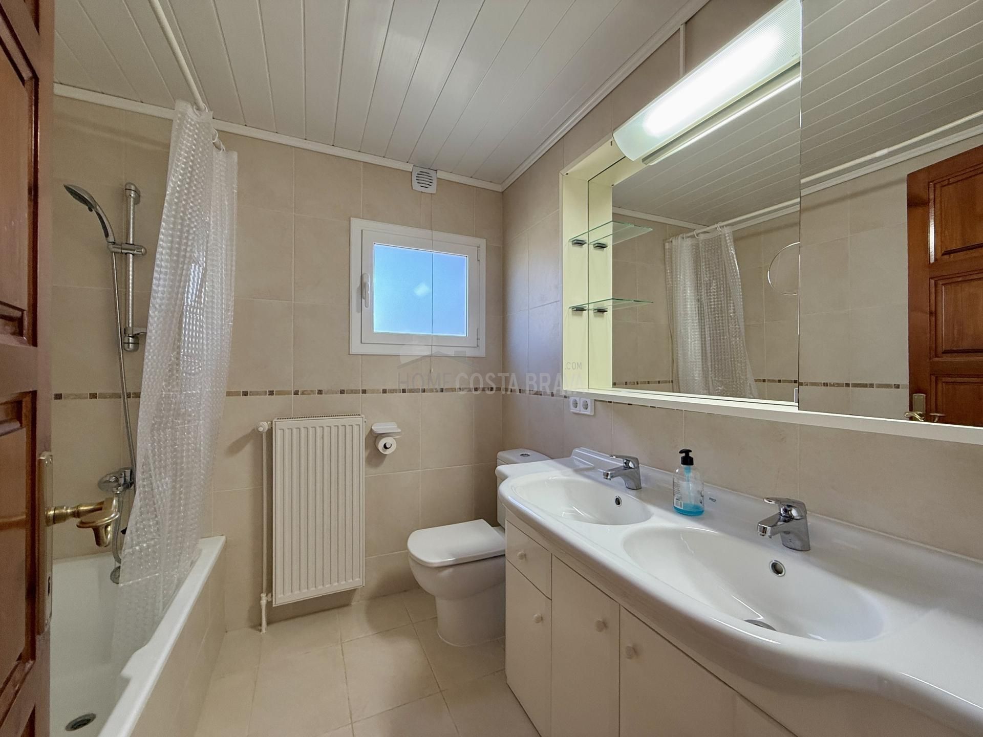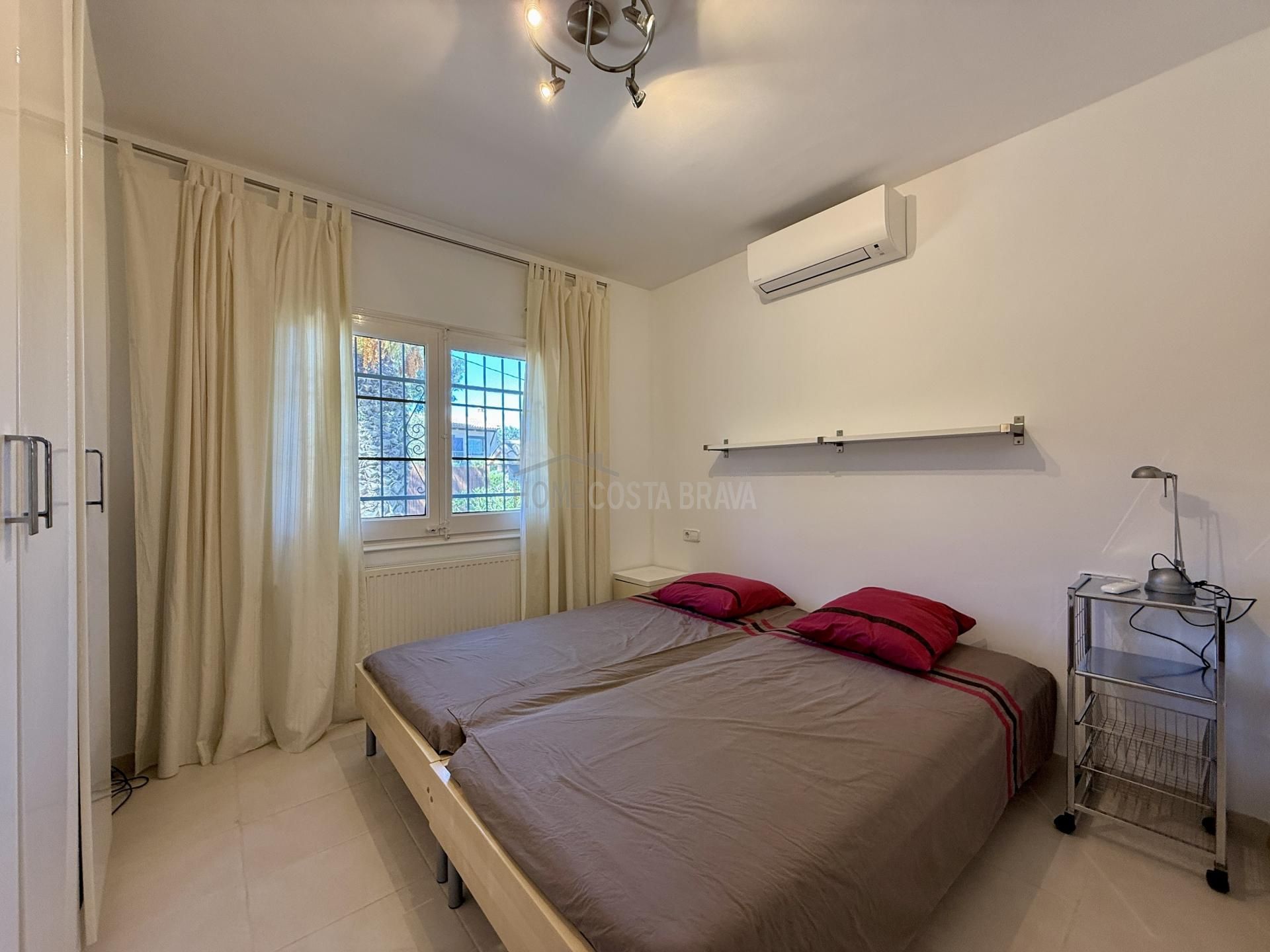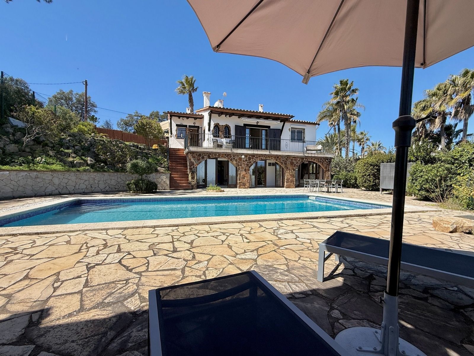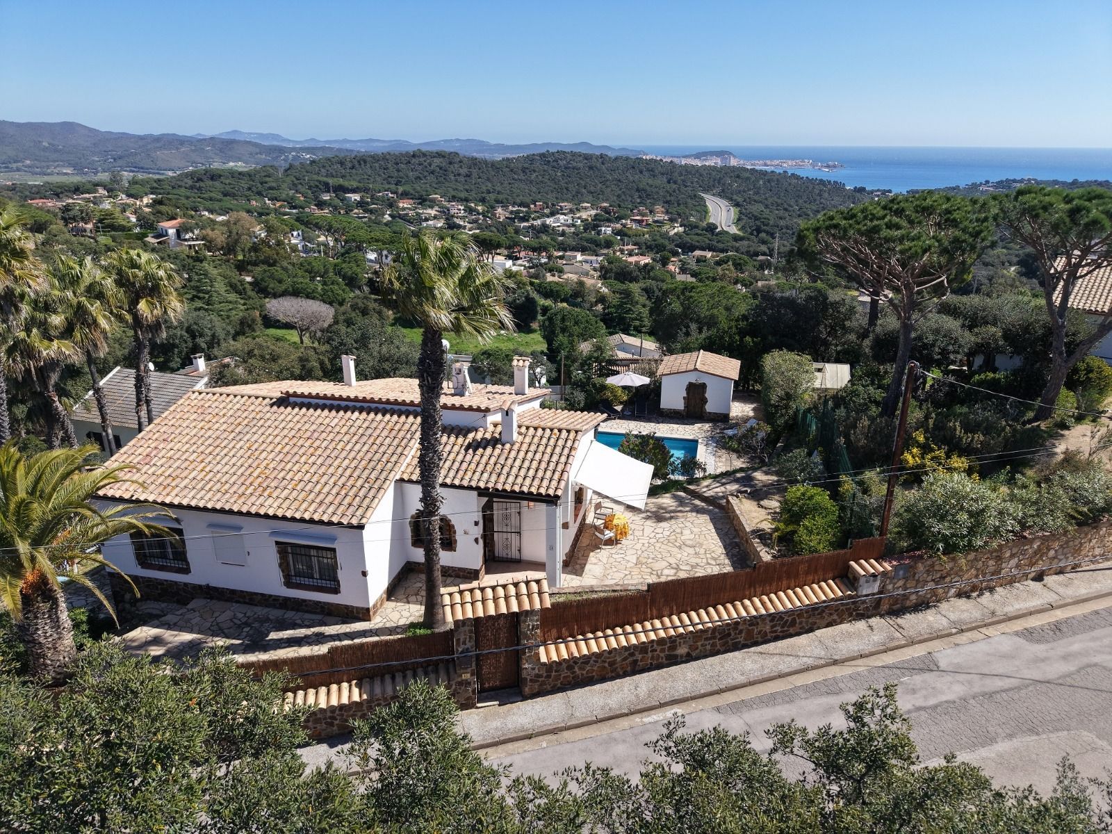 In a unique location, just 5 minutes from the beach and the lively centre of Platja d’Aro, you will find this charming villa that perfectly combines peace, space and comfort. Here you can enjoy complete privacy and a spectacular view over the Mediterranean Sea, the coastline up to Palamós and the beautiful hinterland of the Costa Brava. Layout of the house The villa is divided over two floors and is designed to make the most of both comfort and view. Upper floor (street level): Entrance hall with direct access to both the kitchen and the living room Spacious, fully equipped kitchen with outside door to the side terrace Very spacious living/dining room with large windows and patio doors to the terrace Large terrace with breathtaking views of the sea and the pool Two spacious bedrooms, both with air conditioning: one with a view of the front garden and one with panoramic sea views and no less than five fitted wardrobes Fully equipped bathroom with bath Lower floor (guest house): Apartment with separate bedroom with air conditioning Small sitting area with sofa bed, ideal as an extra guest room Full bathroom with bath Kitchenette Patio doors to the terrace and the large swimming pool Outdoor space: Large saltwater swimming pool (recently repointed) Terrace with beautiful views and plenty of space to relax Separate storage room for garden furniture, which can also be used as an extra room Beautiful, low-maintenance garden with driveway Side terrace adjacent to the kitchen, with views of the sea and the swimming pool Other facilities: Central heating via diesel (Buderus boiler, 1500-litre diesel tank) All windows are double glazed Air conditioning in all bedrooms Laundry room with washing machine, boiler and pool pump in separate technical room Spacious storage room at the rear of the apartment This property is a unique opportunity for those looking for peace, privacy and comfort, without giving up the proximity to beaches, shops and restaurants. Whether you are looking for a permanent home, a luxury holiday home or an interesting investment opportunity - this villa has it all. The villa has a tourist license. Product: Apialia Costa Brava Taxes, notary fees and registration costs are not included in the sales price.[IW]