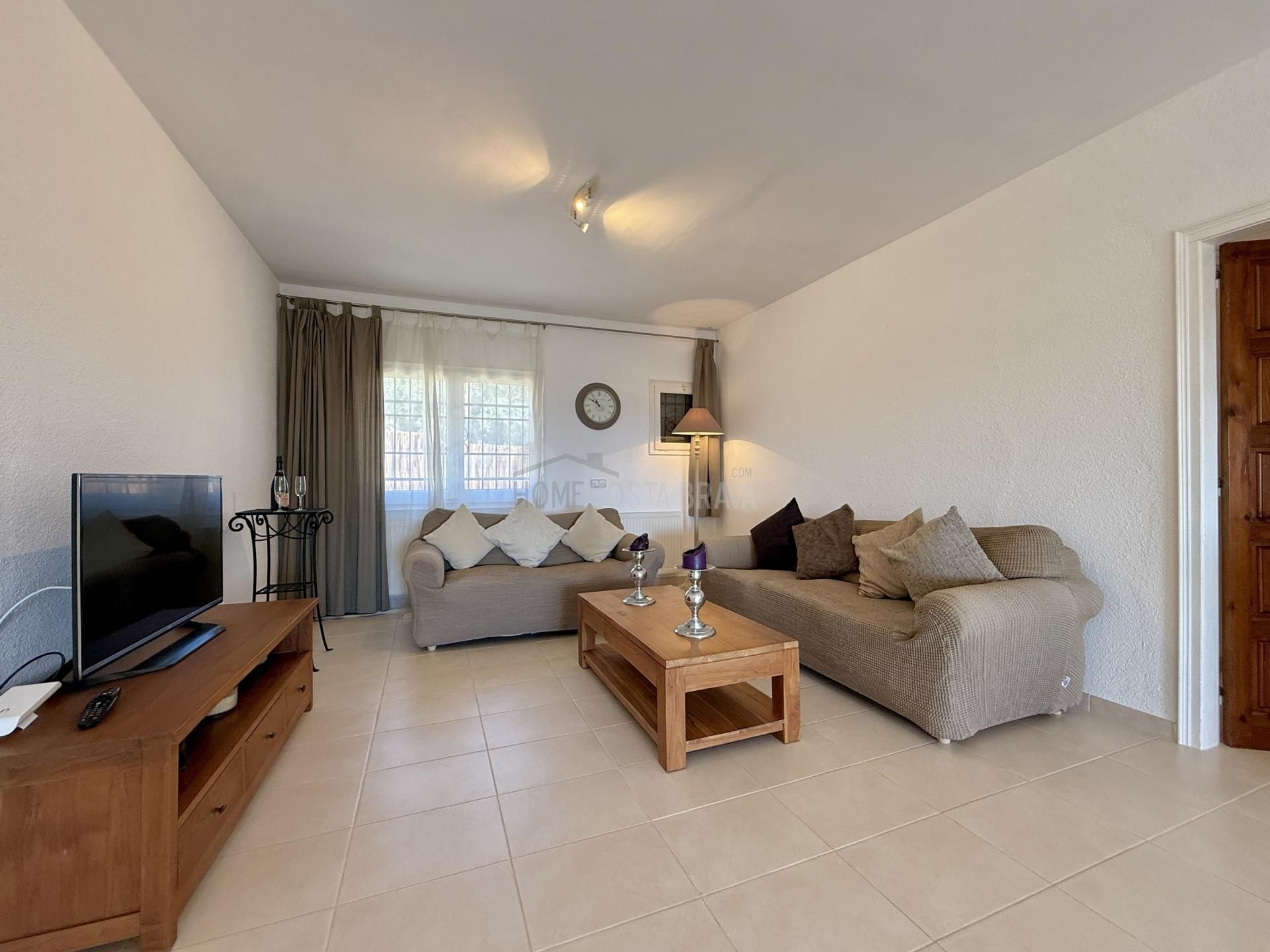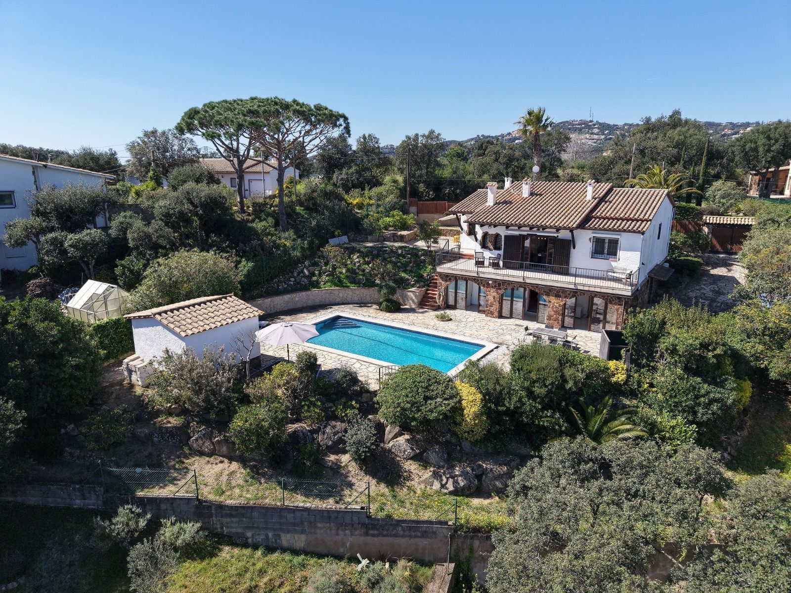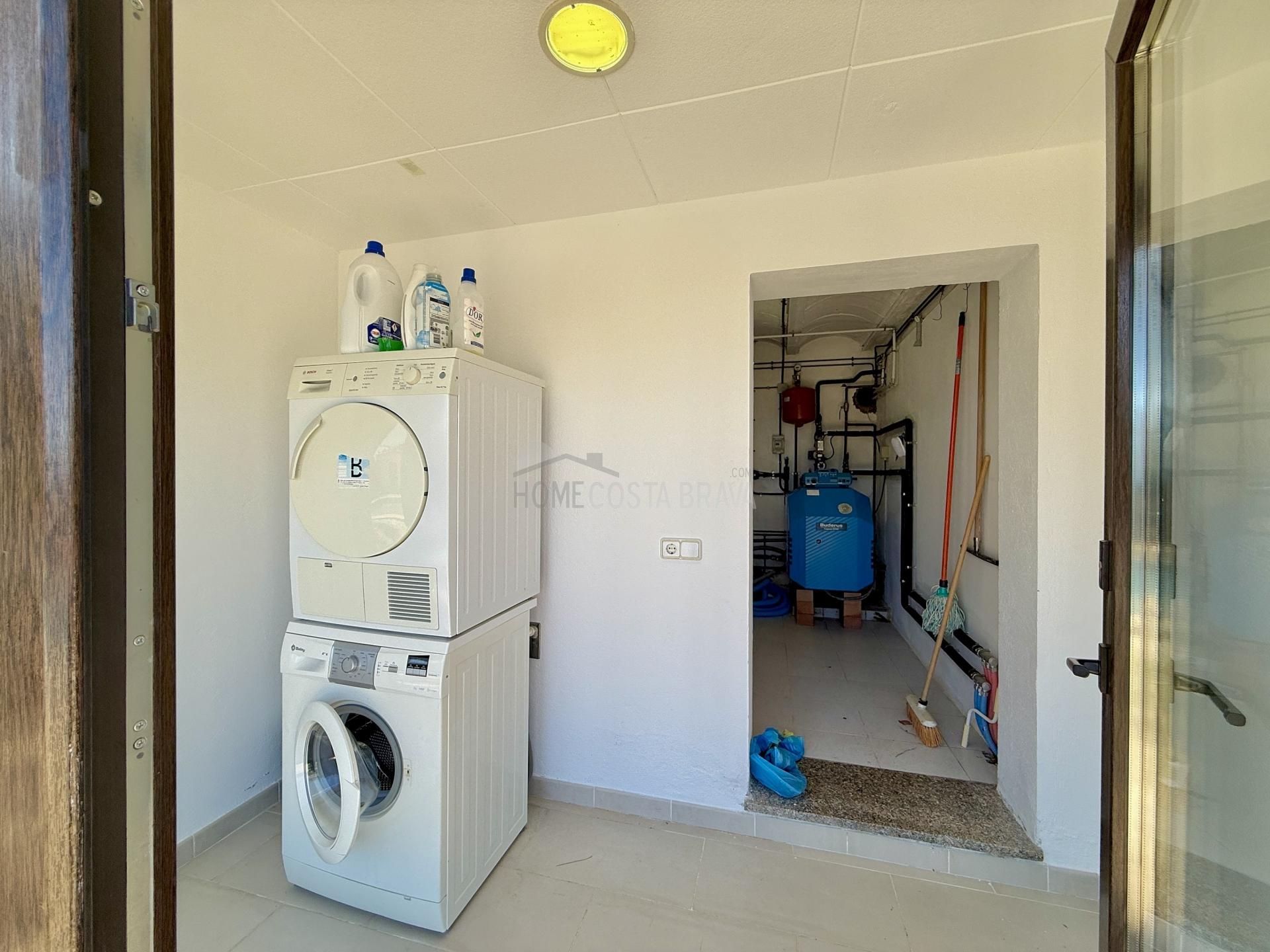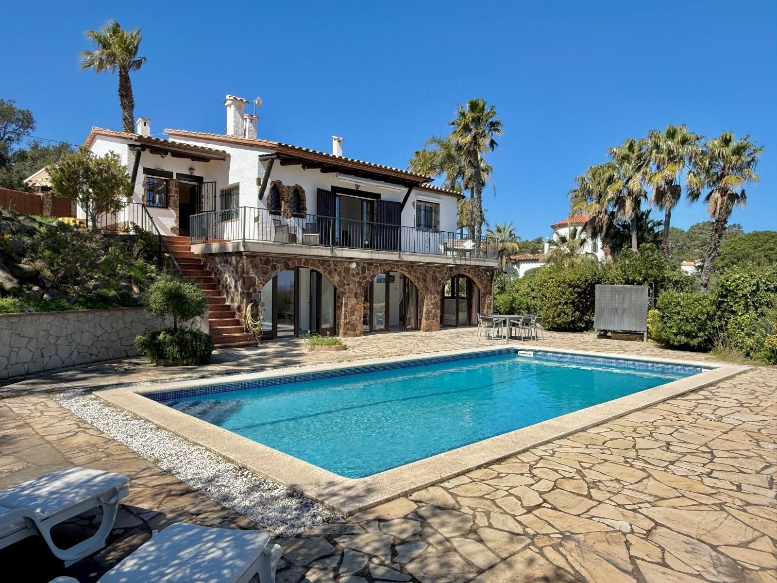 In a unique location, just 5 minutes from the beach and the lively centre of Platja d’Aro, you will find this charming villa that perfectly combines peace, space and comfort. Here you can enjoy complete privacy and a spectacular view over the Mediterranean Sea, the coastline up to Palamós and the beautiful hinterland of the Costa Brava. Layout of the house The villa is divided over two floors and is designed to make the most of both comfort and view. Upper floor (street level): Entrance hall with direct access to both the kitchen and the living room Spacious, fully equipped kitchen with outside door to the side terrace Very spacious living/dining room with large windows and patio doors to the terrace Large terrace with breathtaking views of the sea and the pool Two spacious bedrooms, both with air conditioning: one with a view of the front garden and one with panoramic sea views and no less than five fitted wardrobes Fully equipped bathroom with bath Lower floor (guest house): Apartment with separate bedroom with air conditioning Small sitting area with sofa bed, ideal as an extra guest room Full bathroom with bath Kitchenette Patio doors to the terrace and the large swimming pool Outdoor space: Large saltwater swimming pool (recently repointed) Terrace with beautiful views and plenty of space to relax Separate storage room for garden furniture, which can also be used as an extra room Beautiful, low-maintenance garden with driveway Side terrace adjacent to the kitchen, with views of the sea and the swimming pool Other facilities: Central heating via diesel (Buderus boiler, 1500-litre diesel tank) All windows are double glazed Air conditioning in all bedrooms Laundry room with washing machine, boiler and pool pump in separate technical room Spacious storage room at the rear of the apartment This property is a unique opportunity for those looking for peace, privacy and comfort, without giving up the proximity to beaches, shops and restaurants. Whether you are looking for a permanent home, a luxury holiday home or an interesting investment opportunity - this villa has it all. The villa has a tourist license. Product: Apialia Costa Brava Taxes, notary fees and registration costs are not included in the sales price.[IW]