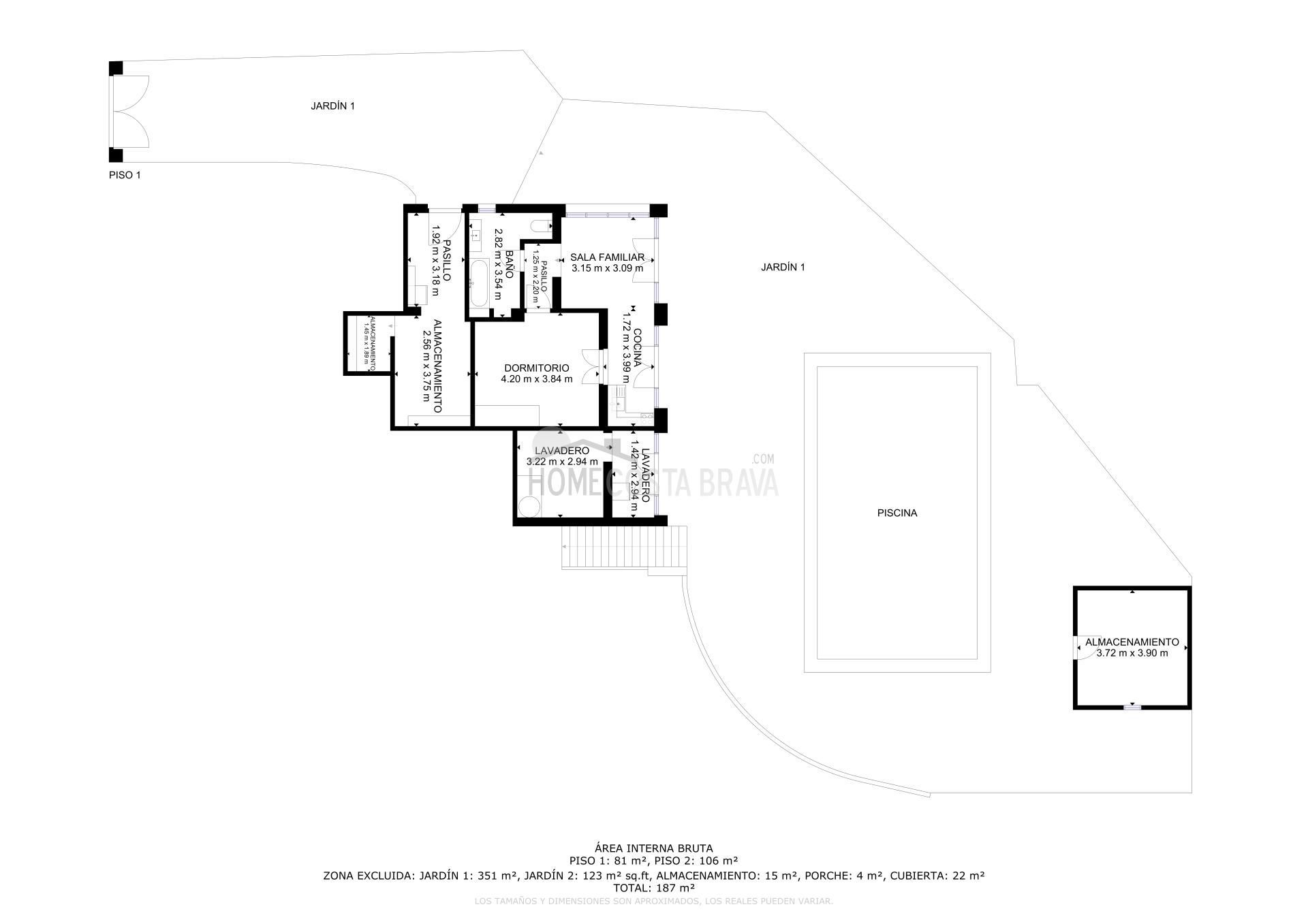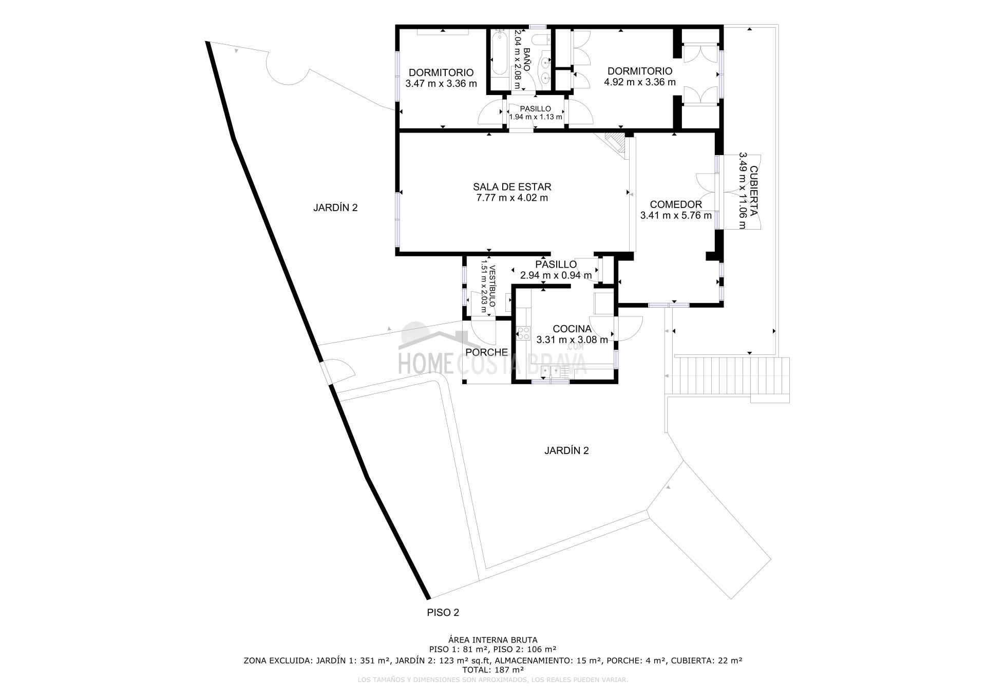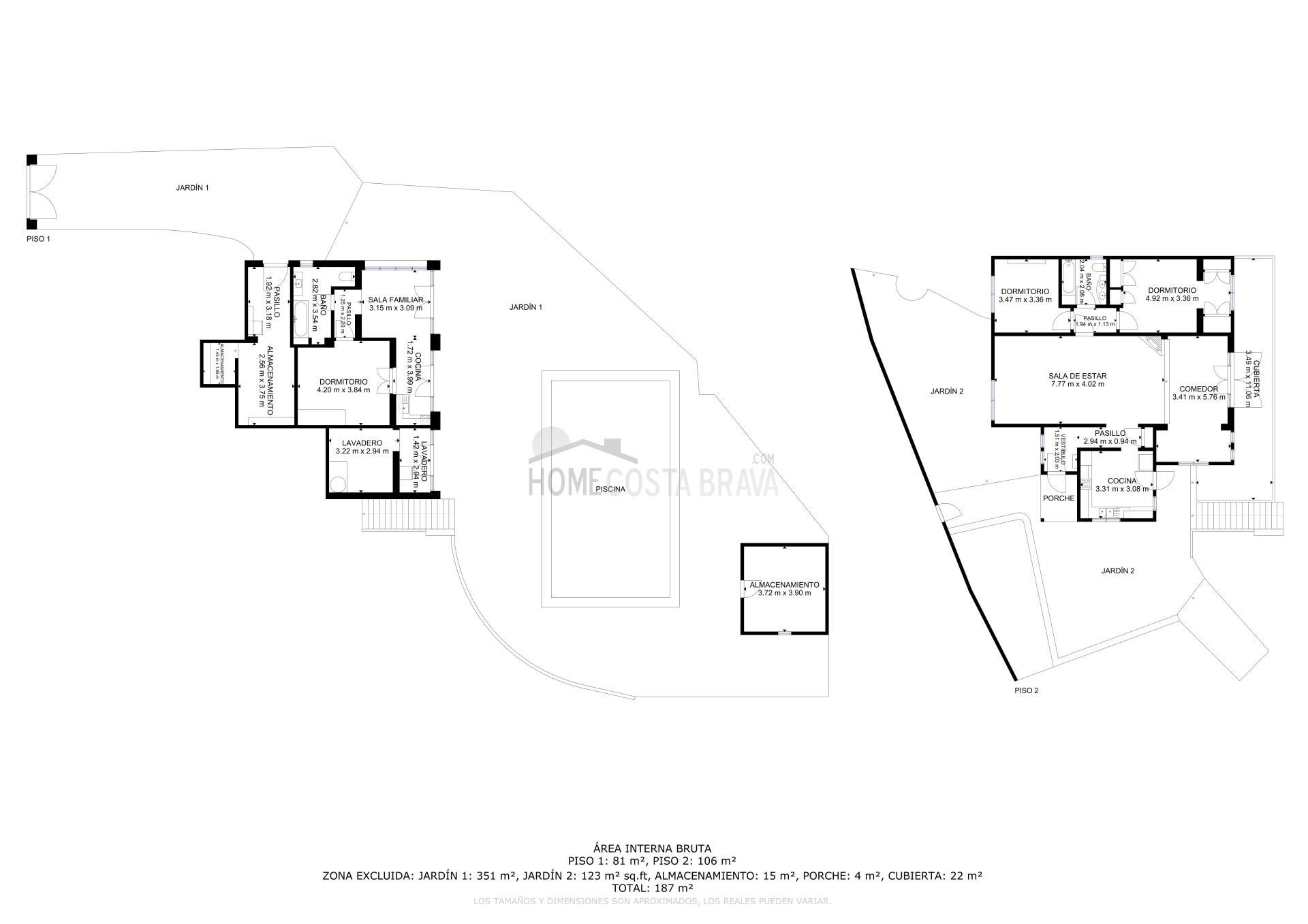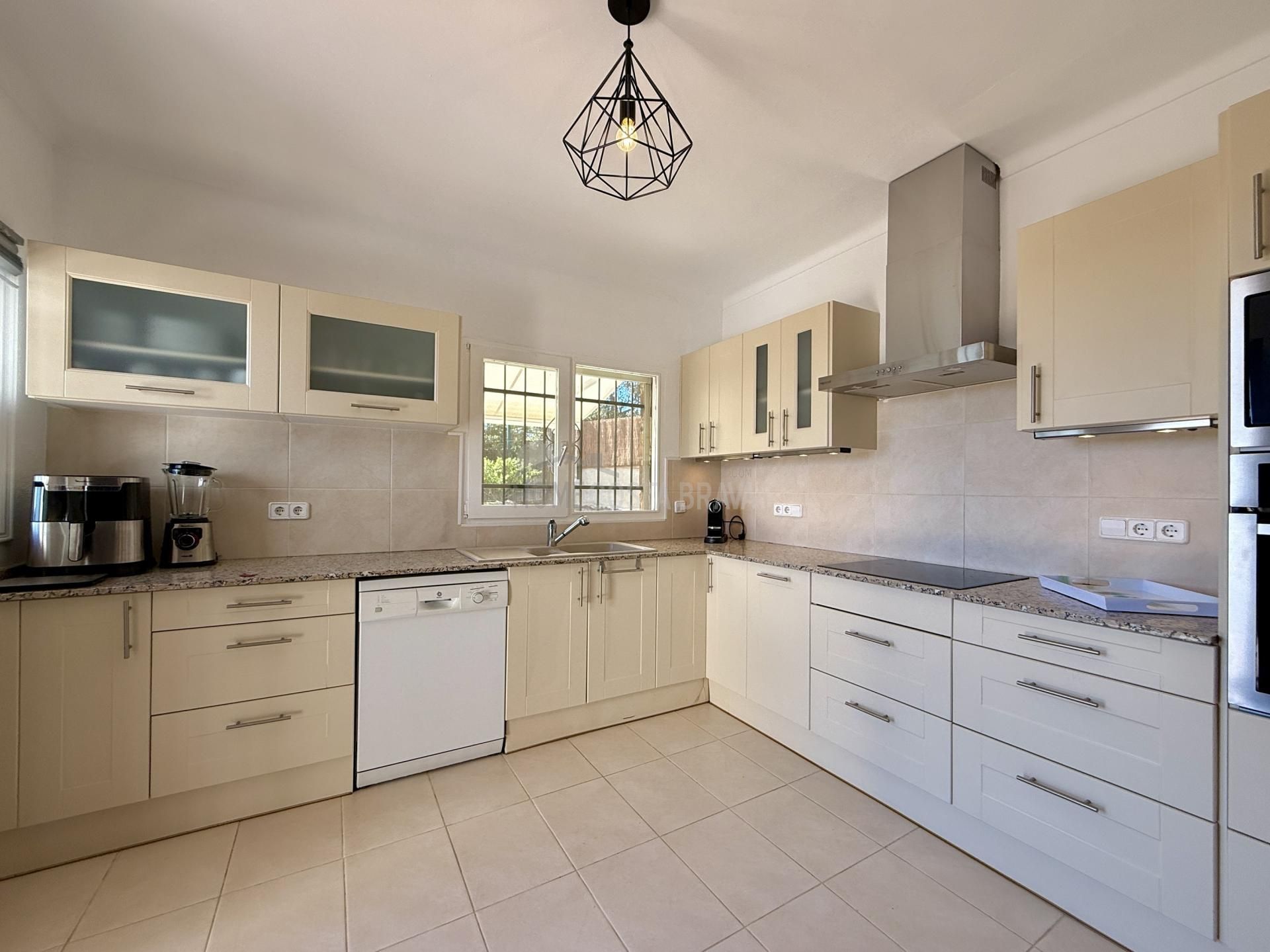 In a unique location, just 5 minutes from the beach and the lively centre of Platja d’Aro, you will find this charming villa that perfectly combines peace, space and comfort. Here you can enjoy complete privacy and a spectacular view over the Mediterranean Sea, the coastline up to Palamós and the beautiful hinterland of the Costa Brava. Layout of the house The villa is divided over two floors and is designed to make the most of both comfort and view. Upper floor (street level): Entrance hall with direct access to both the kitchen and the living room Spacious, fully equipped kitchen with outside door to the side terrace Very spacious living/dining room with large windows and patio doors to the terrace Large terrace with breathtaking views of the sea and the pool Two spacious bedrooms, both with air conditioning: one with a view of the front garden and one with panoramic sea views and no less than five fitted wardrobes Fully equipped bathroom with bath Lower floor (guest house): Apartment with separate bedroom with air conditioning Small sitting area with sofa bed, ideal as an extra guest room Full bathroom with bath Kitchenette Patio doors to the terrace and the large swimming pool Outdoor space: Large saltwater swimming pool (recently repointed) Terrace with beautiful views and plenty of space to relax Separate storage room for garden furniture, which can also be used as an extra room Beautiful, low-maintenance garden with driveway Side terrace adjacent to the kitchen, with views of the sea and the swimming pool Other facilities: Central heating via diesel (Buderus boiler, 1500-litre diesel tank) All windows are double glazed Air conditioning in all bedrooms Laundry room with washing machine, boiler and pool pump in separate technical room Spacious storage room at the rear of the apartment This property is a unique opportunity for those looking for peace, privacy and comfort, without giving up the proximity to beaches, shops and restaurants. Whether you are looking for a permanent home, a luxury holiday home or an interesting investment opportunity - this villa has it all. The villa has a tourist license. Product: Apialia Costa Brava Taxes, notary fees and registration costs are not included in the sales price.[IW]
