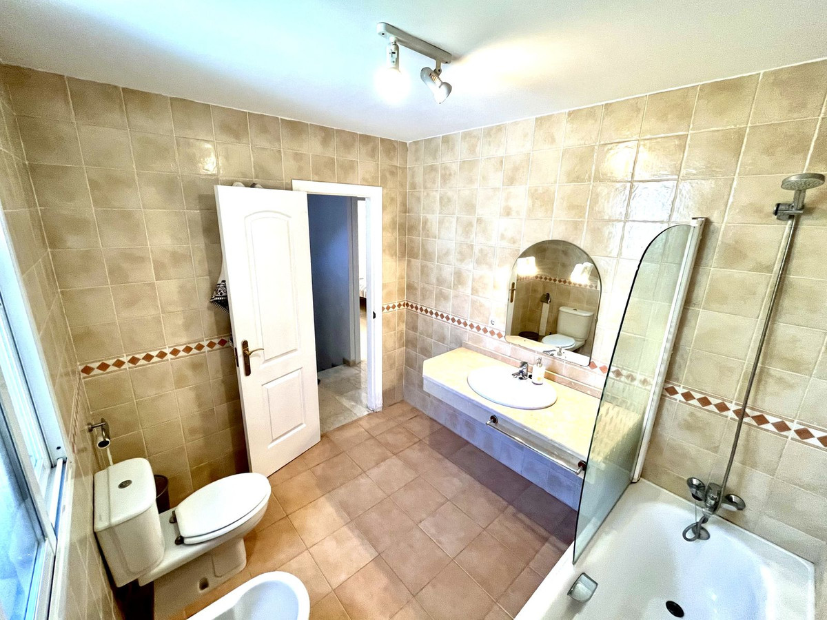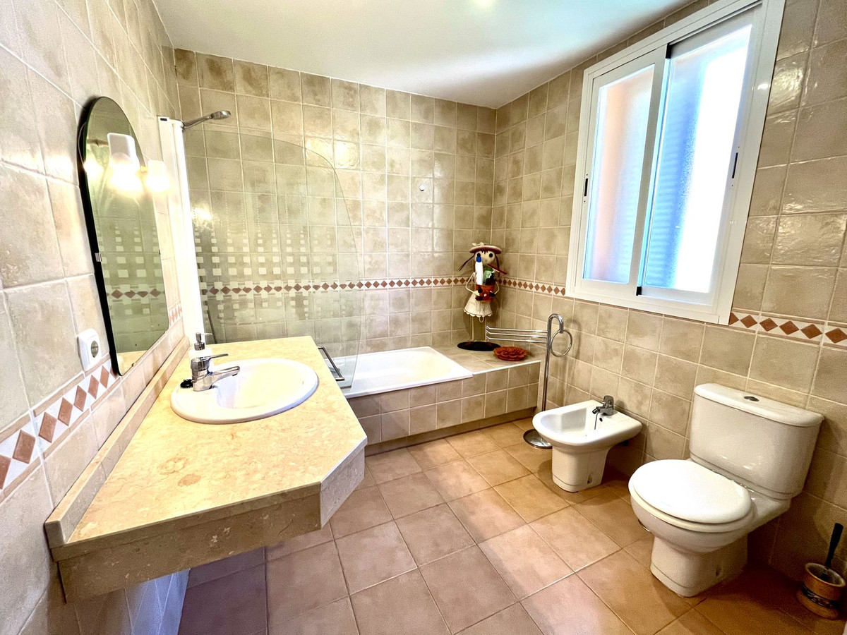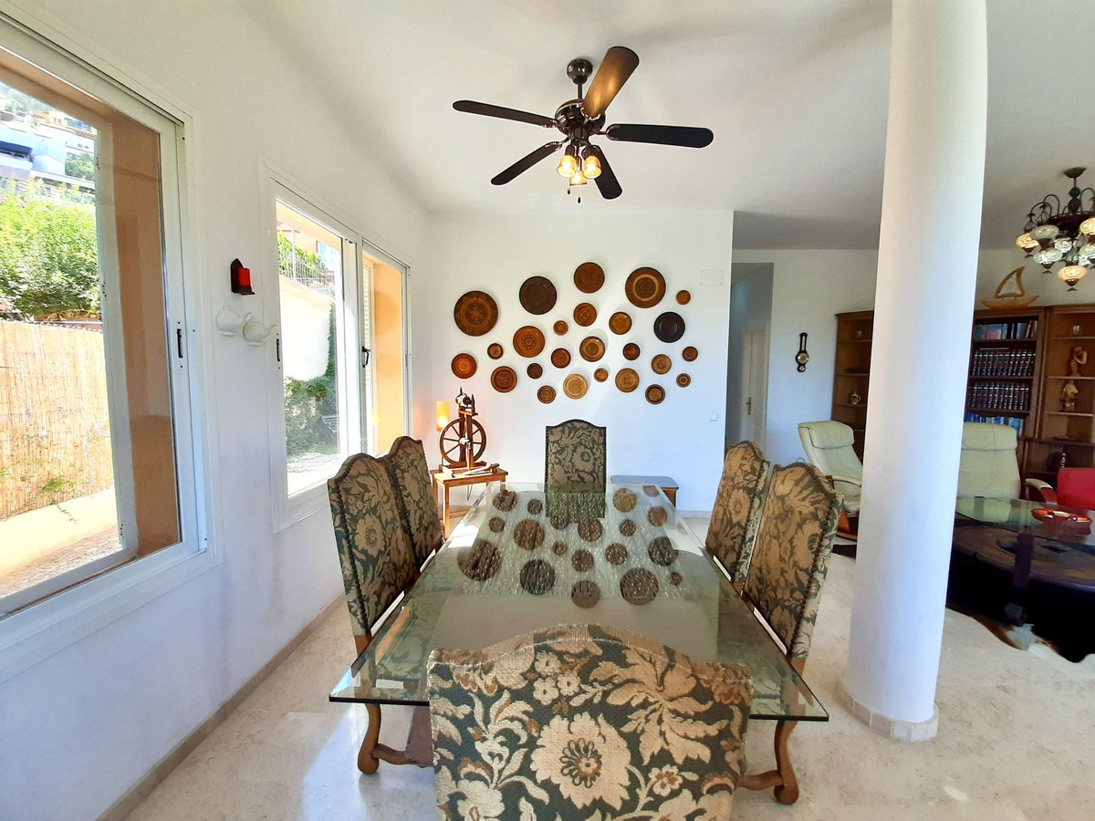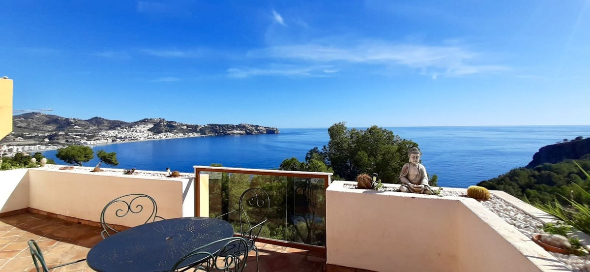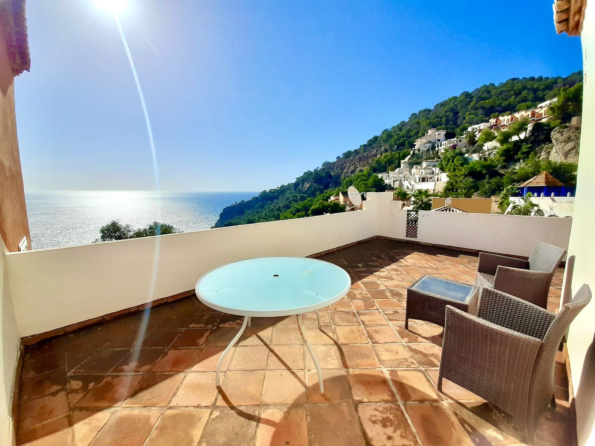 Ejendommen har tre rummelige soveværelser med dobbeltsenge, alle med indbyggede skabe og adgang til en stor terrasse med panoramaudsigt over La Herradura-bugten. Det store soveværelse har et elegant en-suite marmorbadeværelse.