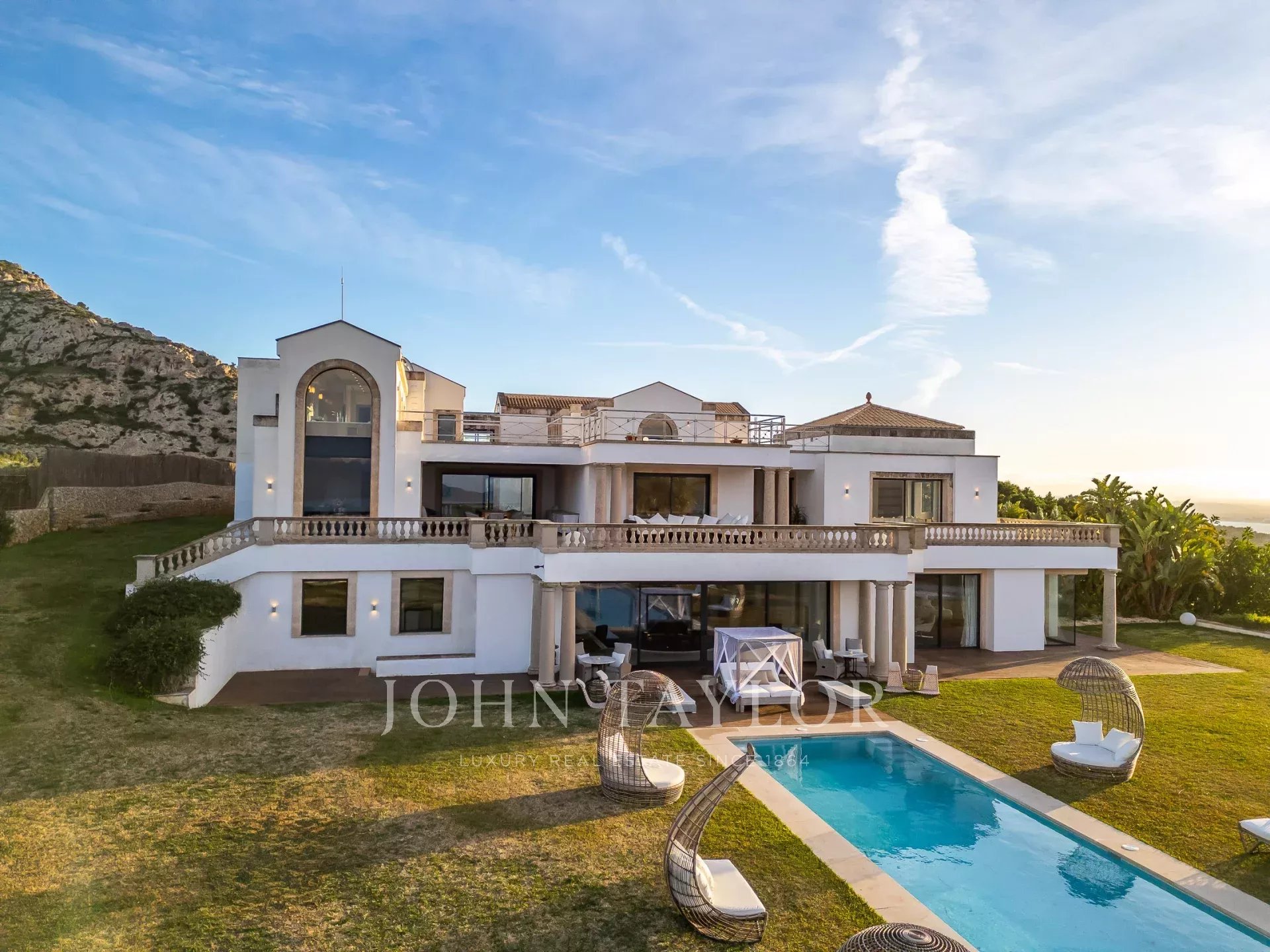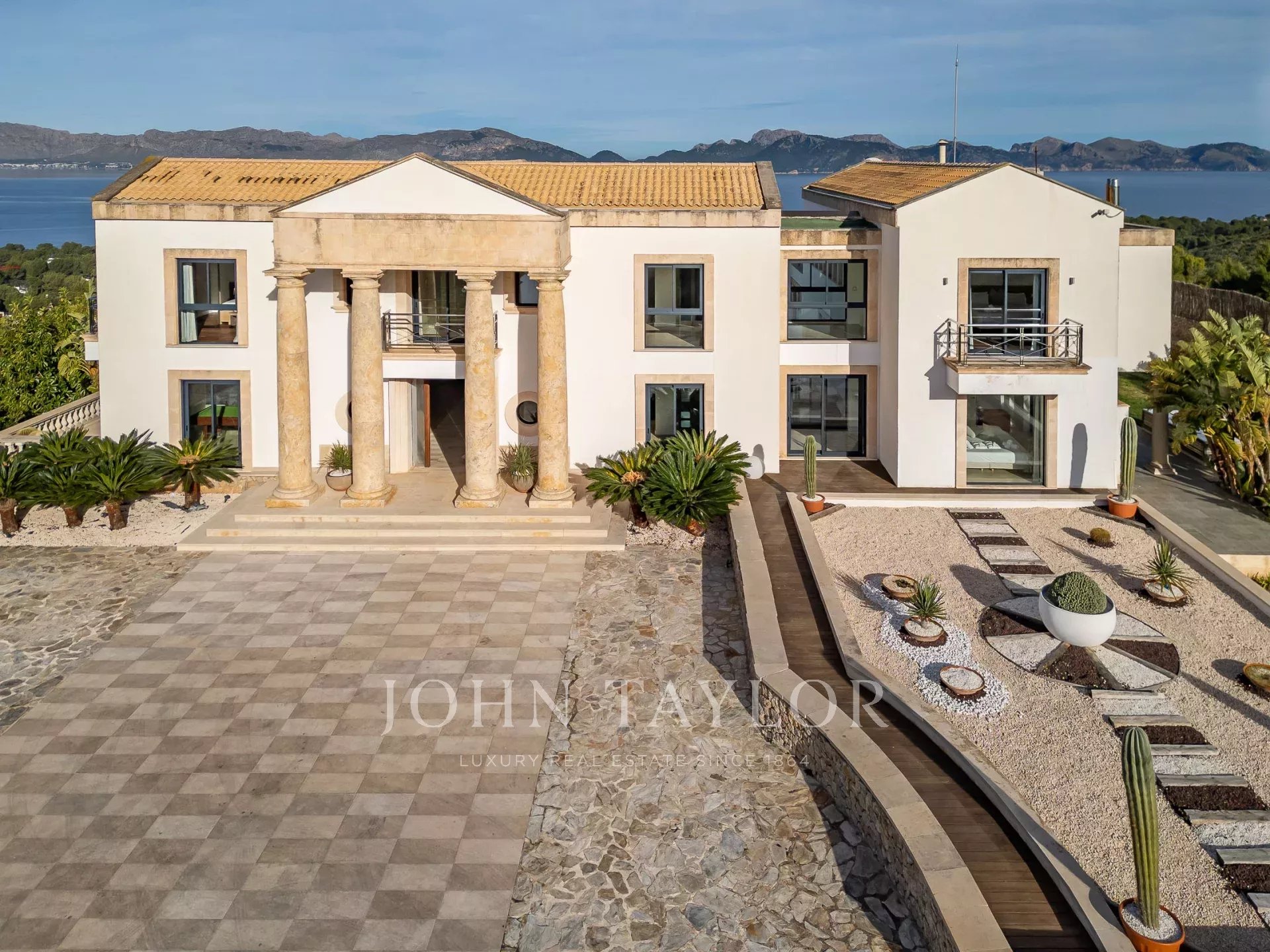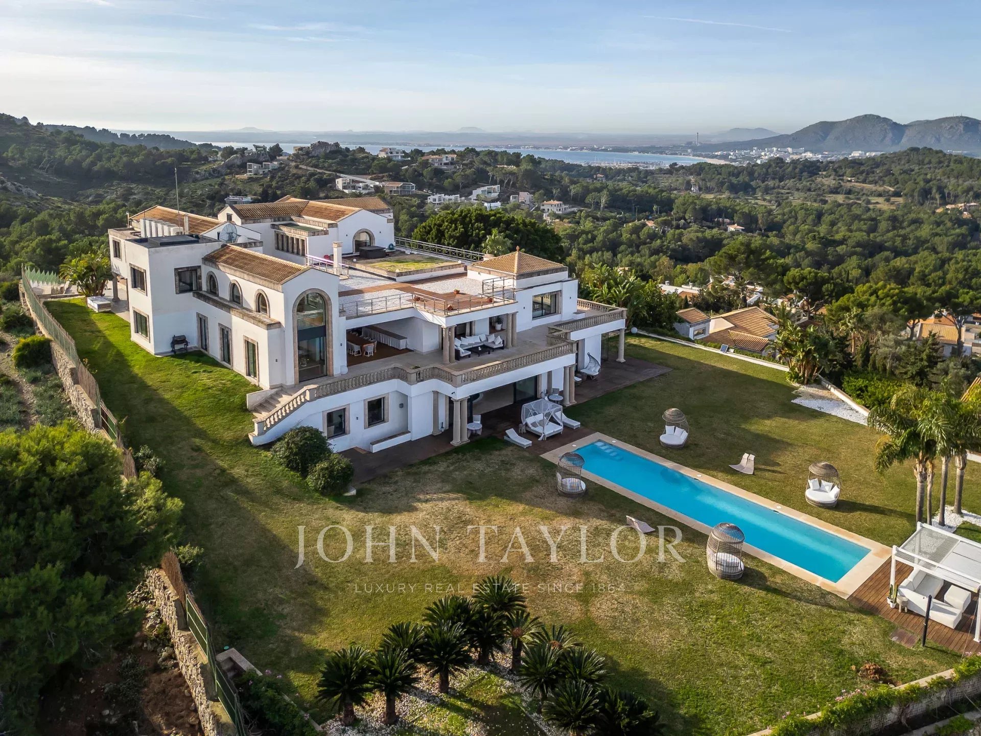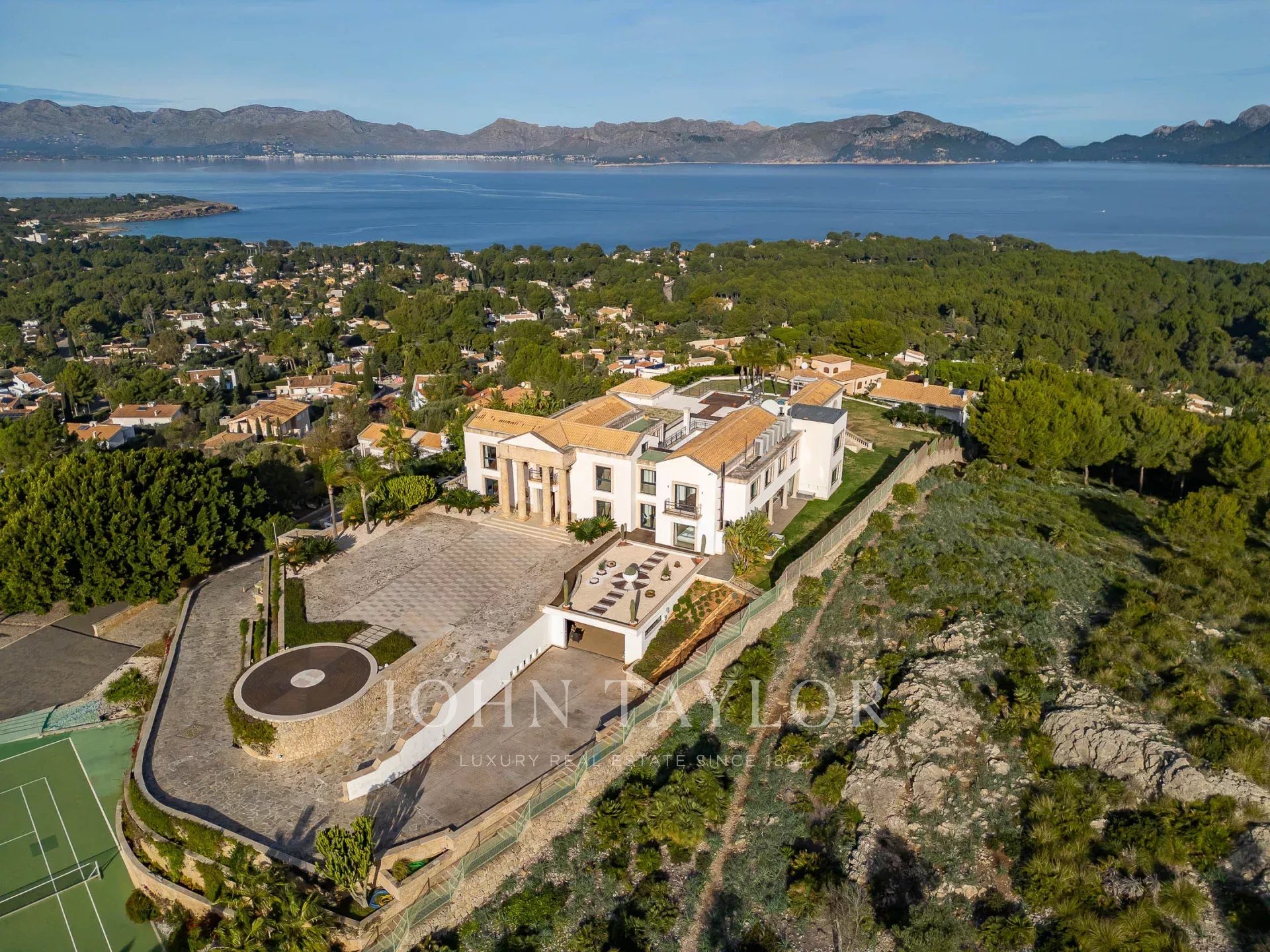 Magnificent Sea View Estate. Perched on the highest point of Mal Pas-Bonaire, Alcudia assuring the most spectacular seaviews over the bay of Pollensa this estate is truly unique and incomparable to anything in the North of Mallorca. Built to the highest specifications assuring the maximum of comfort and designed to impress, "Cielo de Bonaire" is an experience in itself. Built on three levels all connected via lift, the entry level offers an imposing entrance, games rooms, living room with cost fireplace, dining room, principal and secondary kitchens, guest bedroom with en suite bathroom and guest lavatory. The first floor includes the master suite including private living room and ensuite bathroom, two further bedrooms with ensuite bathrooms complete this area. The lower ground floor includes five bedrooms all with ensuite bathrooms, superb indoor heated pool, gym area, spa with turkish steam bath, sauna, jacuzzi and hydrotherapy shower. The exterior of the property offers an array of different areas for al fresco dining and entertaining to cater for both large or small scale groups, swimming pool, manicured mature gardens, tennis court, the "glasshouse" and heliport for direct air access to the property. The property is pefect not only for personal enjoyment but also for conventions, retreats or corporate presentations. Additional consierge services are available (subject to additional cost) such as helicopter hire, chauffeur, private chef, boat rental and babysitting to ensure a flawless experience for its guests. Local restaurants, beaches, yacht club and village are within 2kms. For golf lovers the closed course is 6km and the airport 60kms. For availability and further information please contact us directly to assist you with any information you may require.