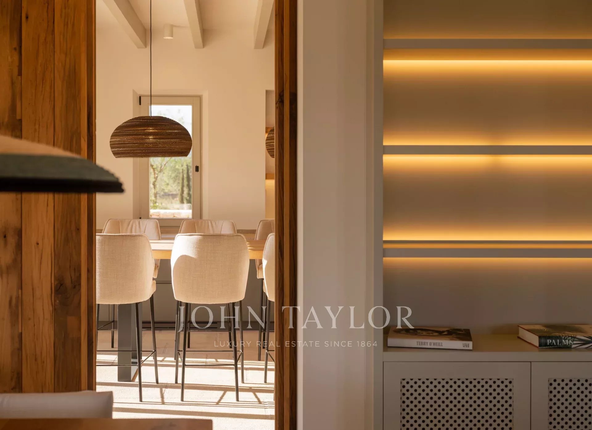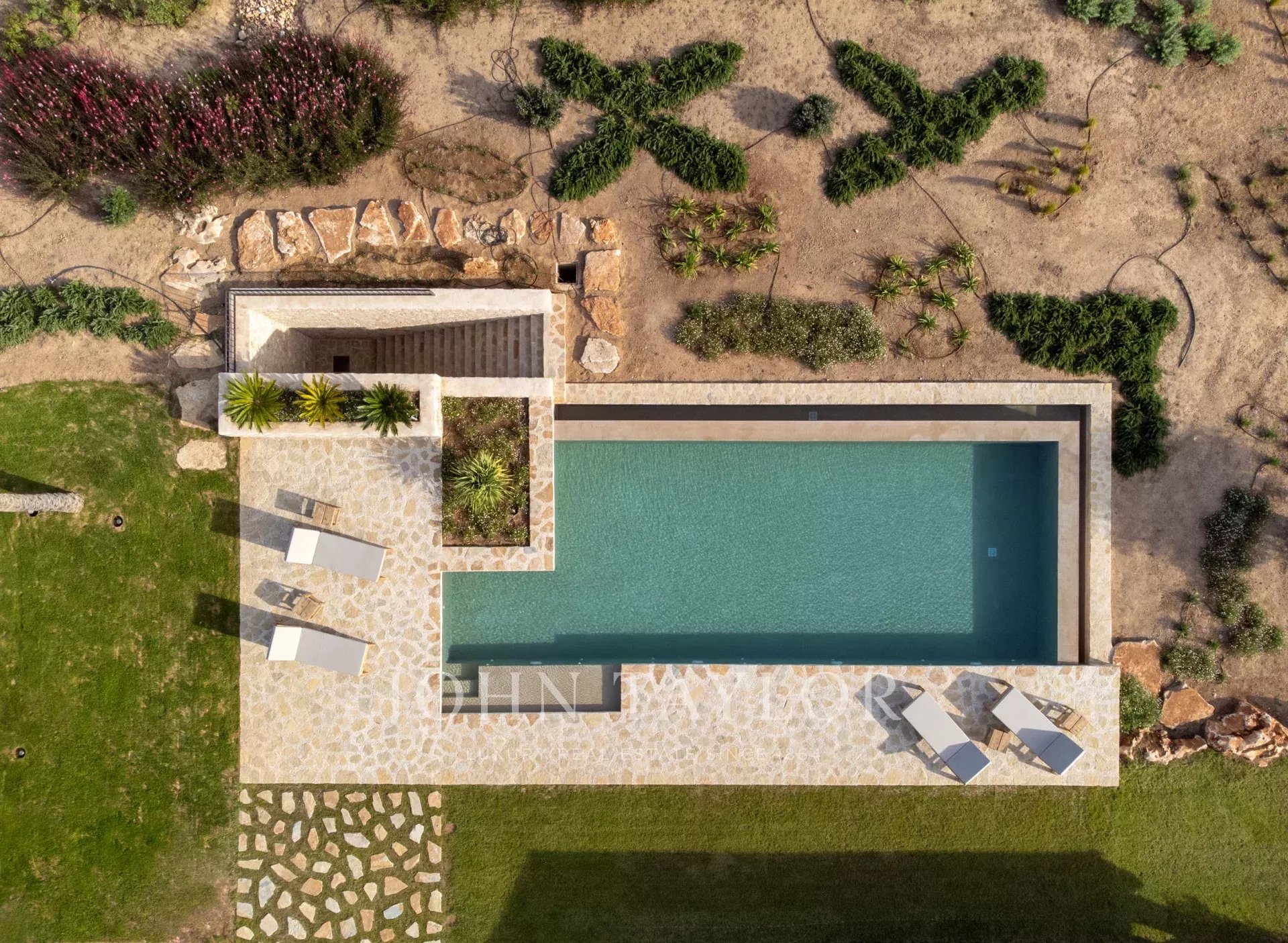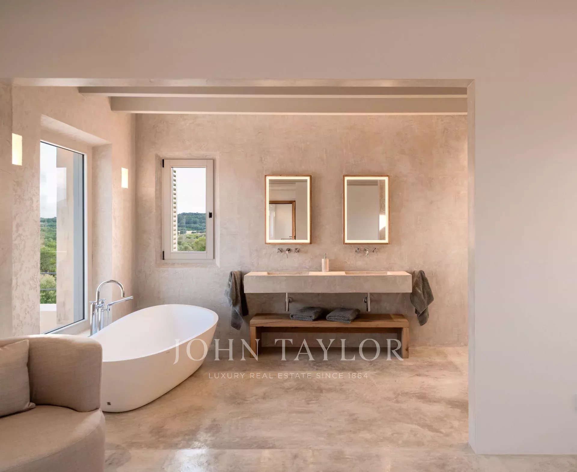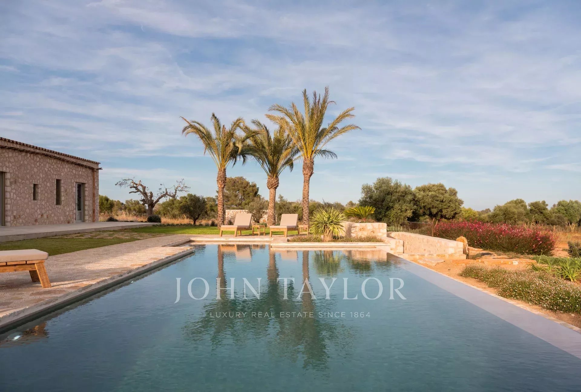 Exquisite new-build Finca with breathtaking Sea Views and Mountain Panorama Welcome to an exceptional opportunity to own a gorgeous new construction finca in the tranquil and enchanting countryside of southeast Mallorca just minutes away from the sea. Completed in 2023, this remarkable property offers an idyllic setting with mesmerizing sea views and majestic panoramic mountain views. With attention to detail and a range of first-class features, this dream finca embodies living at its finest. Set on an expansive plot of 60,000 square meters, the finca extends over a constructed living area of 580 square meters and features five spacious bedrooms, all with en suite bathrooms. Outside, you enjoy absolute privacy at the 70m2 infinity saltwater pool and plenty of comfort with an additional bathroom under the pool. As soon as you enter the house, you are welcomed by an atmosphere of warmth and tranquility. All rooms are designed with love, equipped with high quality materials and complemented by amenities such as air conditioning, Sonos music system and a Domotics system. The bathrooms are equipped with Dornbracht fixtures and reflect the commitment to exceptional quality and elegance. The kitchen is a chef's dream, with built-in appliances from the prestigious Gaggenau 400 Series, a Geberit drinking water treatment system, a state-of-the-art Bora stove, a Miele dishwasher and a wine cabinet. A separate utility room houses a Miele washer and dryer. The appeal of outdoor living is fully realized in this finca with an inviting outdoor kitchen for al fresco dining and entertaining. To keep you comfortable in all seasons, the house is equipped with underfloor heating that provides a cozy warmth in all living spaces. In addition, a state-of-the-art photovoltaic system combined with a battery storage system ensures efficient energy use. Do not miss the opportunity to call this exceptional finca your own. Contact us now to arrange a viewing appointment.