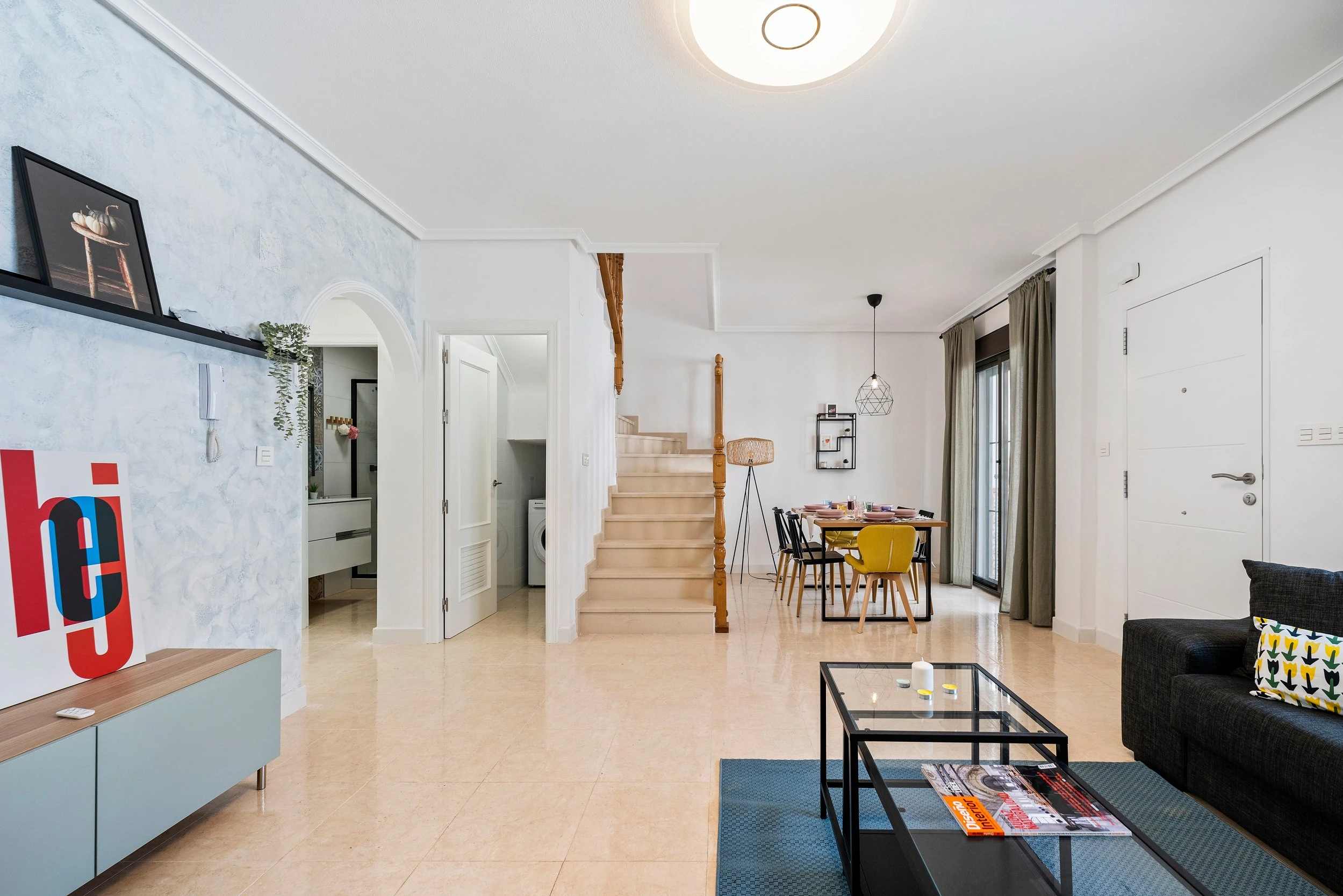 Modern Renovated Townhouse for Sale in Mirador de San Miguel, Costa Blanca SouthDiscover this beautifully renovated two-story townhouse located in the quiet and sought-after urbanization of Mirador de San Miguel, just a short drive from Torrevieja and the Mediterranean beaches.This charming townhouse offers the perfect blend of modern comfort and Mediterranean lifestyle. With 3 spacious bedrooms and 3 bathrooms (two of them en-suite), the property provides both privacy and functionality for families or those looking for a peaceful retreat in the Costa Blanca South.On the ground floor, you’ll find a bright and spacious living room, a fully equipped kitchen, one bedroom with direct access to the rear porch, a bathroom, and a separate laundry room.The upper floor includes two additional bedrooms, each with an en-suite bathroom, and access to a large roof terrace — ideal for sunbathing or enjoying a relaxing evening drink.The exterior features an 82m² front garden, a private underground parking space, and a storage room. The residential complex also includes a large communal swimming pool, perfect for enjoying the warm Mediterranean climate.Located just 15 minutes from the beach and only 5 minutes from local shops, restaurants, and bars, this property offers a perfect combination of tranquility and convenience. It’s also close to several renowned golf courses, making it an excellent choice for golf lovers and anyone seeking a holiday home or permanent residence in Spain.Key FeaturesFully renovated and sold furnished3 bedrooms, 3 bathrooms (2 en-suite)Large roof terrace and sunny private gardenCommunal swimming poolUnderground parking & storage roomPeaceful residential area near San Miguel de SalinasOnly 15 minutes from the beaches of Torrevieja and Orihuela CostaDon’t miss the opportunity to buy this stunning modern townhouse in Costa Blanca South — ready to move in and enjoy the Mediterranean lifestyle!