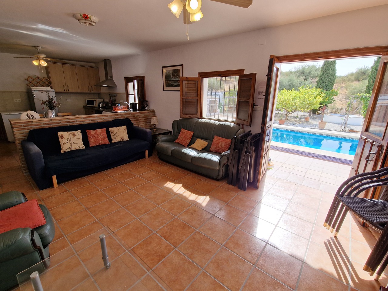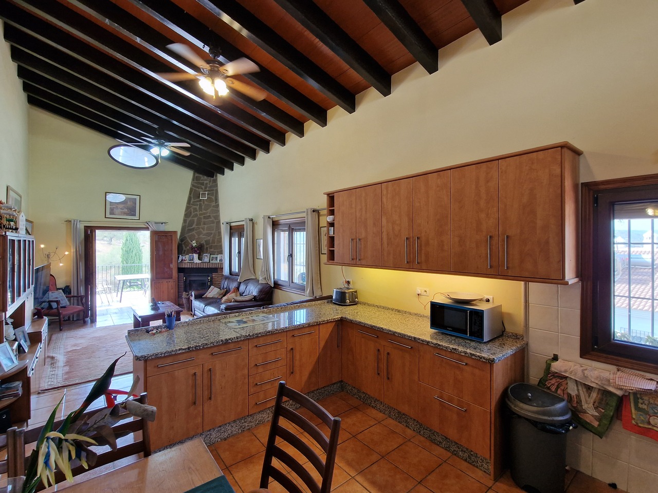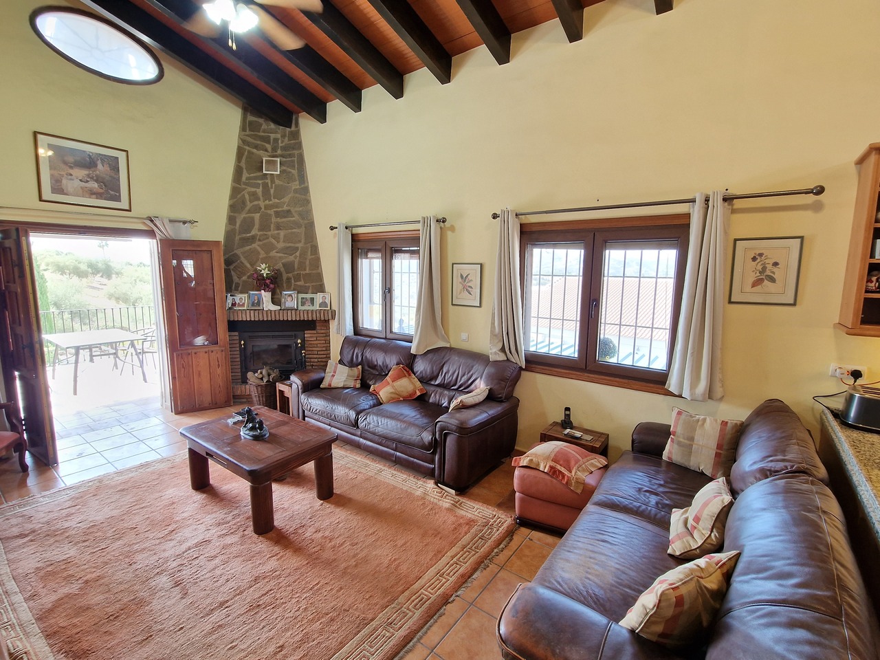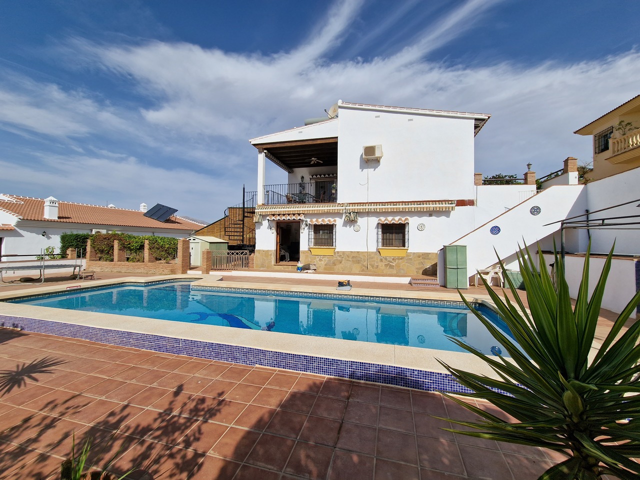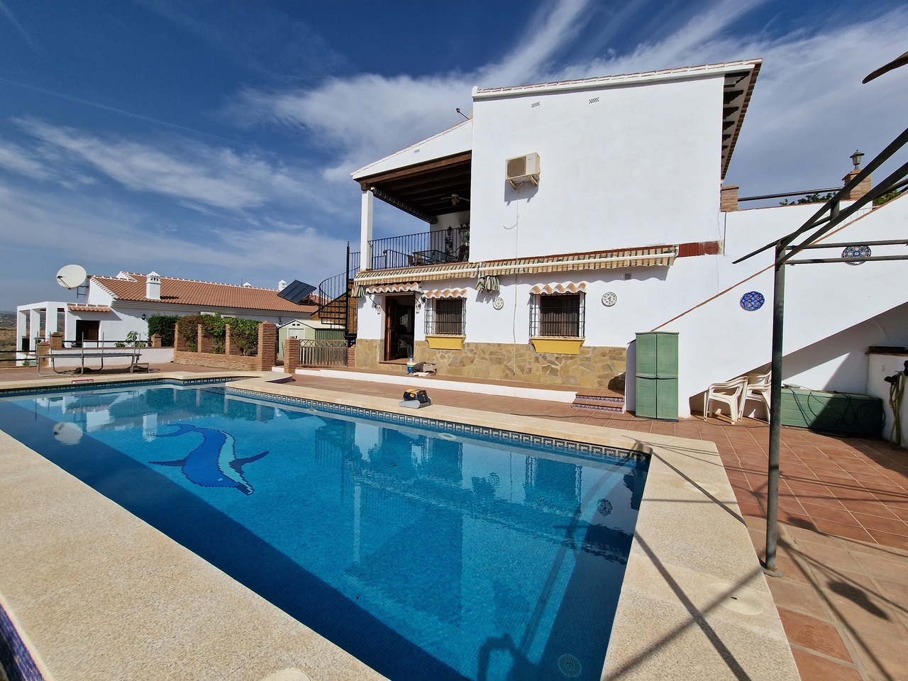 Cortijo Linea sits at the top of a small urbanisation, within walking distance to the local village of Vinuela with all of its shops, bars and amenities. The plot is walled and gated at the front and there is off road parking for several cars, a double car port and a garage. The plot is made up of terraces, seating areas, a fully irrigated garden area and a large 15m pool with roman steps and a pool side shower. The house comprises of a small entrance porch that leads into a large open plan kitchen/lounge area with a vaulted and beamed ceiling. The kitchen has plenty of units and a granite worktop and the lounge has AC, ceiling fans and a double wooden door out onto a terrace. There are 3 double size bedrooms on this upper level with fans and AC units. The master bedroom has an en suite shower room and also a walk in wardrobe. On the lower level there is a separate living area with a kitchen, lounge, 2 double size bedrooms and 1 bathroom and 1 shower room. Cortijo Linea would be perfect for somebody looking for a large property with separate living area and close to amenities.