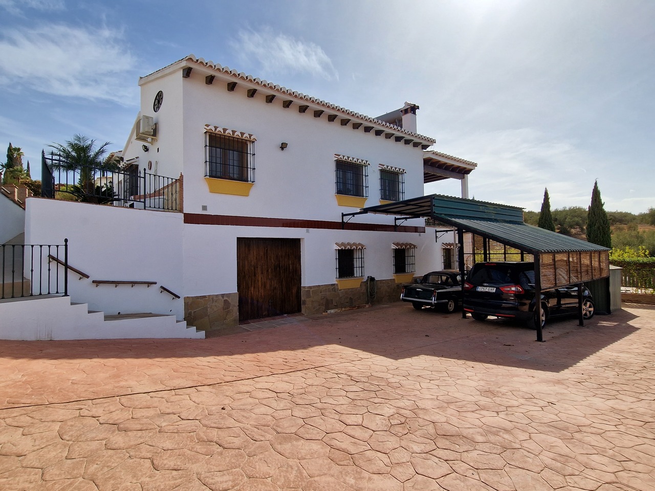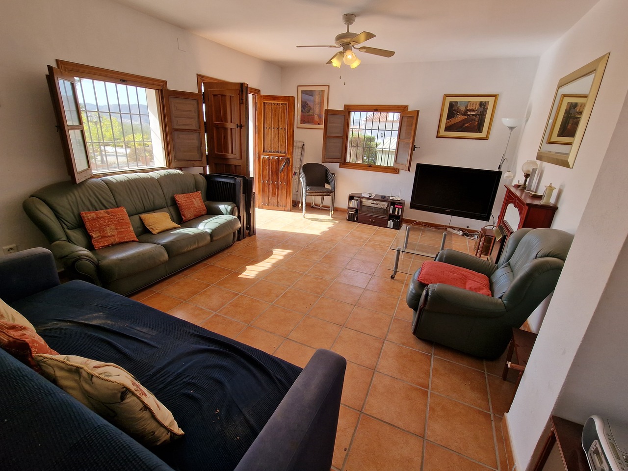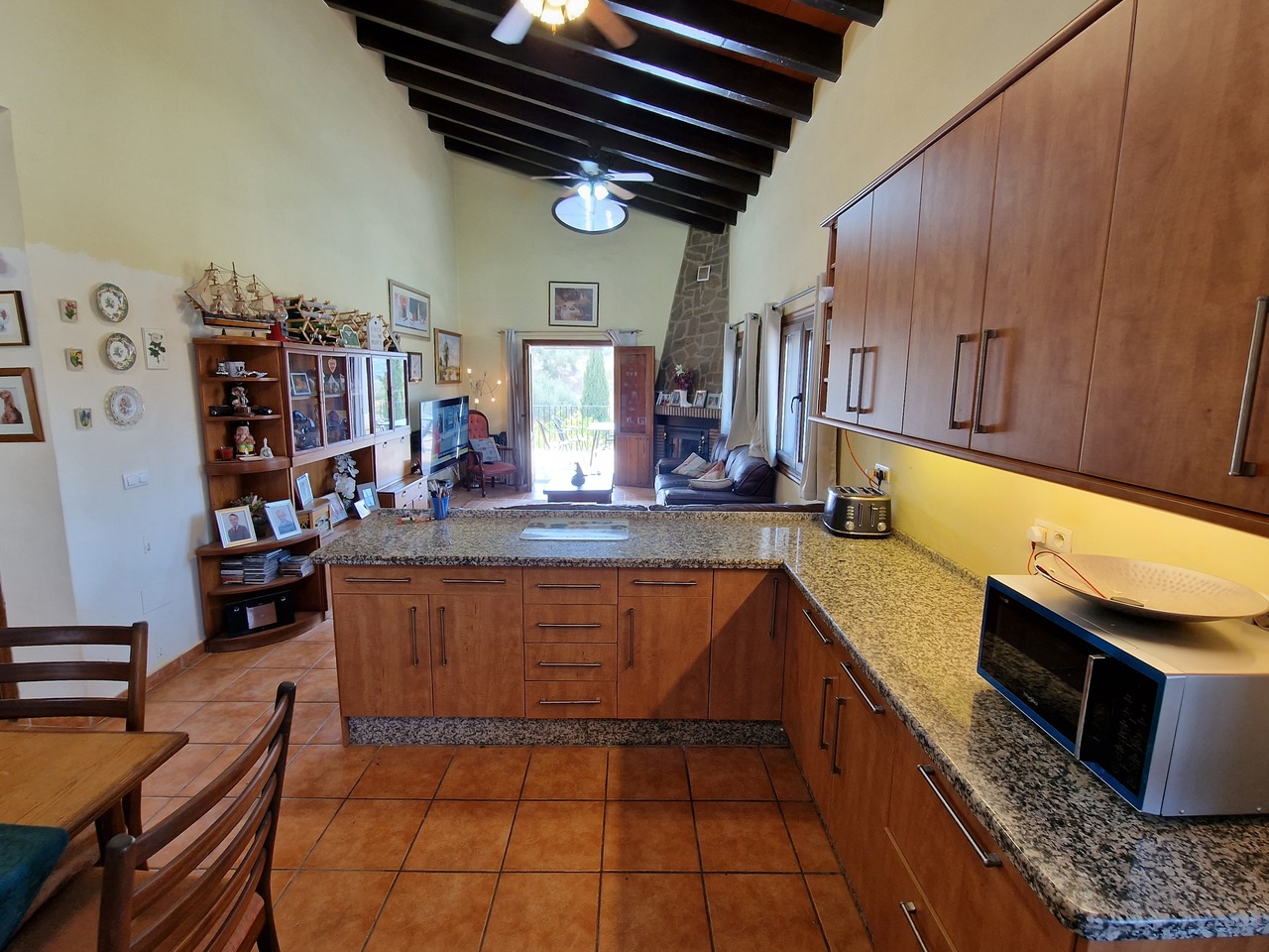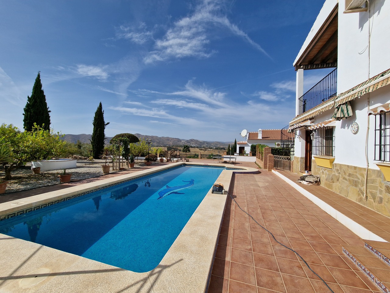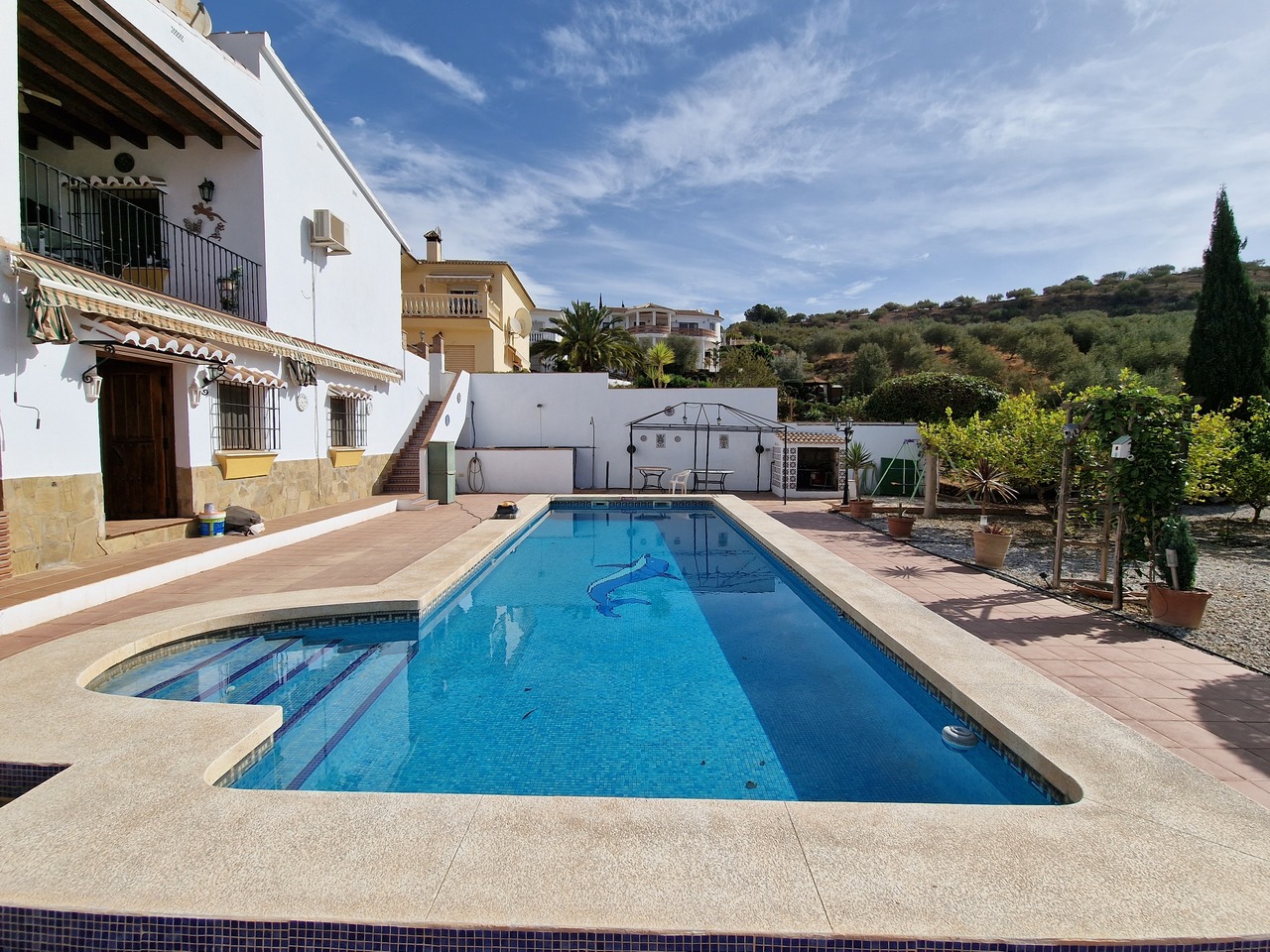 Cortijo Linea sits at the top of a small urbanisation, within walking distance to the local village of Vinuela with all of its shops, bars and amenities. The plot is walled and gated at the front and there is off road parking for several cars, a double car port and a garage. The plot is made up of terraces, seating areas, a fully irrigated garden area and a large 15m pool with roman steps and a pool side shower. The house comprises of a small entrance porch that leads into a large open plan kitchen/lounge area with a vaulted and beamed ceiling. The kitchen has plenty of units and a granite worktop and the lounge has AC, ceiling fans and a double wooden door out onto a terrace. There are 3 double size bedrooms on this upper level with fans and AC units. The master bedroom has an en suite shower room and also a walk in wardrobe. On the lower level there is a separate living area with a kitchen, lounge, 2 double size bedrooms and 1 bathroom and 1 shower room. Cortijo Linea would be perfect for somebody looking for a large property with separate living area and close to amenities.