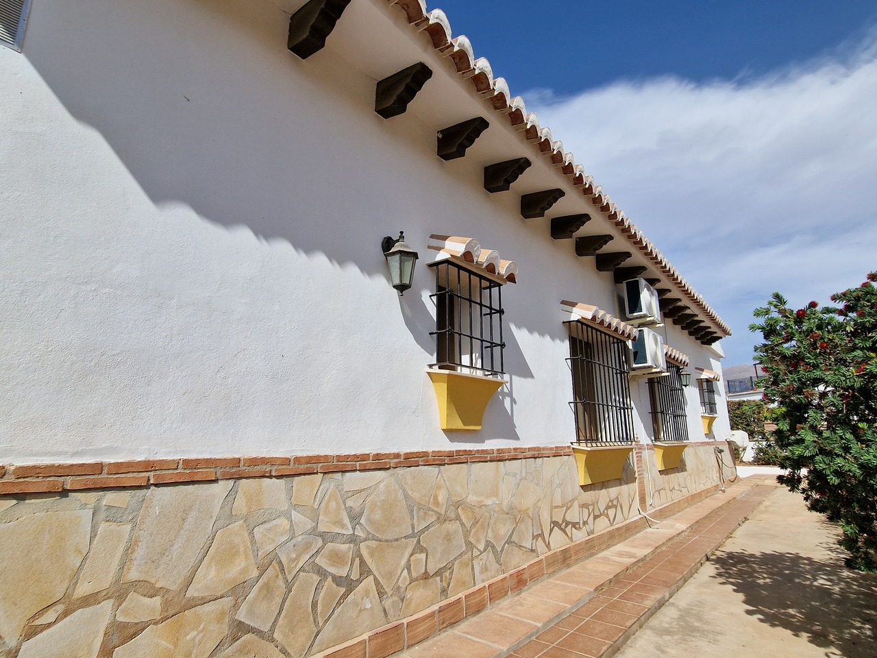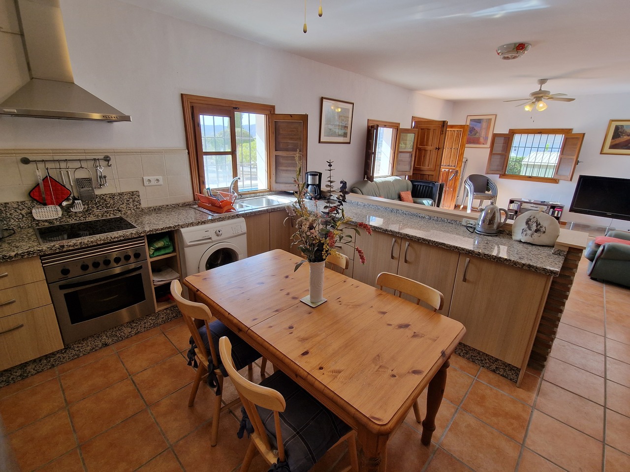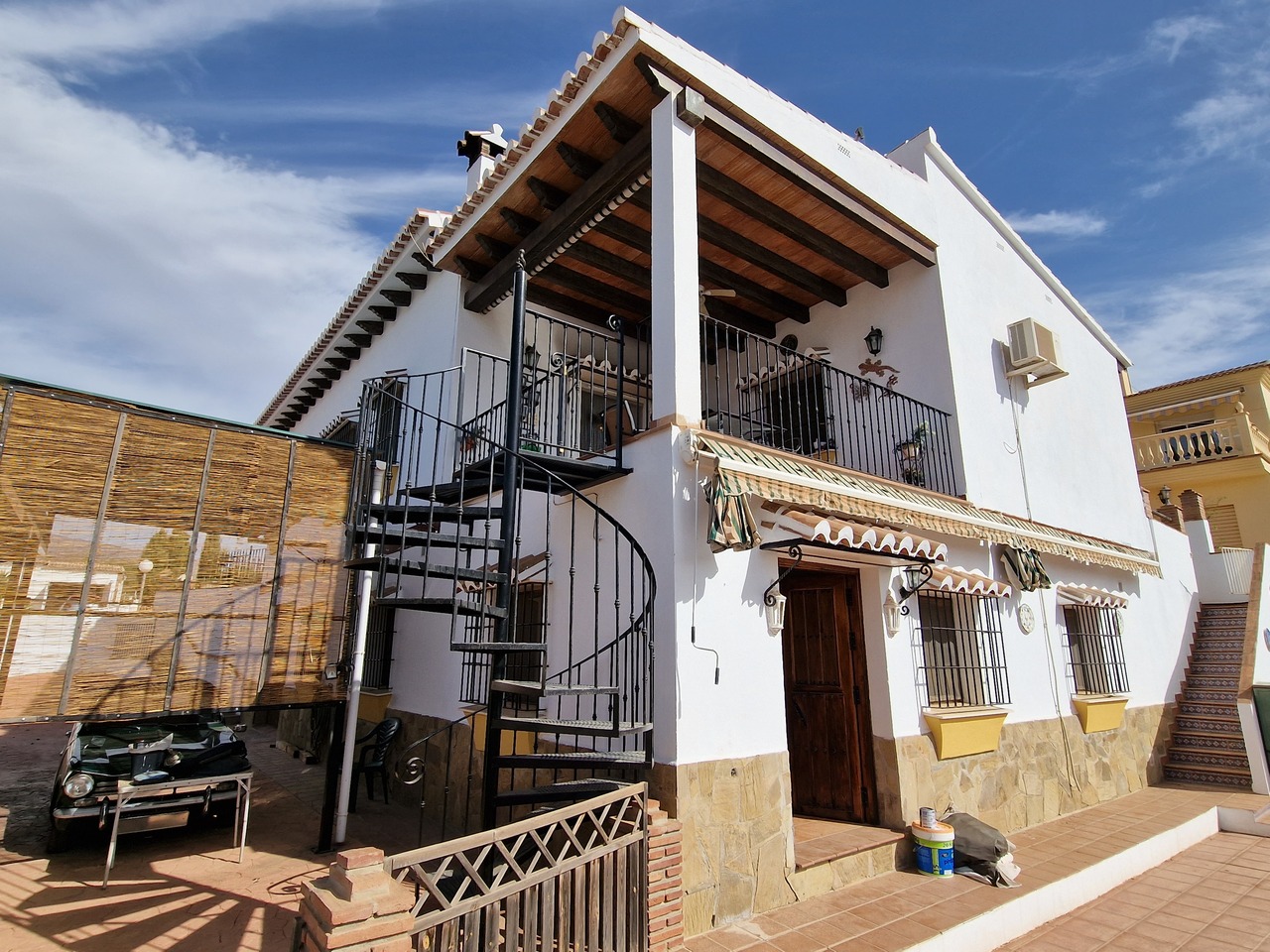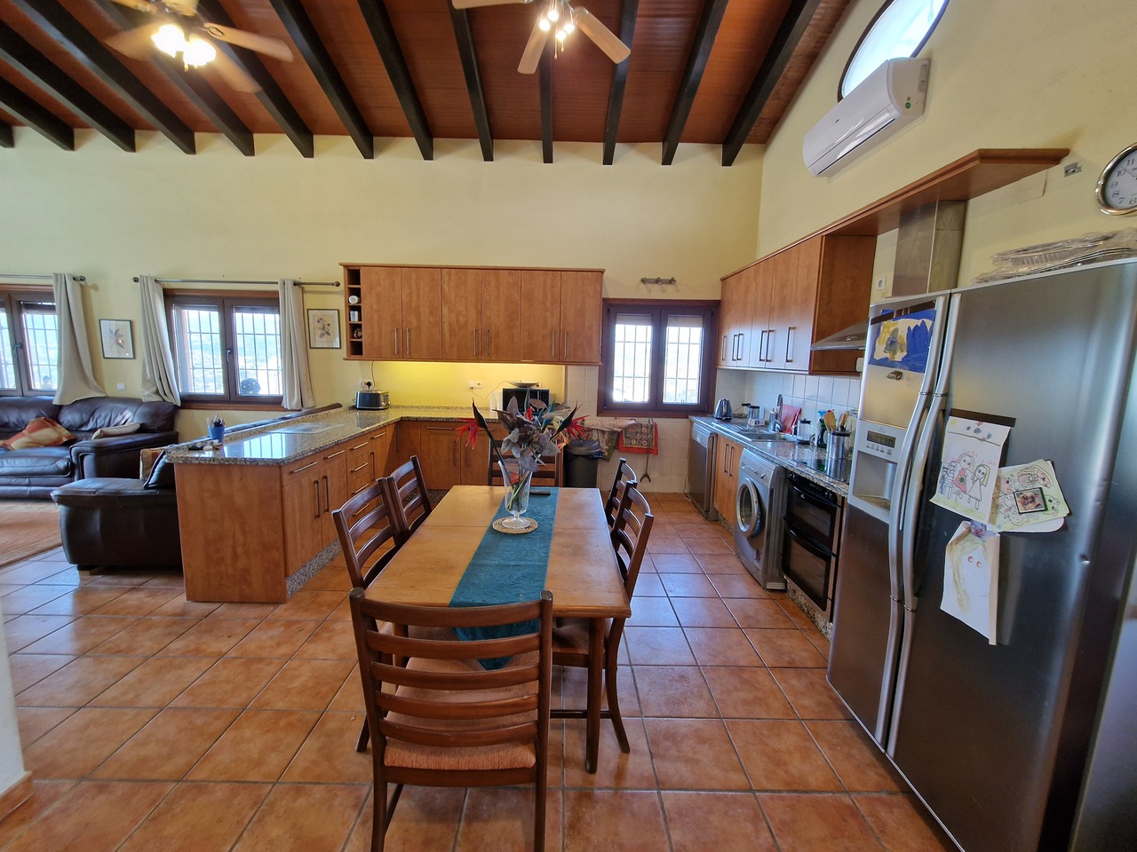 Cortijo Linea sits at the top of a small urbanisation, within walking distance to the local village of Vinuela with all of its shops, bars and amenities. The plot is walled and gated at the front and there is off road parking for several cars, a double car port and a garage. The plot is made up of terraces, seating areas, a fully irrigated garden area and a large 15m pool with roman steps and a pool side shower. The house comprises of a small entrance porch that leads into a large open plan kitchen/lounge area with a vaulted and beamed ceiling. The kitchen has plenty of units and a granite worktop and the lounge has AC, ceiling fans and a double wooden door out onto a terrace. There are 3 double size bedrooms on this upper level with fans and AC units. The master bedroom has an en suite shower room and also a walk in wardrobe. On the lower level there is a separate living area with a kitchen, lounge, 2 double size bedrooms and 1 bathroom and 1 shower room. Cortijo Linea would be perfect for somebody looking for a large property with separate living area and close to amenities.