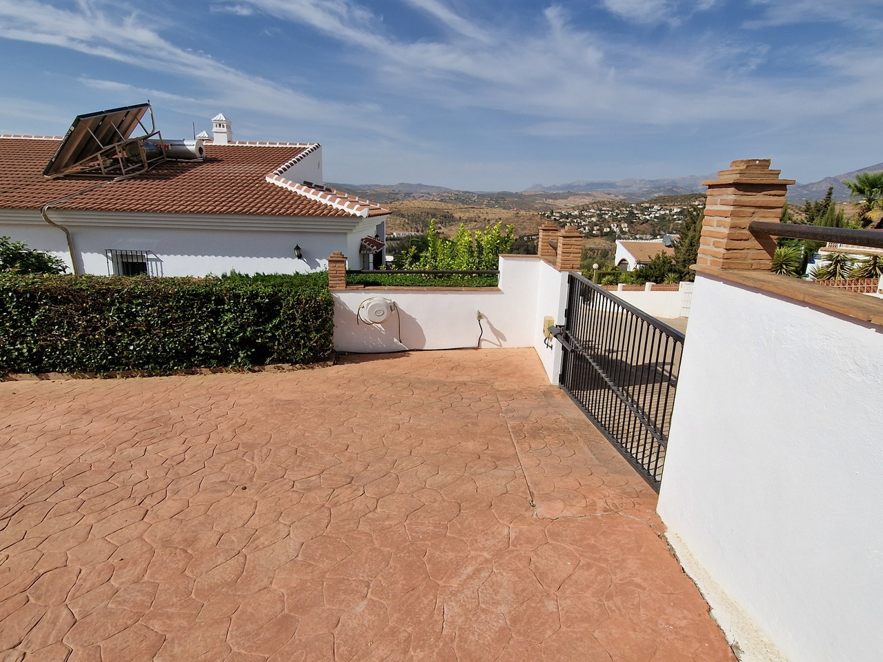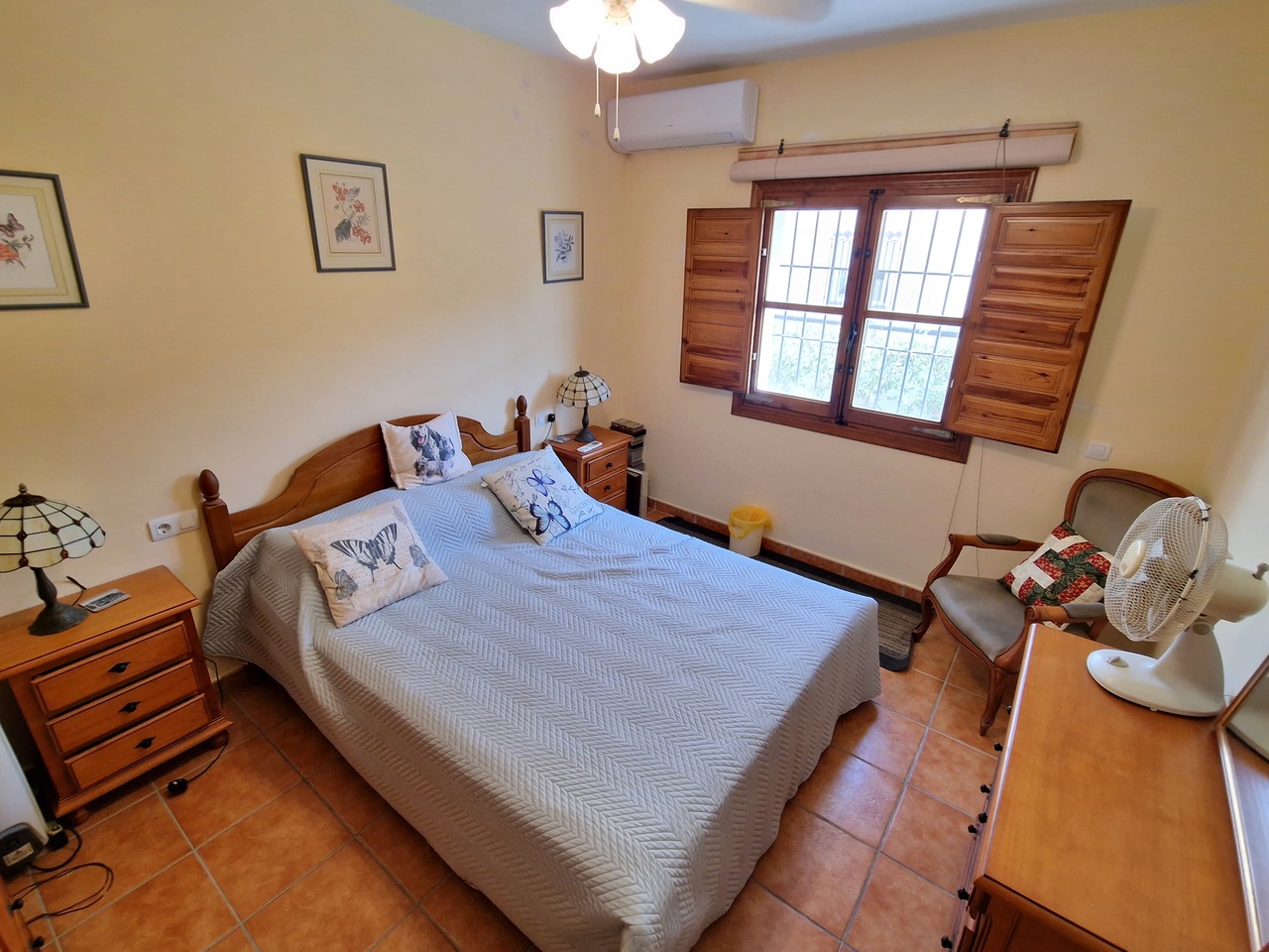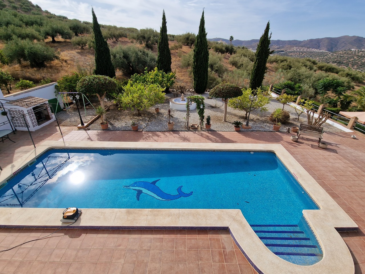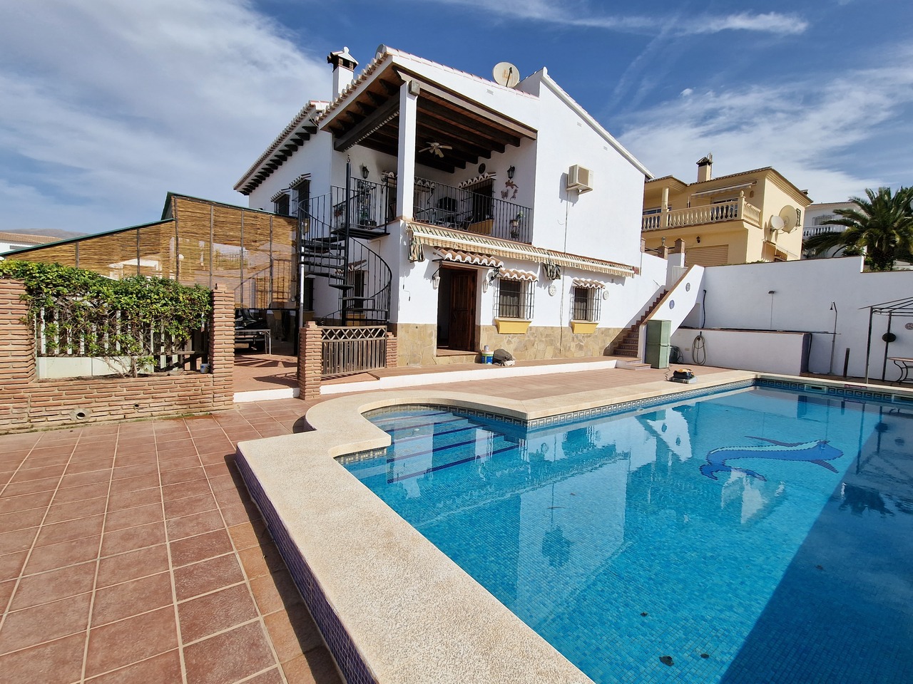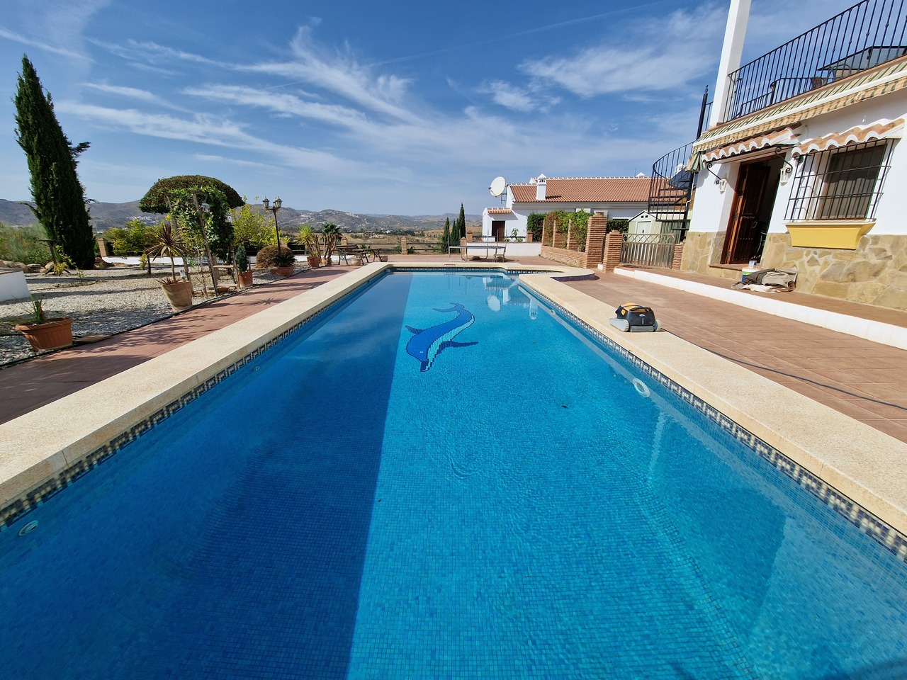 Cortijo Linea sits at the top of a small urbanisation, within walking distance to the local village of Vinuela with all of its shops, bars and amenities. The plot is walled and gated at the front and there is off road parking for several cars, a double car port and a garage. The plot is made up of terraces, seating areas, a fully irrigated garden area and a large 15m pool with roman steps and a pool side shower. The house comprises of a small entrance porch that leads into a large open plan kitchen/lounge area with a vaulted and beamed ceiling. The kitchen has plenty of units and a granite worktop and the lounge has AC, ceiling fans and a double wooden door out onto a terrace. There are 3 double size bedrooms on this upper level with fans and AC units. The master bedroom has an en suite shower room and also a walk in wardrobe. On the lower level there is a separate living area with a kitchen, lounge, 2 double size bedrooms and 1 bathroom and 1 shower room. Cortijo Linea would be perfect for somebody looking for a large property with separate living area and close to amenities.