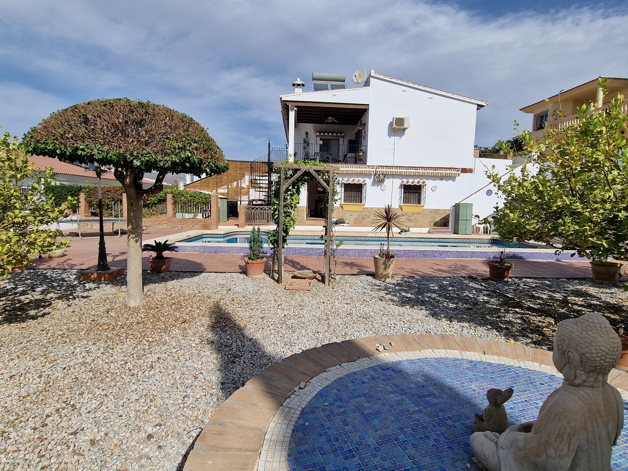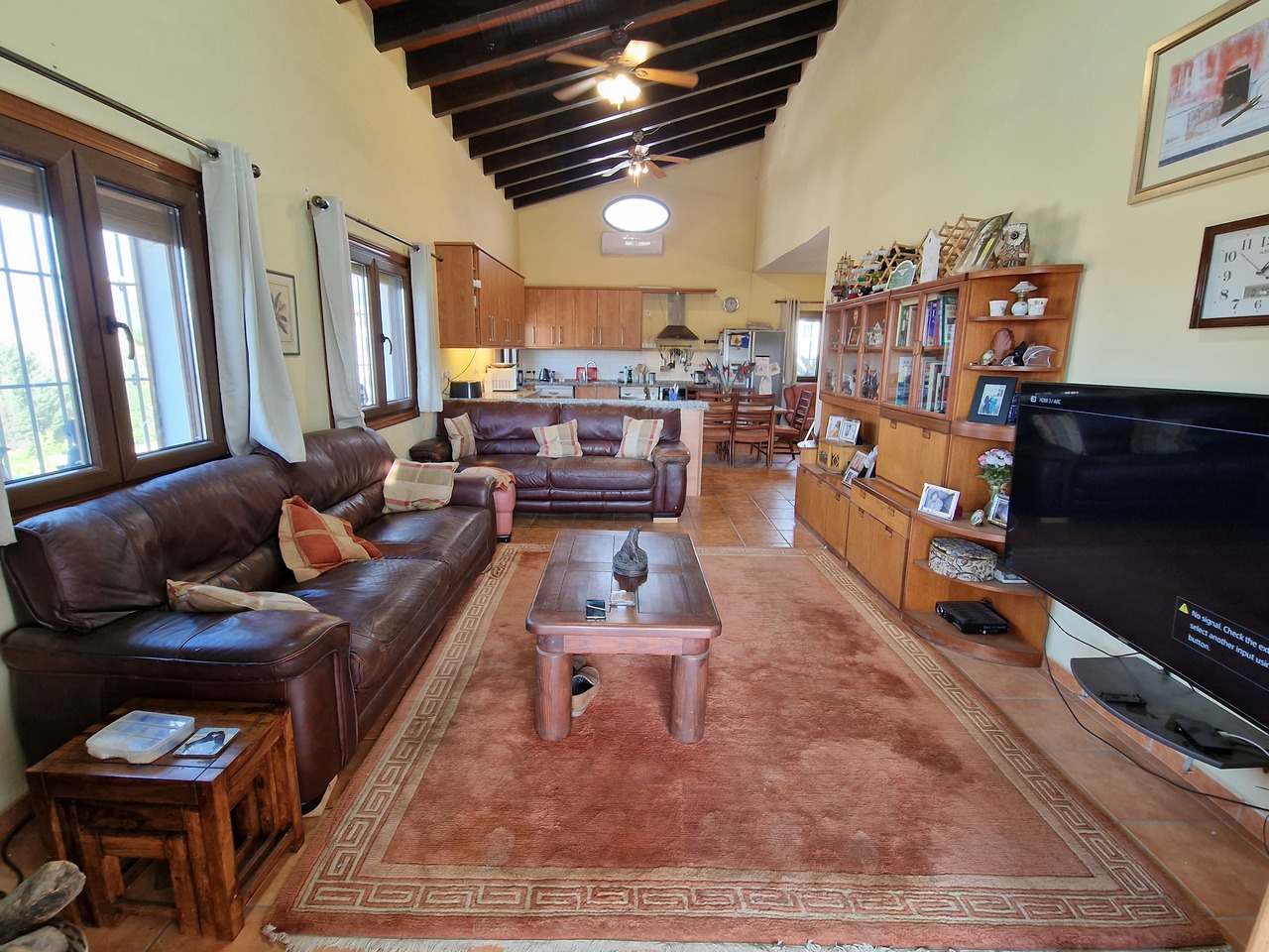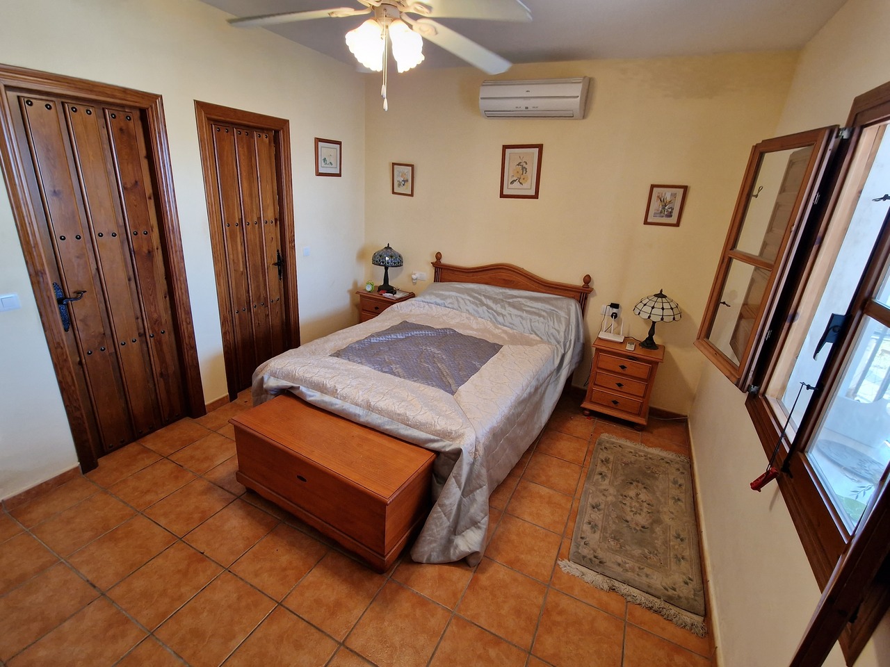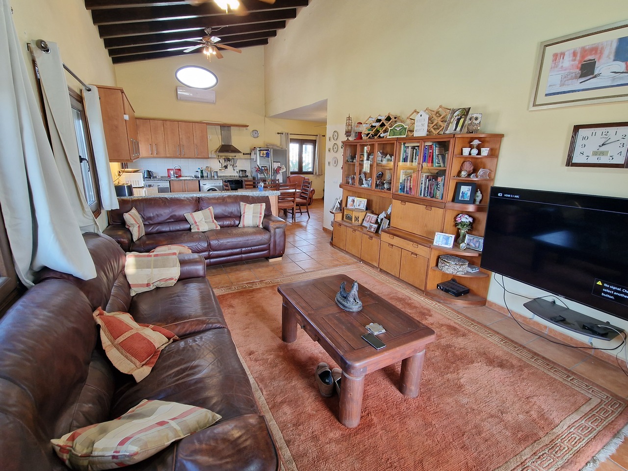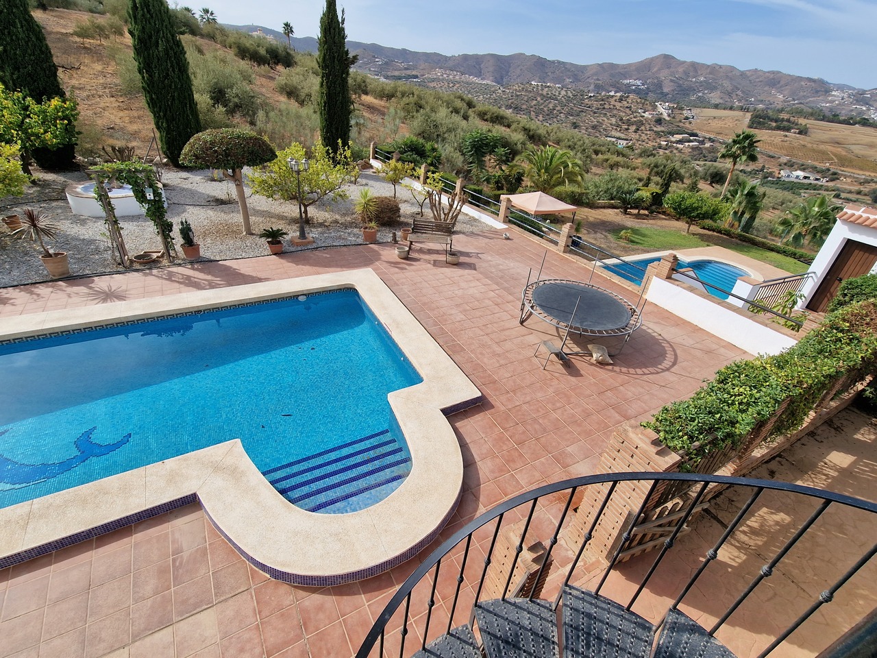 Cortijo Linea sits at the top of a small urbanisation, within walking distance to the local village of Vinuela with all of its shops, bars and amenities. The plot is walled and gated at the front and there is off road parking for several cars, a double car port and a garage. The plot is made up of terraces, seating areas, a fully irrigated garden area and a large 15m pool with roman steps and a pool side shower. The house comprises of a small entrance porch that leads into a large open plan kitchen/lounge area with a vaulted and beamed ceiling. The kitchen has plenty of units and a granite worktop and the lounge has AC, ceiling fans and a double wooden door out onto a terrace. There are 3 double size bedrooms on this upper level with fans and AC units. The master bedroom has an en suite shower room and also a walk in wardrobe. On the lower level there is a separate living area with a kitchen, lounge, 2 double size bedrooms and 1 bathroom and 1 shower room. Cortijo Linea would be perfect for somebody looking for a large property with separate living area and close to amenities.