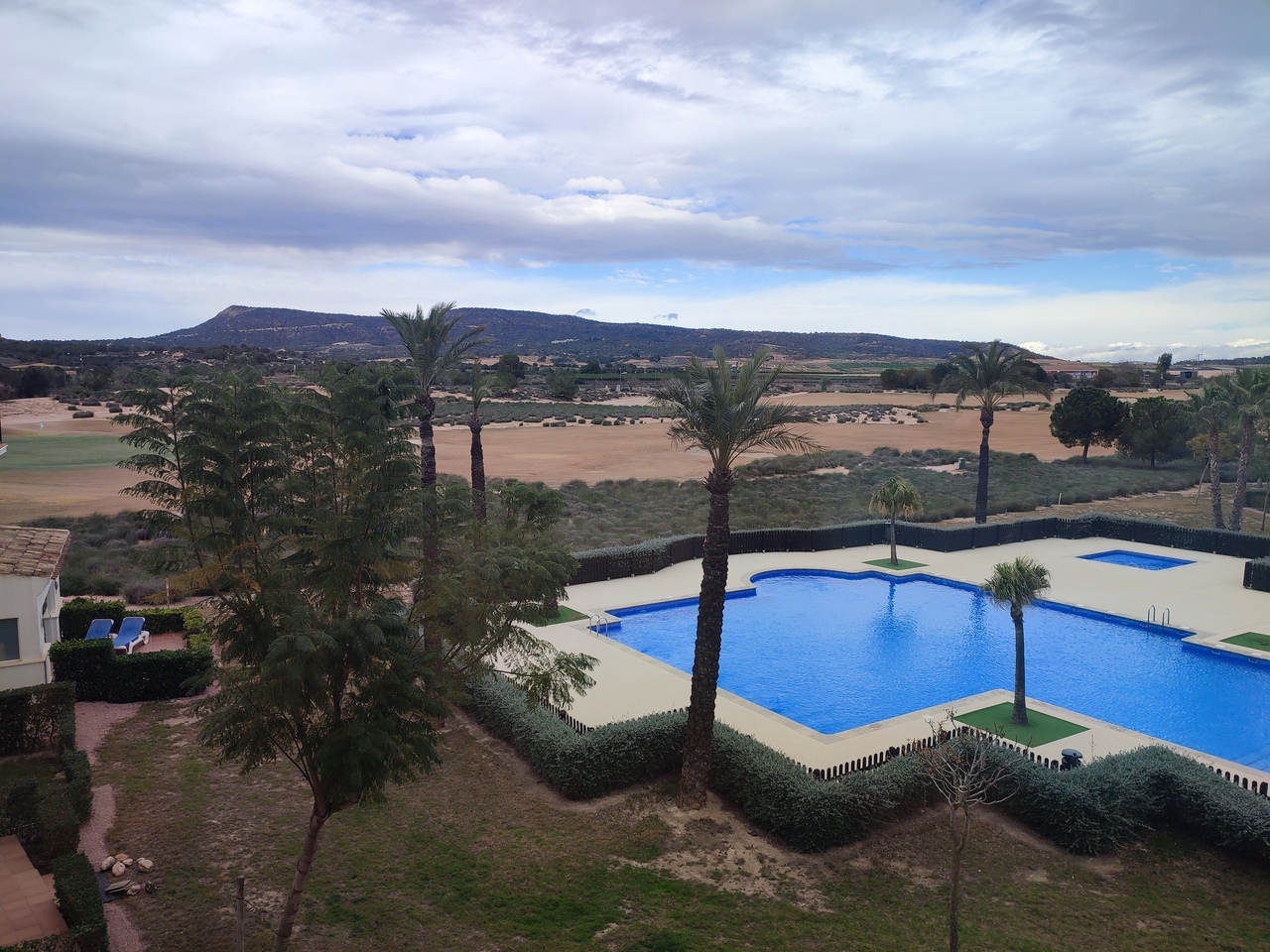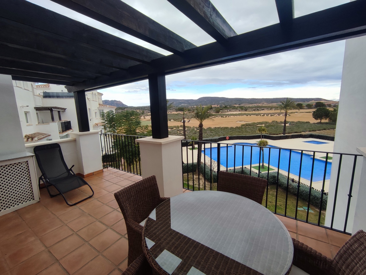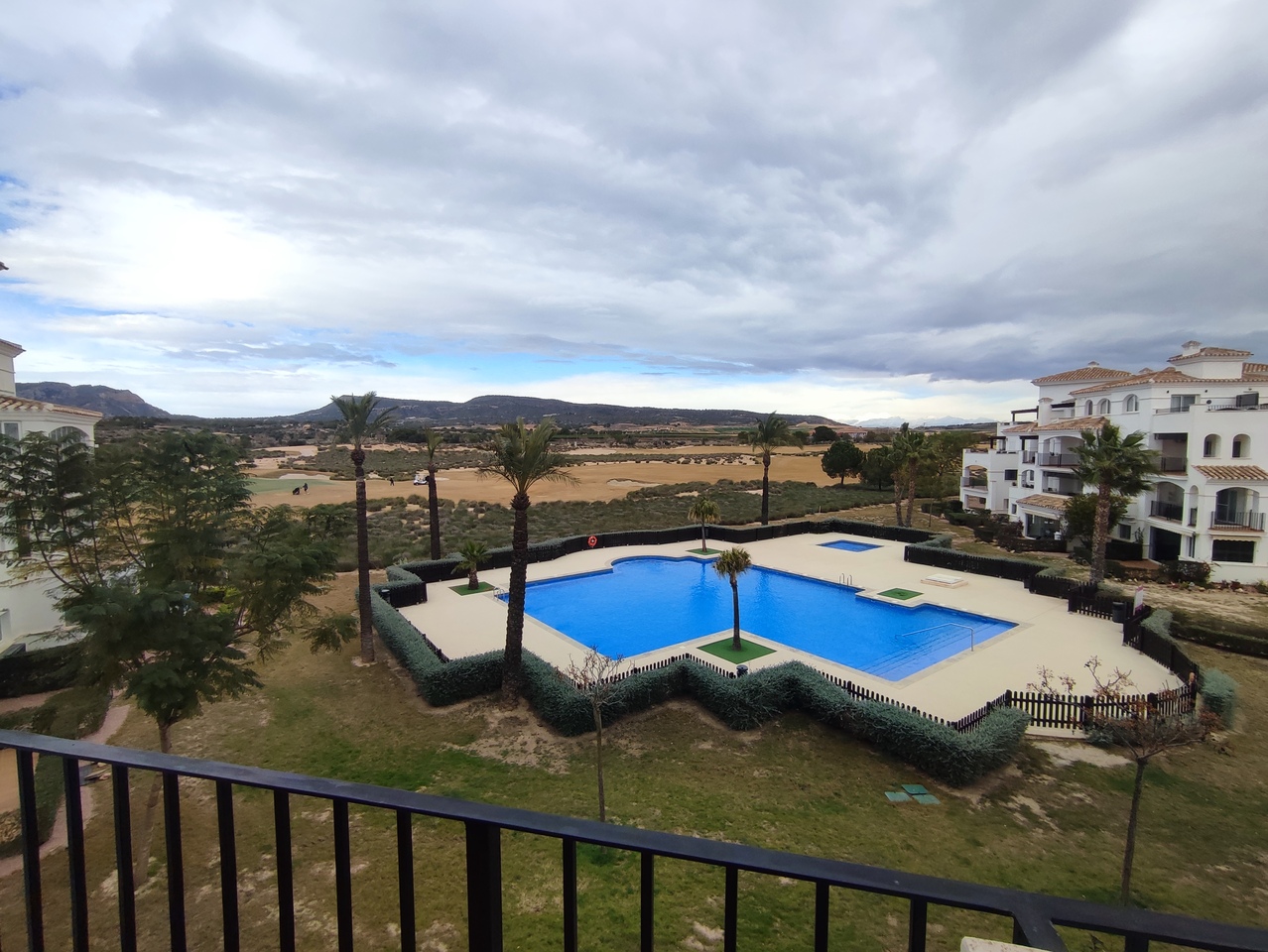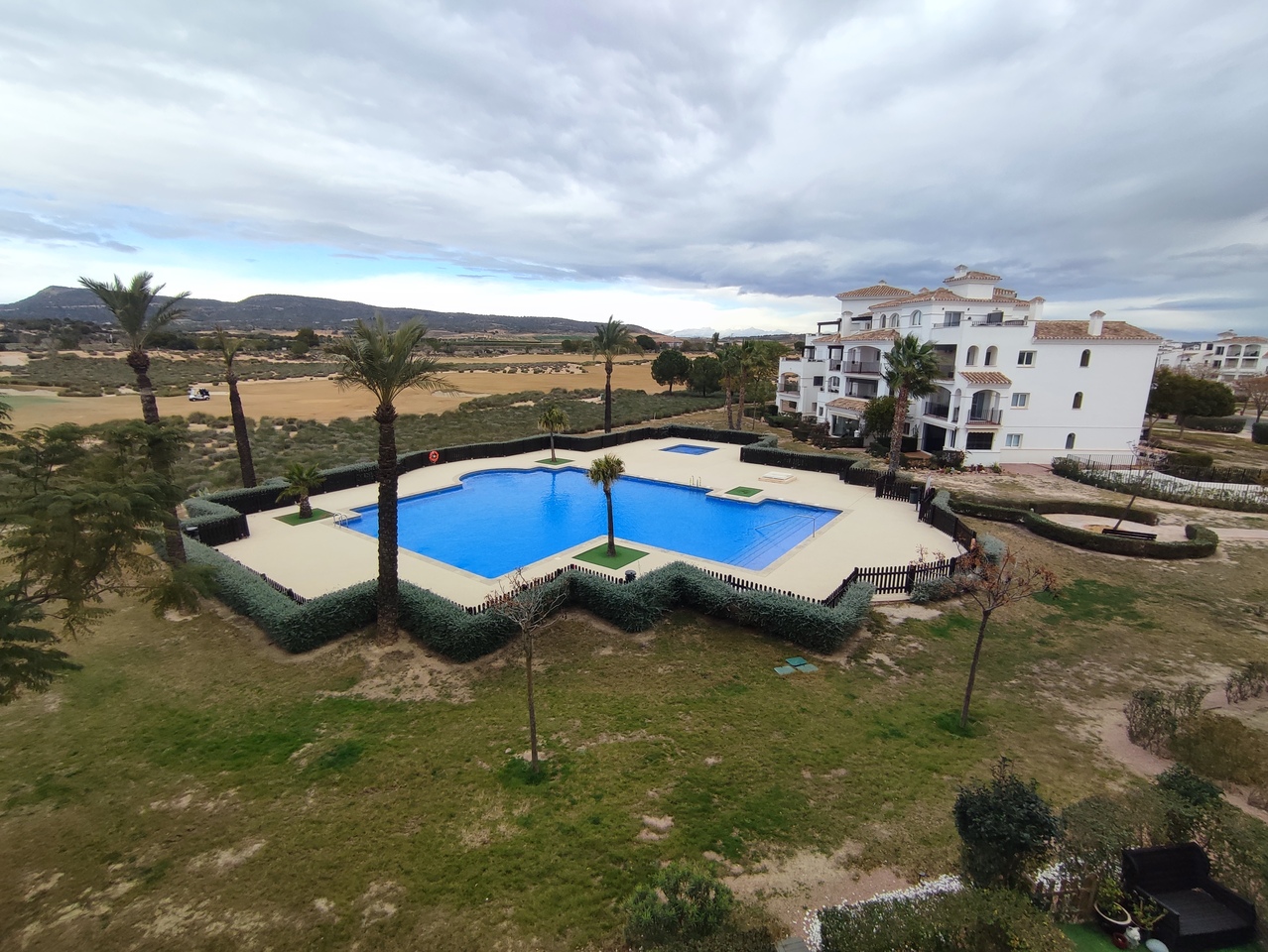 This curved wall design apartment is located on the second floor and has great views of the pool, golf and mountains. It has the larger design of kitchen which can be renovated into open plan. For examples please look on our website, click information tab and choose "renovation-ideas"  This apartment is very close to the resort centre with restaurant, bar and coffee shop. It is being sold fully furnished and includes a car in the price.The first thing that impresses you about Hacienda Riquelme Golf Resort is the wide-open spaces, the extensive gardens and the low-density construction, which create a relaxing environment to enjoy a very safe and peaceful life or holiday. The apartments are set out spaciously around the magnificent and challenging 18 hole golf course part of the Jack Nicklaus Golf Trail.All apartments have unlimited internet, air-conditioning for summer and heating for winter, private underground parking space and a communal lift.In the heart of the resort you will find the beautiful renovated Hacienda where you will find a supermarket, clubhouse, restaurant and bar. The inner court yard becomes the hive of entertainment in the Summer, whilst the large terrace set in the stunning gardens is open all year for “al fesco” dining and drinking.Facilities:Gated Community.24 hour security."El Cason" Bar, Restaurant, Clubhouse. "Sips" Coffee ShopSupermarket.Summer Entertainment.19 large community swimming pools.Communal gardens.Trees, 5 lakes.Wild flowers & local wildlife.Driving range & Golf ShopTennis courts.Paddle tennis courts.Football / Basketball court.Outside gym area.Children's play areas.Hacienda Riquelme is very well connected by the main motorways. Murcia Airport (20 mins)Mar Menor beaches (15 mins)Mediterranean beaches (20 mins)For those who like historical buildings, architecture or a desire to shop, the lovely cities of Murcia and Cartagena provide plenty of entertainment. Murcia (30 mins)Cartagena (45 mins) Murcia Airport (20 mins)Near to the bustling popular village of Sucina with shops, restaurants, bars, chemist, supermarket and lots more (5 minutes)For more information on the apartments available please contact us.