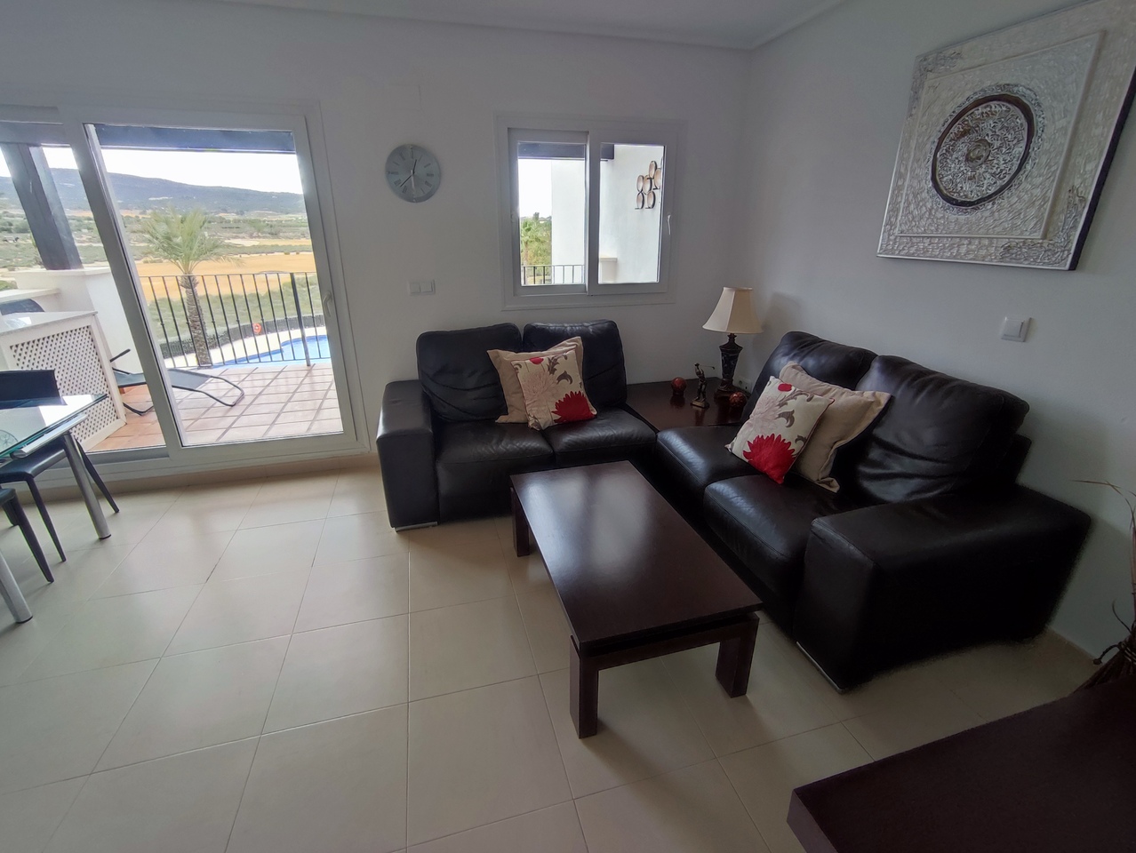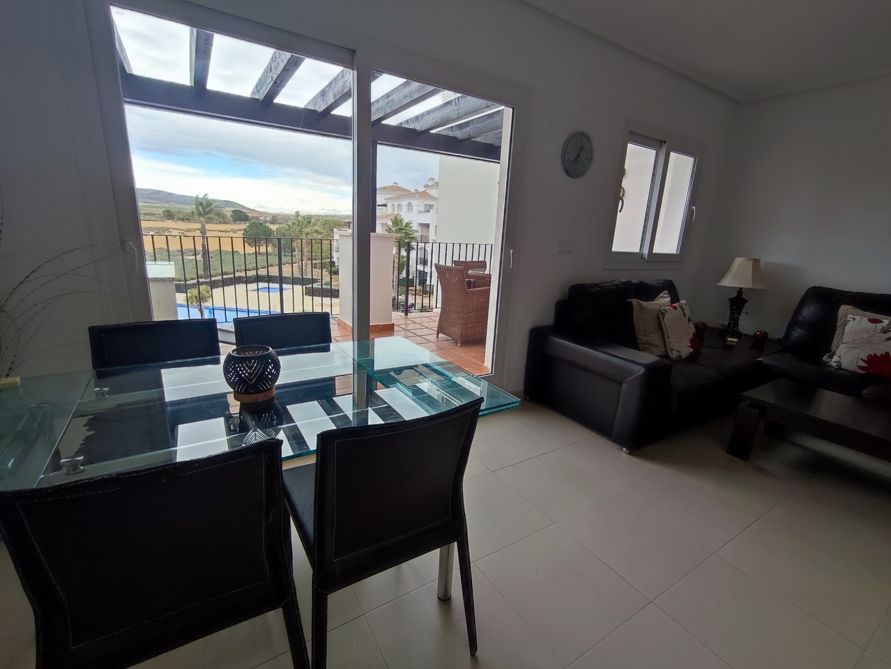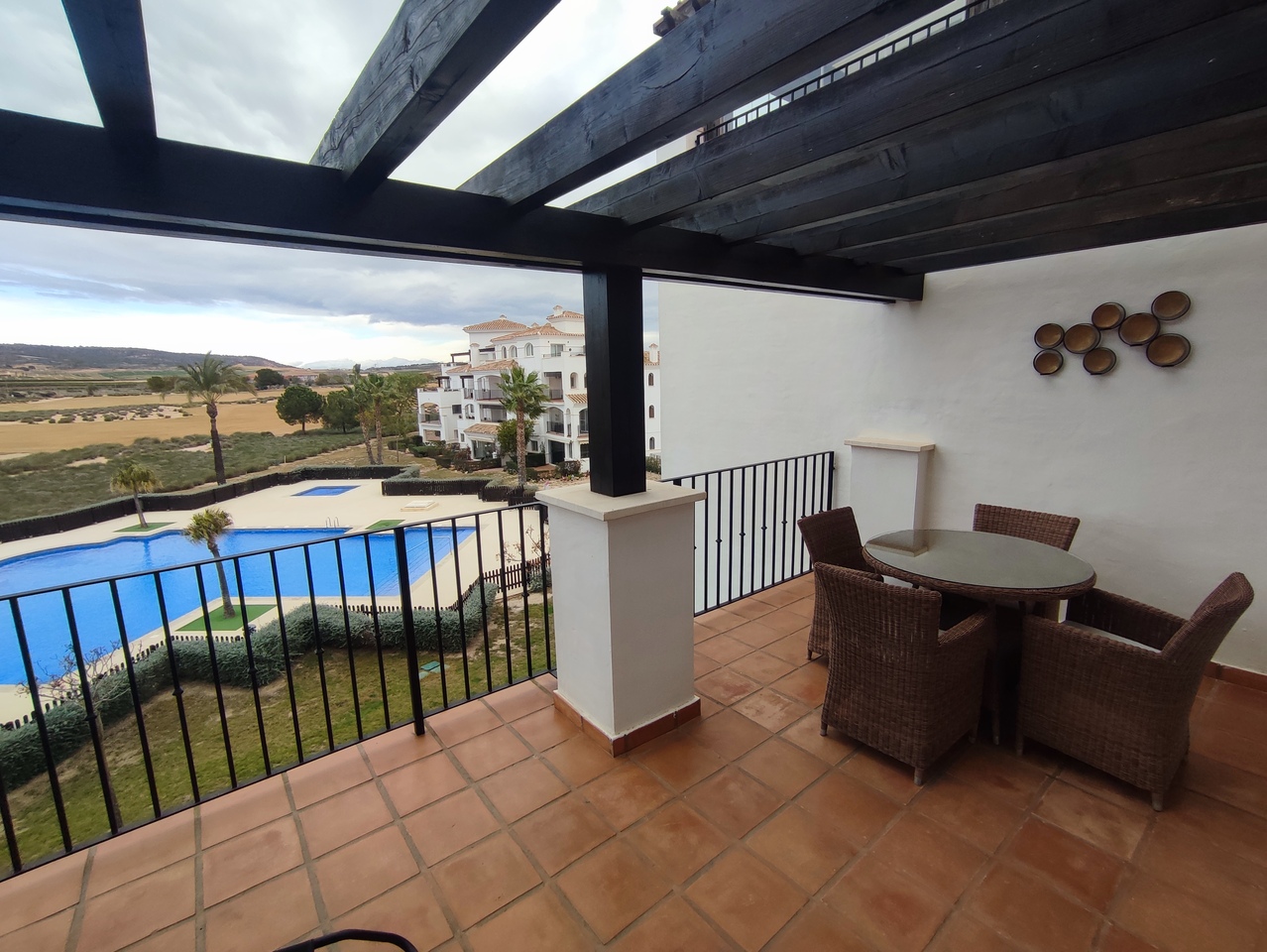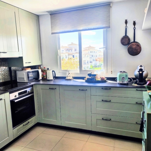 This curved wall design apartment is located on the second floor and has great views of the pool, golf and mountains. It has the larger design of kitchen which can be renovated into open plan. For examples please look on our website, click information tab and choose "renovation-ideas"  This apartment is very close to the resort centre with restaurant, bar and coffee shop. It is being sold fully furnished and includes a car in the price.The first thing that impresses you about Hacienda Riquelme Golf Resort is the wide-open spaces, the extensive gardens and the low-density construction, which create a relaxing environment to enjoy a very safe and peaceful life or holiday. The apartments are set out spaciously around the magnificent and challenging 18 hole golf course part of the Jack Nicklaus Golf Trail.All apartments have unlimited internet, air-conditioning for summer and heating for winter, private underground parking space and a communal lift.In the heart of the resort you will find the beautiful renovated Hacienda where you will find a supermarket, clubhouse, restaurant and bar. The inner court yard becomes the hive of entertainment in the Summer, whilst the large terrace set in the stunning gardens is open all year for “al fesco” dining and drinking.Facilities:Gated Community.24 hour security."El Cason" Bar, Restaurant, Clubhouse. "Sips" Coffee ShopSupermarket.Summer Entertainment.19 large community swimming pools.Communal gardens.Trees, 5 lakes.Wild flowers & local wildlife.Driving range & Golf ShopTennis courts.Paddle tennis courts.Football / Basketball court.Outside gym area.Children's play areas.Hacienda Riquelme is very well connected by the main motorways. Murcia Airport (20 mins)Mar Menor beaches (15 mins)Mediterranean beaches (20 mins)For those who like historical buildings, architecture or a desire to shop, the lovely cities of Murcia and Cartagena provide plenty of entertainment. Murcia (30 mins)Cartagena (45 mins) Murcia Airport (20 mins)Near to the bustling popular village of Sucina with shops, restaurants, bars, chemist, supermarket and lots more (5 minutes)For more information on the apartments available please contact us.