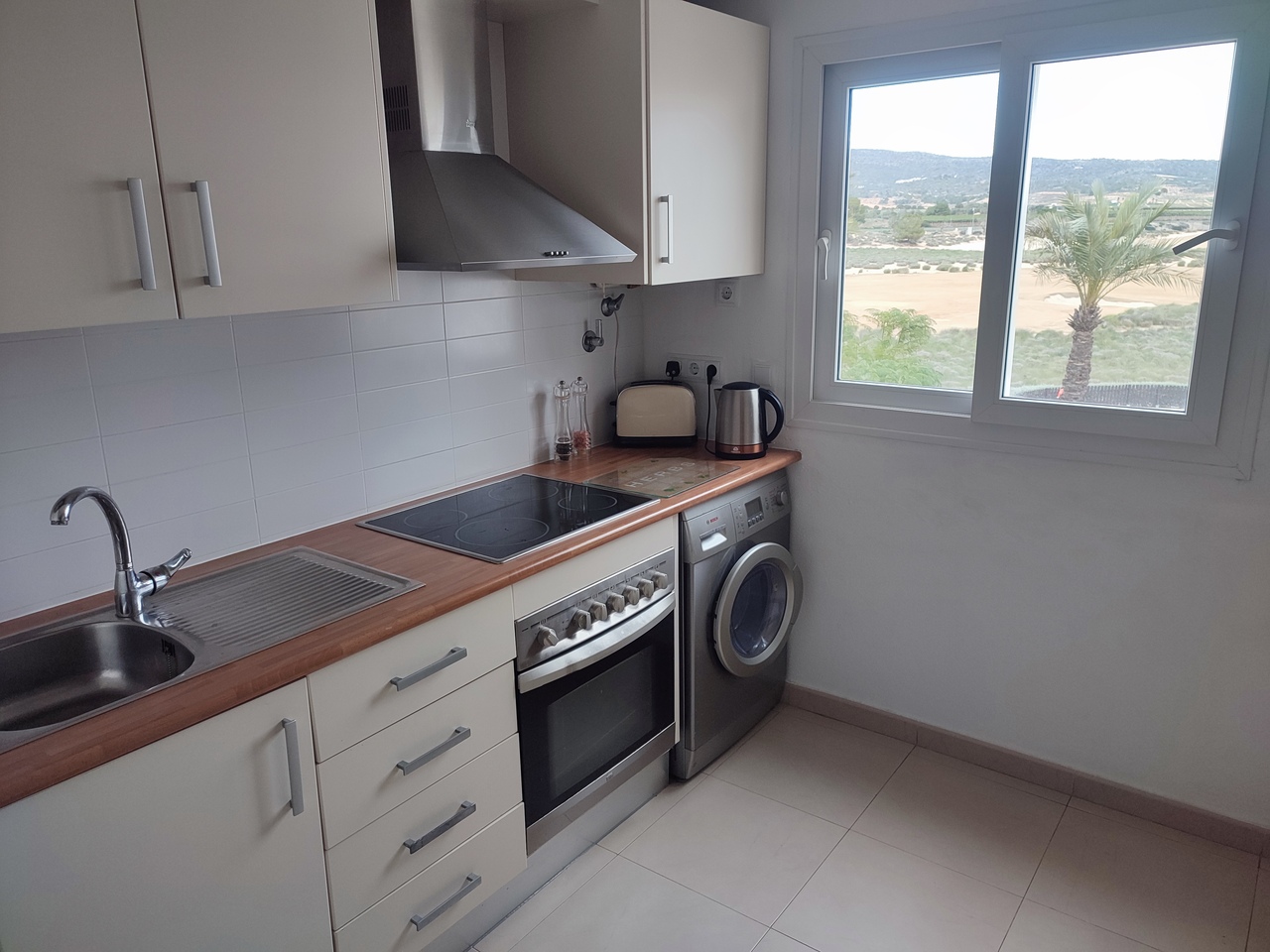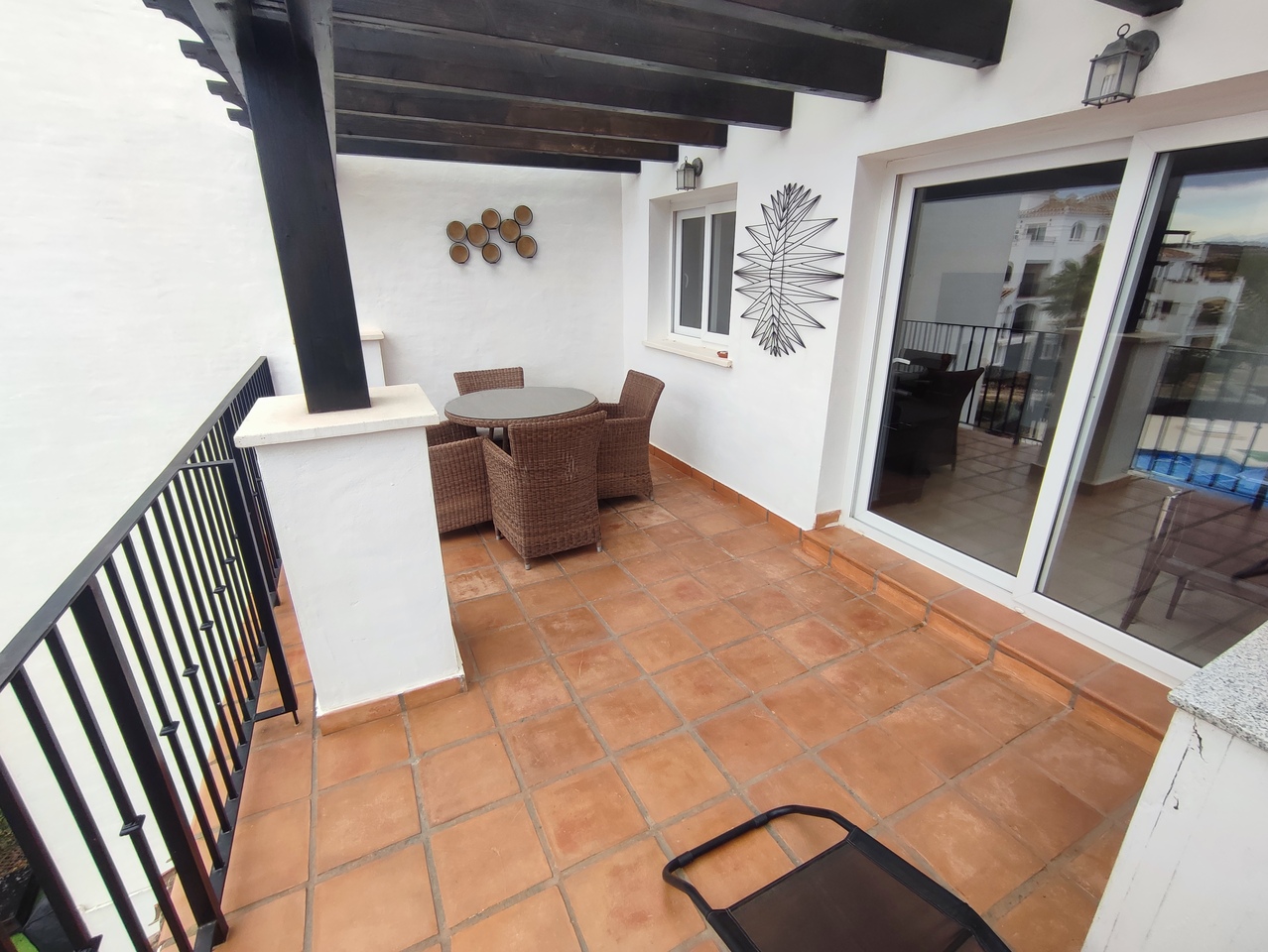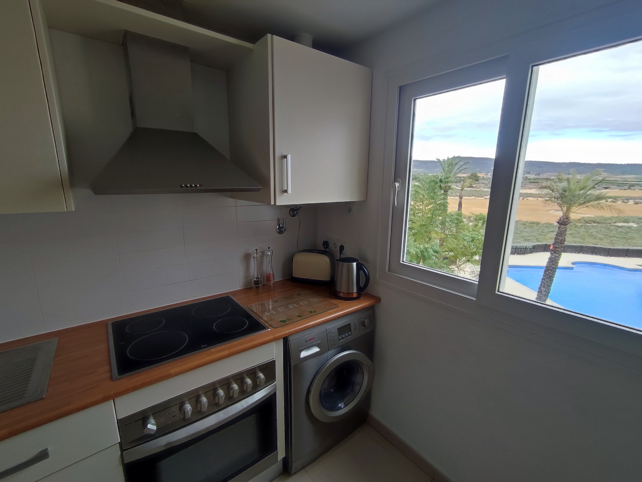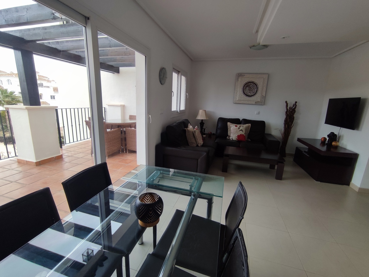 This curved wall design apartment is located on the second floor and has great views of the pool, golf and mountains. It has the larger design of kitchen which can be renovated into open plan. For examples please look on our website, click information tab and choose "renovation-ideas"  This apartment is very close to the resort centre with restaurant, bar and coffee shop. It is being sold fully furnished and includes a car in the price.The first thing that impresses you about Hacienda Riquelme Golf Resort is the wide-open spaces, the extensive gardens and the low-density construction, which create a relaxing environment to enjoy a very safe and peaceful life or holiday. The apartments are set out spaciously around the magnificent and challenging 18 hole golf course part of the Jack Nicklaus Golf Trail.All apartments have unlimited internet, air-conditioning for summer and heating for winter, private underground parking space and a communal lift.In the heart of the resort you will find the beautiful renovated Hacienda where you will find a supermarket, clubhouse, restaurant and bar. The inner court yard becomes the hive of entertainment in the Summer, whilst the large terrace set in the stunning gardens is open all year for “al fesco” dining and drinking.Facilities:Gated Community.24 hour security."El Cason" Bar, Restaurant, Clubhouse. "Sips" Coffee ShopSupermarket.Summer Entertainment.19 large community swimming pools.Communal gardens.Trees, 5 lakes.Wild flowers & local wildlife.Driving range & Golf ShopTennis courts.Paddle tennis courts.Football / Basketball court.Outside gym area.Children's play areas.Hacienda Riquelme is very well connected by the main motorways. Murcia Airport (20 mins)Mar Menor beaches (15 mins)Mediterranean beaches (20 mins)For those who like historical buildings, architecture or a desire to shop, the lovely cities of Murcia and Cartagena provide plenty of entertainment. Murcia (30 mins)Cartagena (45 mins) Murcia Airport (20 mins)Near to the bustling popular village of Sucina with shops, restaurants, bars, chemist, supermarket and lots more (5 minutes)For more information on the apartments available please contact us.