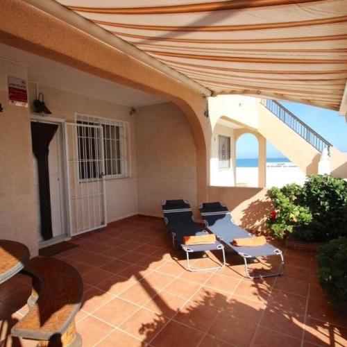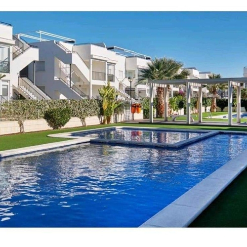 This three-bedroom, three-bathroom duplex townhouse is located in the exclusive residential area of Los Balcones in Torrevieja. The property stands out for its modern design, bright interiors and spacious terraces that allow you to enjoy the Mediterranean lifestyle all year round.On the ground floor, the house features a private 22 m² garden with space for outdoor dining. Inside, there is an open-plan living room with an elegant feature wall, connected to a fully equipped modern kitchen with appliances and breakfast bar. This level also includes a bedroom with fitted wardrobes, currently adapted as a study, and a complete bathroom with shower.Upstairs, there are two further bedrooms, both with fitted wardrobes. The master bedroom is particularly bright and has direct access to a private terrace with views of the residential area and the swimming pool. This floor also offers two additional bathrooms with modern finishes.The property also benefits from a large private solarium with open views of the Torrevieja lagoon, equipped with a chill-out area, pergola, barbecue and sun loungers — perfect for outdoor gatherings or simply relaxing in a peaceful setting.The residential complex offers large communal areas with a swimming pool surrounded by palm trees and green spaces, creating an ideal environment for families or those seeking a relaxed lifestyle.Los Balcones is one of the most established residential areas of Torrevieja, with all services nearby: supermarkets, schools, pharmacies, sports facilities and Torrevieja University Hospital. The beaches of Punta Prima and Torrevieja are less than 4 km away, making this property an excellent choice both as a permanent residence or a holiday investment.