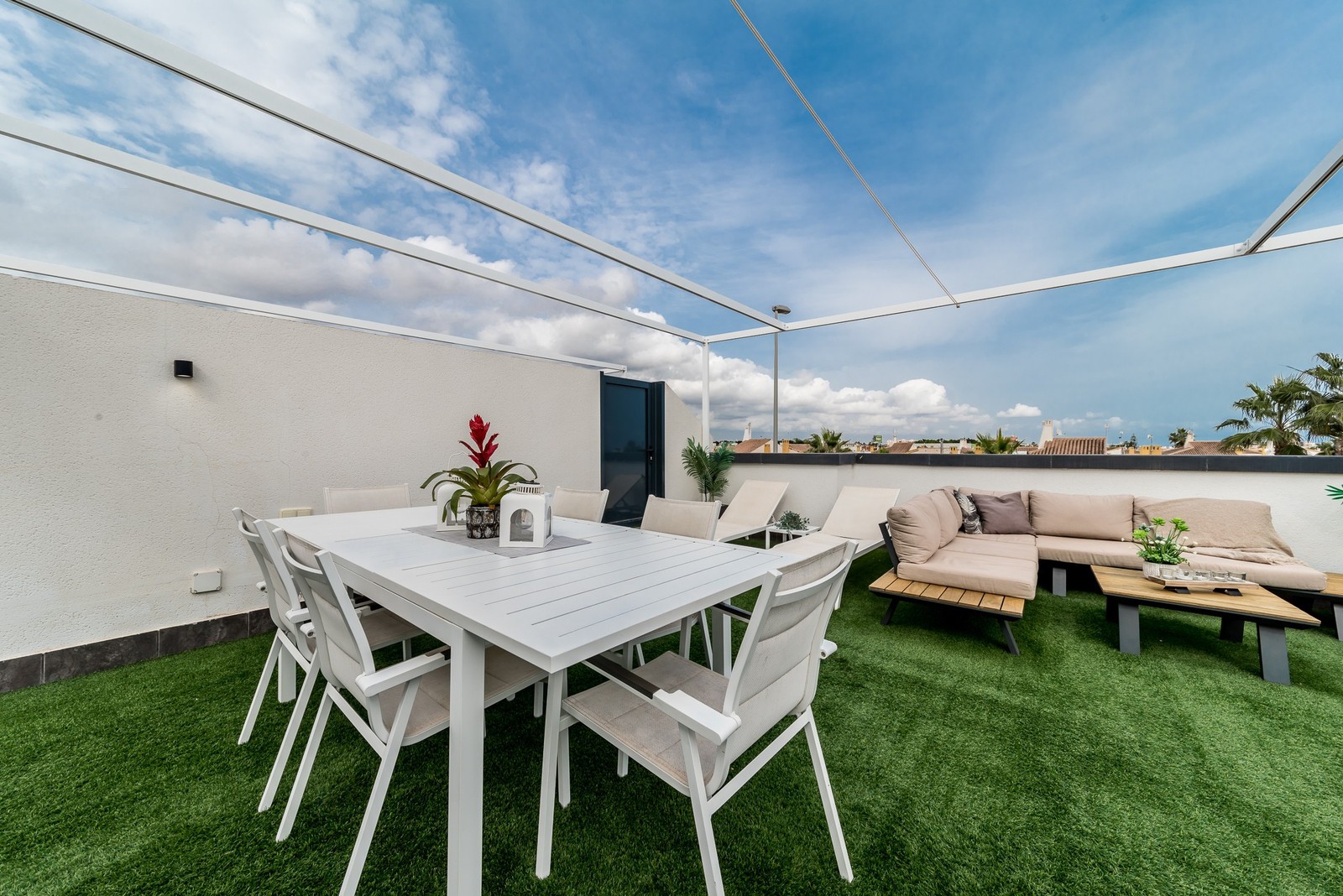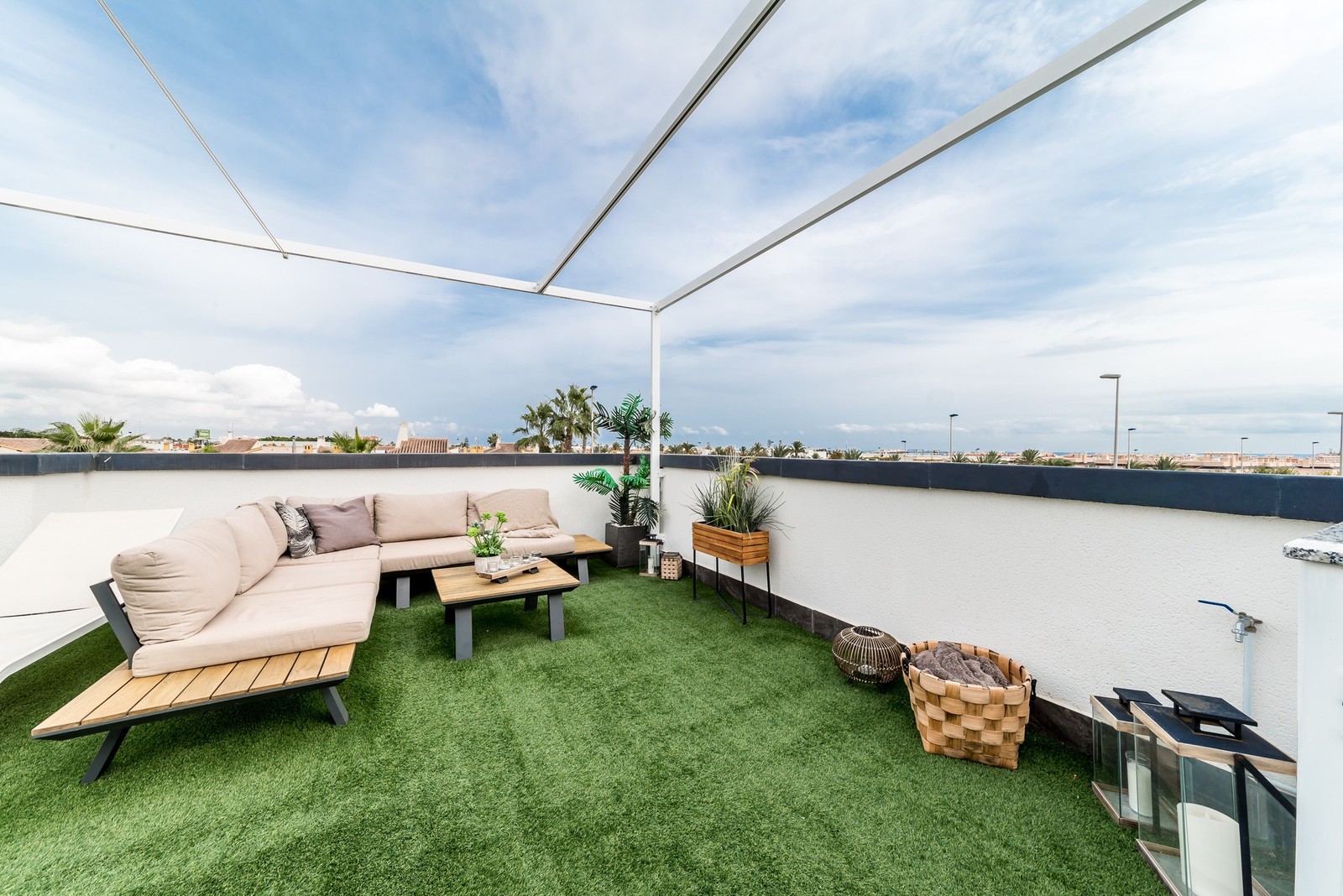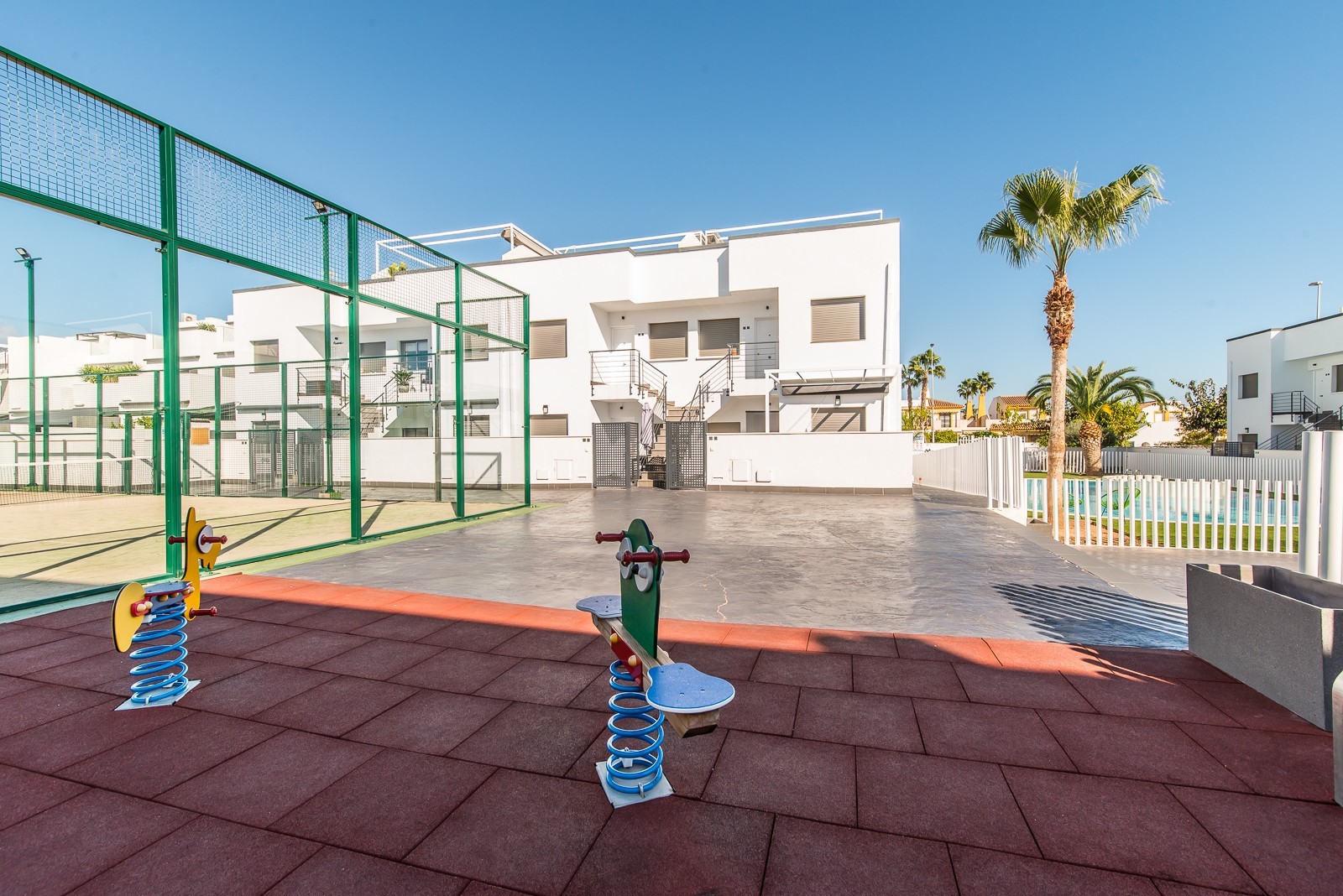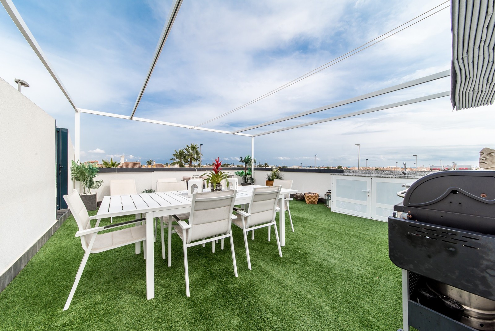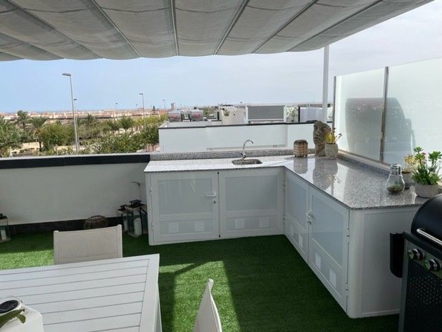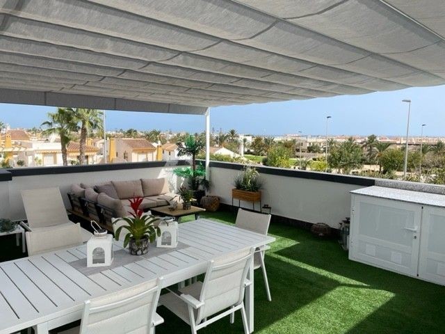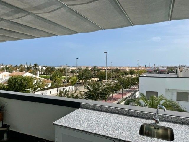 This beautiful corner apartment of 51 m² on the second floor (nr. 16) offers an impressive rooftop terrace with sea views and a clear sight down to the pool area. The apartment has two bedrooms, one bathroom, and is fully furnished with new, modern furniture. There is space for a total of seven sleeping places – two double beds, one single bed, and a sofa bed in the living room. The rooftop terrace is equipped with a complete outdoor kitchen, grill, pergola, and sun shading, perfect for lazy summer days or festive gatherings. Most of the furniture can be included by agreement with the seller. The complex also features a family-friendly pool and a paddle court, providing great opportunities for both activity and relaxation. Location: The apartment is located 500 meters from the beach in the charming fishing village of Pilar de La Horadada, south of Torrevieja. Here, you can explore small, cozy restaurants along the beach, and the grocery store is only 200 meters away. For golf enthusiasts, there are several exclusive golf courses nearby, including Villamartin Golf (10 minutes by car) and an additional seven courses within a short drive, such as Las Ramblas, Campoamor, Las Colinas, and Lo Romero. The distance to airports is convenient – only 25 minutes to San Javier Airport and 40 minutes to Alicante Airport (El Altet). Climate: The area has more than 300 sunny days per year, with a pleasant microclimate that provides mild winters and warm summers. The World Health Organization has classified Costa Blanca as one of the healthiest places in the world to live. Additionally, there is proximity to some of the best marinas in Torrevieja, Cabo Roig, and Campoamor, perfect for those who love sailing and diving. Extra opportunity: The neighboring apartment (nr. 14) is also for sale, which opens up the possibility to ensure that friends or family can be your neighbors. Another option is to buy both apartments as an investment opportunity with potential for value appreciation. Additional information: It is possible to purchase a garage separately for 20,000 euros. The garage is 28.23 m² and has an electric garage door opener as well as a loft providing good storage space. This is an ideal investment whether you are looking for a vacation home or a permanent residence on the Costa Blanca. Contact us today to schedule a viewing!
