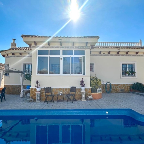 In the heart of Vega Baja, next to the town center of Bigastro, 20 minutes from the beaches of Torrevieja and Orihuela Costa, and 40 minutes from Alicante Airport, is this fabulous villa surrounded by an orchard, located on a 2,500-meter plot. square and consisting of a large porch with two barbecue areas, large living room, independent kitchen with individual pantry and laundry area, four bedrooms (two in the main house and two in the guest house), four bathrooms, private pool, cellar, orchard area and warehouses. The house has air conditioning, heating, fully fenced and with automatic access door