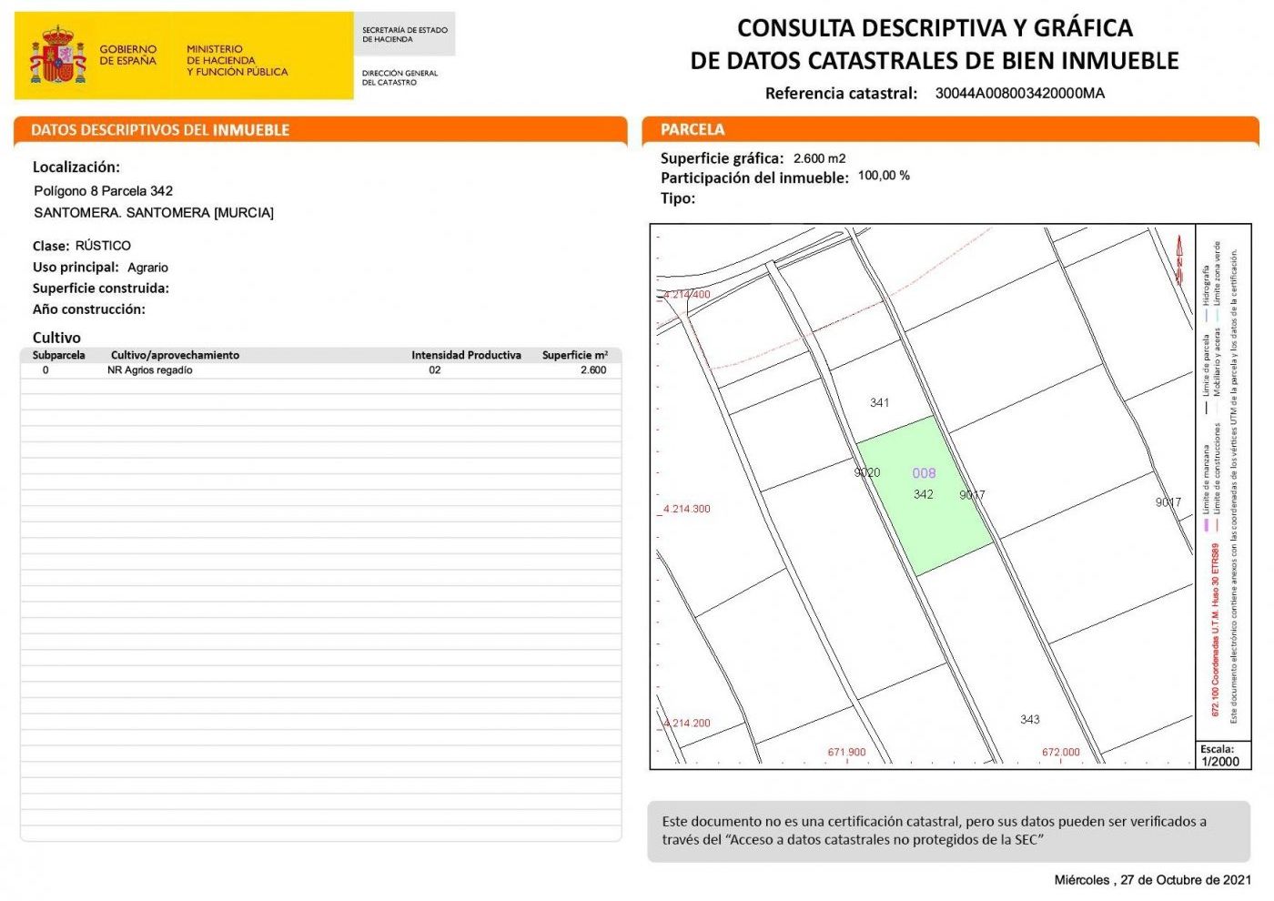Rustic land of 2,600m2 for sale on the road to Los Cacheros area in Santomera, Murcia. Agricultural-type rural land, currently planted with lemon trees with traditional irrigation of the Acequia Zaraiche.