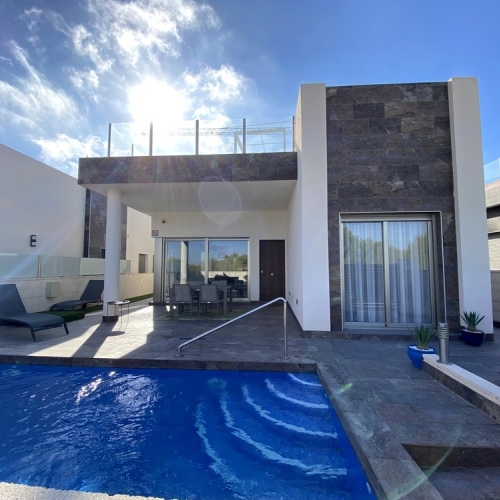 Completed in 2022, this fabulous 3 bed (potentially 5), 4 bath contemporary style new-build villa is the finest example of the Don Benito style villas, incorporating every conceivable ‘extra’ and the very highest specification.  Conveniently located in the El Galan urbanisation nr Villamartin and close to all amenities and numerous golf courses, it’s situated only a few minutes to both the Villamartin Plaza and La Fuente Commercial Centre as well as being less than a 7 minute drive from the fabulous La Zenia Boulevard and those amazing Costa Blanca beaches!Internally, this incredible property comprises two stories with an additional under-build and rooftop solarium, all of which benefit from hot/cold air conditioning.  On the ground floor you will find one of the three double bedrooms together with a full family bathroom including shower. There is a spacious open-plan kitchen and dining area incorporating a well appointed modern kitchen equipped with all of the modern facilities you would expect and giving access out to the covered utility and storage area which also houses a washing machine.  The lounge area enjoys full height, double-glazed sliding doors along the length of the external wall giving direct access out onto the sun drenched covered terrace area and large 6x3m private swimming pool.  Fully tiled and privacy screened, the outside area offers usable space around the entirety of the property and incorporates a useful utility area to the rear as well as a covered car parking space and driveway to the left of the villa.  This outside space is what Spanish living is all about – sunshine, socialising and relaxing with a fantastic pool (with outdoor shower) to take a dip in when the sunshine gets too much!Stairs lead to the first floor accommodation which features two double bedrooms both of which benefit from their own en-suite bathrooms, fitted wardrobes and retractable insect window screens.  The master bedroom also offers access via glazed sliding doors onto a private balcony – the perfect spot to enjoy your morning cafe au lait.  A second internal stairway leads to the amazing private rooftop solarium complete with aluminium pergola for shade, a BBQ area also complete with pergola and a handy shower area.  This privileged spot offers the perfect relaxation and entertaining space with views across the parkland – as well as guaranteeing the perfect year round sunbathing spot.In addition to the superb internal and outdoor living accommodation, this fantastic villa also benefits from an incredible 56 sqm under-build which was a built as part of the original construction as a developer ‘extra’.  This incredible space is fully finished and comes complete with a fully fitted bathroom.  Currently being used as a workshop and a music & cinema room, this space offers the flexibility to be used as additional self-contained guest accommodation and would easily provide two further bedrooms in addition to the existing three, potentially making this a five bedroom, four bathroom luxury home…….  Or you could just leave it as every husbands (and wife’s!) dream ‘Man Cave’!Location, quality and value combine to make this property a truly exceptional prospect for anyone seeking the ultimate villa with easy access to all that the Costa Blanca has to offer – walking distance to the best bars, restaurants and shopping and only a few minutes drive from the Mediterranean and  those golden beaches – what more could you want?The property comes part furnished with most items included as shown.