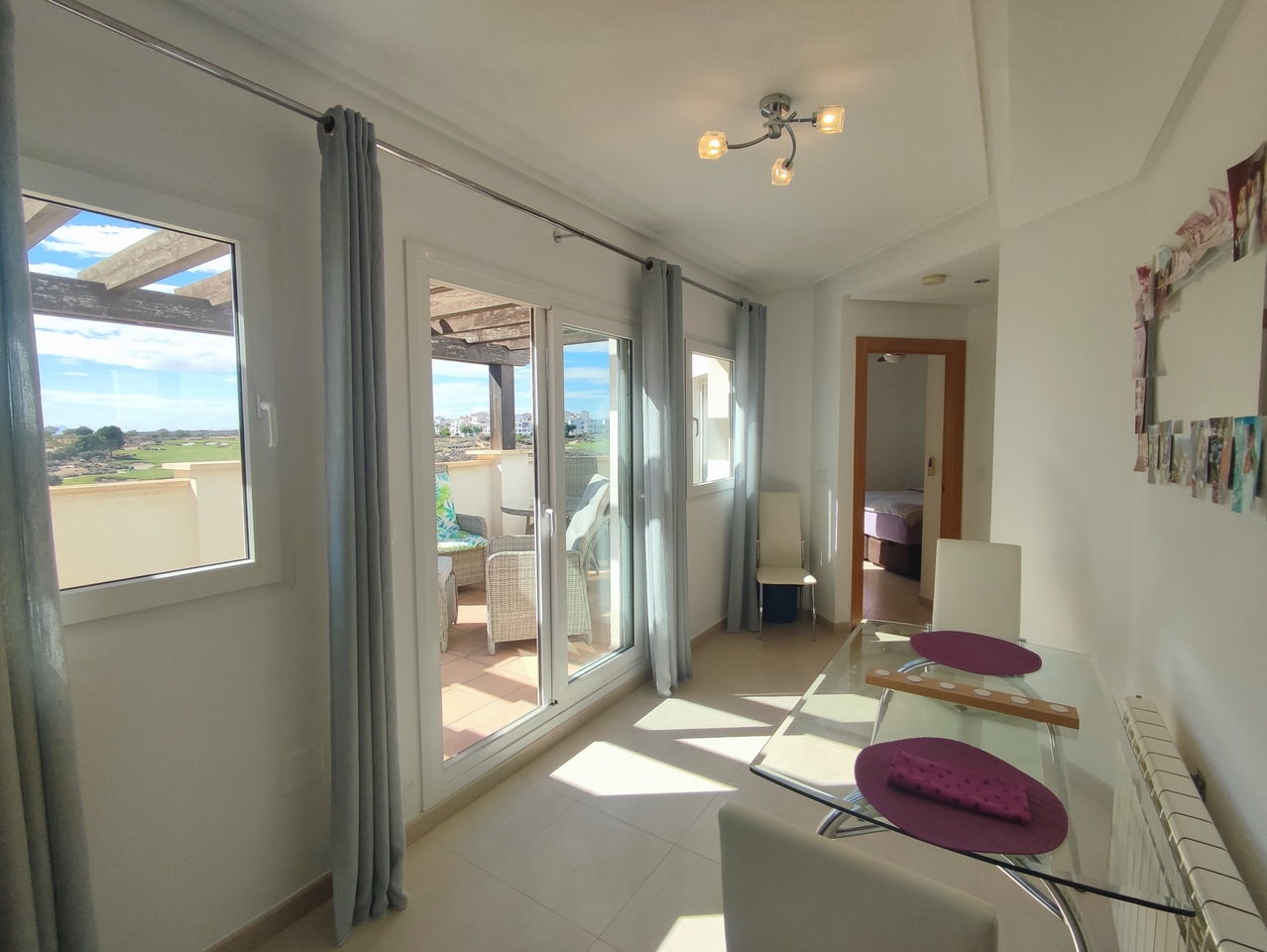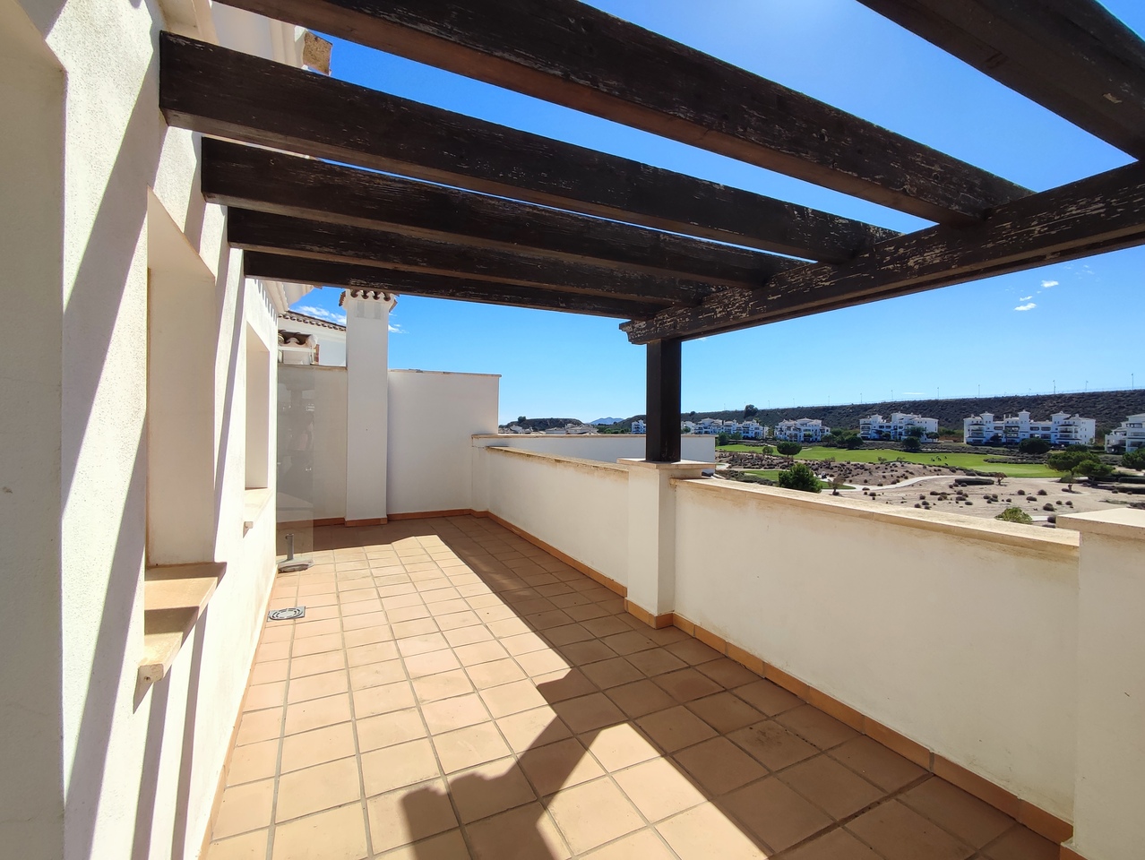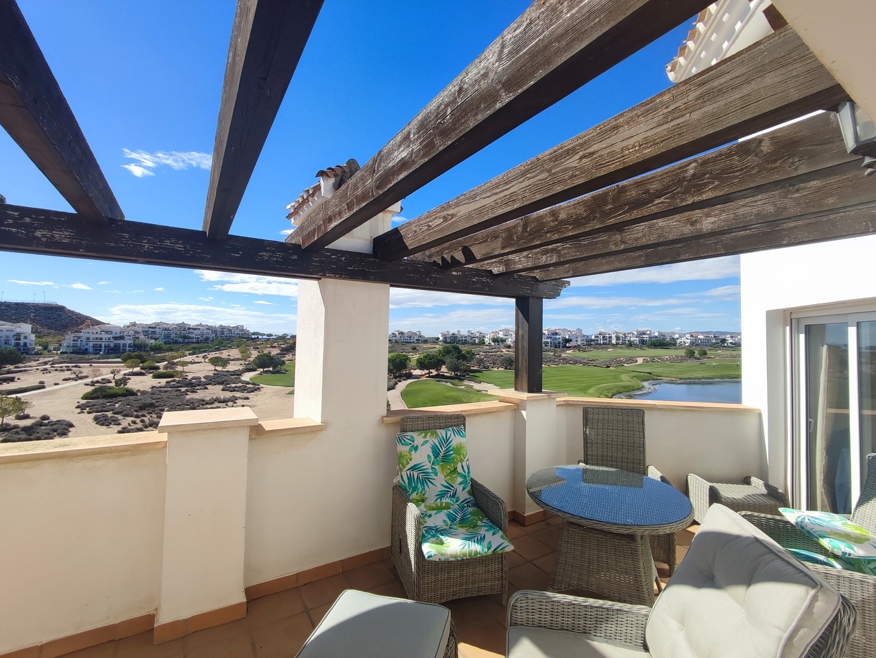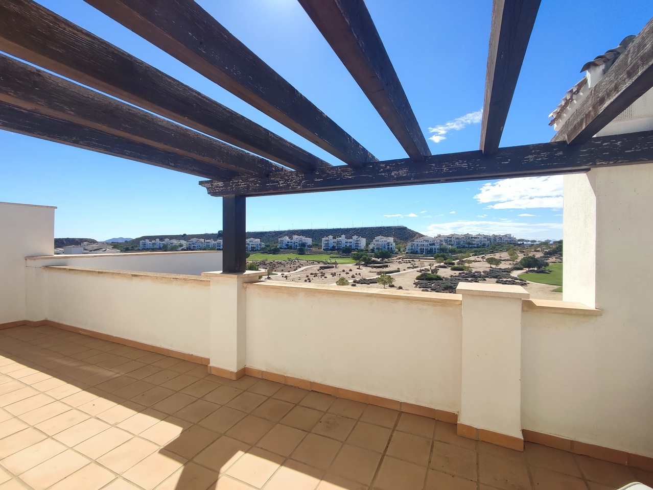 This penthouse has stunning views of the golf, lake and gardens. The long terrace is south west facing and perfect to capture the sun and sunsets. A section has been covered in to create extra storage but could also be renovated into an outside kitchen.There is air conditioning in the main lounge and ceiling fans in the 2 bedrooms.The picture windows provide plenty of light in the main living area.This penthouse can be renovated into open plan, please ask for examples.The apartment is being sold furnished minus personal possessions, complete with a private underground parking space and would make an ideal second or permanent home.The first thing that impresses you about Hacienda Riquelme Golf Resort is the wide-open spaces, the extensive gardens and the low-density construction, which create a relaxing environment to enjoy a very safe and peaceful life or holiday. The apartments are set out spaciously around the magnificent and challenging 18 hole golf course part of the Jack Nicklaus Golf Trail.All apartments have unlimited internet, air-conditioning for summer and heating for winter, private underground parking space and a communal lift.In the heart of the resort you will find the beautiful renovated Hacienda where you will find a supermarket, clubhouse, restaurant and bar. The inner court yard becomes the hive of entertainment in the Summer, whilst the large terrace set in the stunning gardens is open all year for “al fesco” dining and drinking.Facilities:Gated Community.24 hour security."El Cason" Bar, Restaurant, Clubhouse.Supermarket.Summer Entertainment.19 large community swimming pools.Communal gardens.Trees, 5 lakes.Wild flowers & local wildlife.Driving range.Tennis courts.Paddle tennis courts.Football / Basketball court.Outside gym area.Children's play areas.Hacienda Riquelme is very well connected by the main motorways. Murcia Airport (20 mins)Mar Menor beaches (15 mins)Mediterranean beaches (20 mins)For those who like historical buildings, architecture or a desire to shop, the lovely cities of Murcia and Cartagena provide plenty of entertainment. Murcia (30 mins)Cartagena (45 mins) Murcia Airport (20 mins)Near to the bustling popular village of Sucina with shops, restaurants, bars, chemist, supermarket and lots more (5 minutes)For more information on the apartments available please contact us.