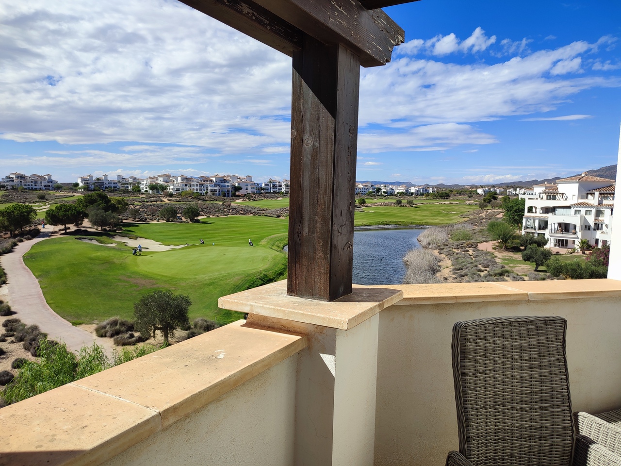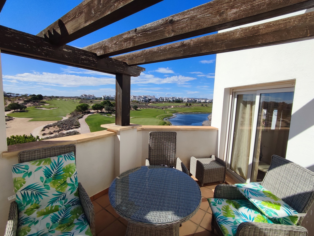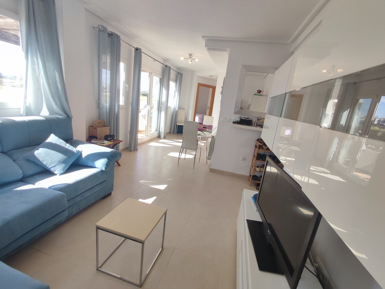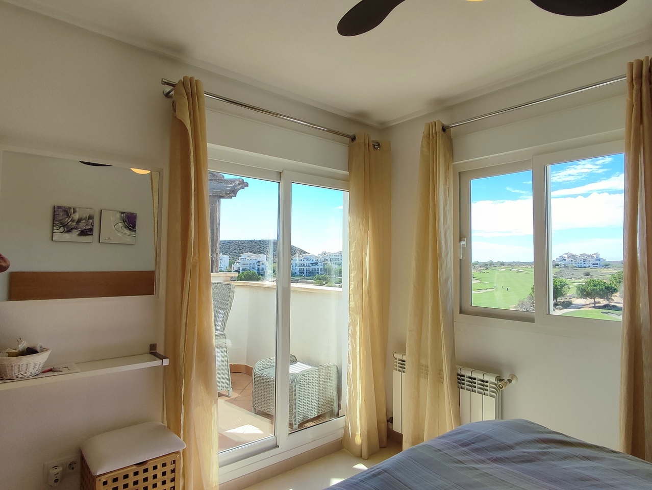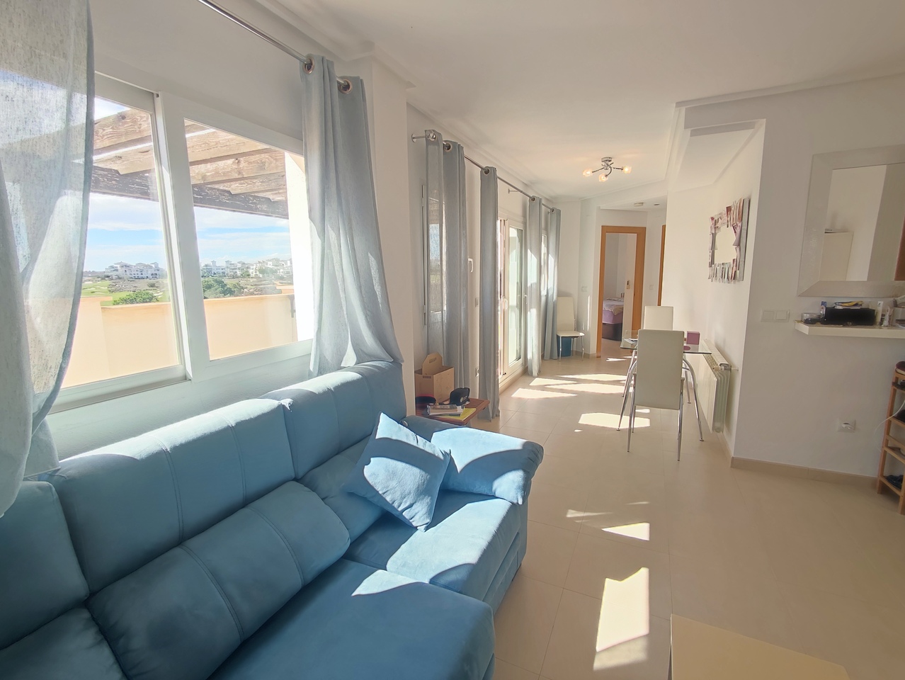 This penthouse has stunning views of the golf, lake and gardens. The long terrace is south west facing and perfect to capture the sun and sunsets. A section has been covered in to create extra storage but could also be renovated into an outside kitchen.There is air conditioning in the main lounge and ceiling fans in the 2 bedrooms.The picture windows provide plenty of light in the main living area.This penthouse can be renovated into open plan, please ask for examples.The apartment is being sold furnished minus personal possessions, complete with a private underground parking space and would make an ideal second or permanent home.The first thing that impresses you about Hacienda Riquelme Golf Resort is the wide-open spaces, the extensive gardens and the low-density construction, which create a relaxing environment to enjoy a very safe and peaceful life or holiday. The apartments are set out spaciously around the magnificent and challenging 18 hole golf course part of the Jack Nicklaus Golf Trail.All apartments have unlimited internet, air-conditioning for summer and heating for winter, private underground parking space and a communal lift.In the heart of the resort you will find the beautiful renovated Hacienda where you will find a supermarket, clubhouse, restaurant and bar. The inner court yard becomes the hive of entertainment in the Summer, whilst the large terrace set in the stunning gardens is open all year for “al fesco” dining and drinking.Facilities:Gated Community.24 hour security."El Cason" Bar, Restaurant, Clubhouse.Supermarket.Summer Entertainment.19 large community swimming pools.Communal gardens.Trees, 5 lakes.Wild flowers & local wildlife.Driving range.Tennis courts.Paddle tennis courts.Football / Basketball court.Outside gym area.Children's play areas.Hacienda Riquelme is very well connected by the main motorways. Murcia Airport (20 mins)Mar Menor beaches (15 mins)Mediterranean beaches (20 mins)For those who like historical buildings, architecture or a desire to shop, the lovely cities of Murcia and Cartagena provide plenty of entertainment. Murcia (30 mins)Cartagena (45 mins) Murcia Airport (20 mins)Near to the bustling popular village of Sucina with shops, restaurants, bars, chemist, supermarket and lots more (5 minutes)For more information on the apartments available please contact us.