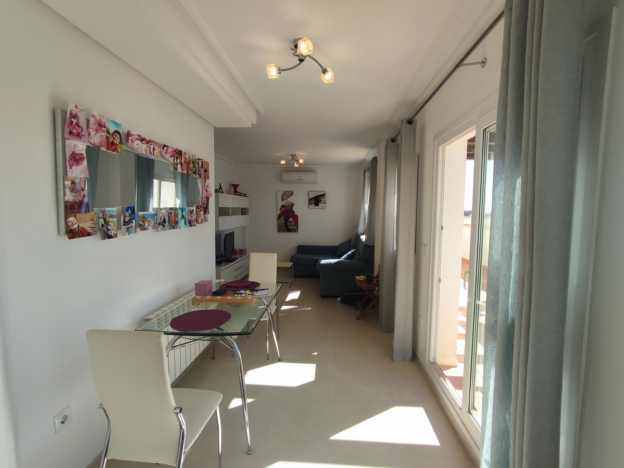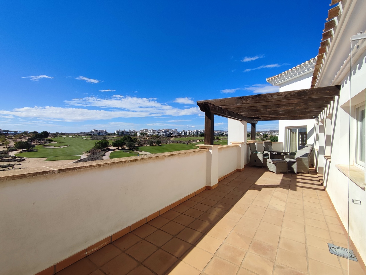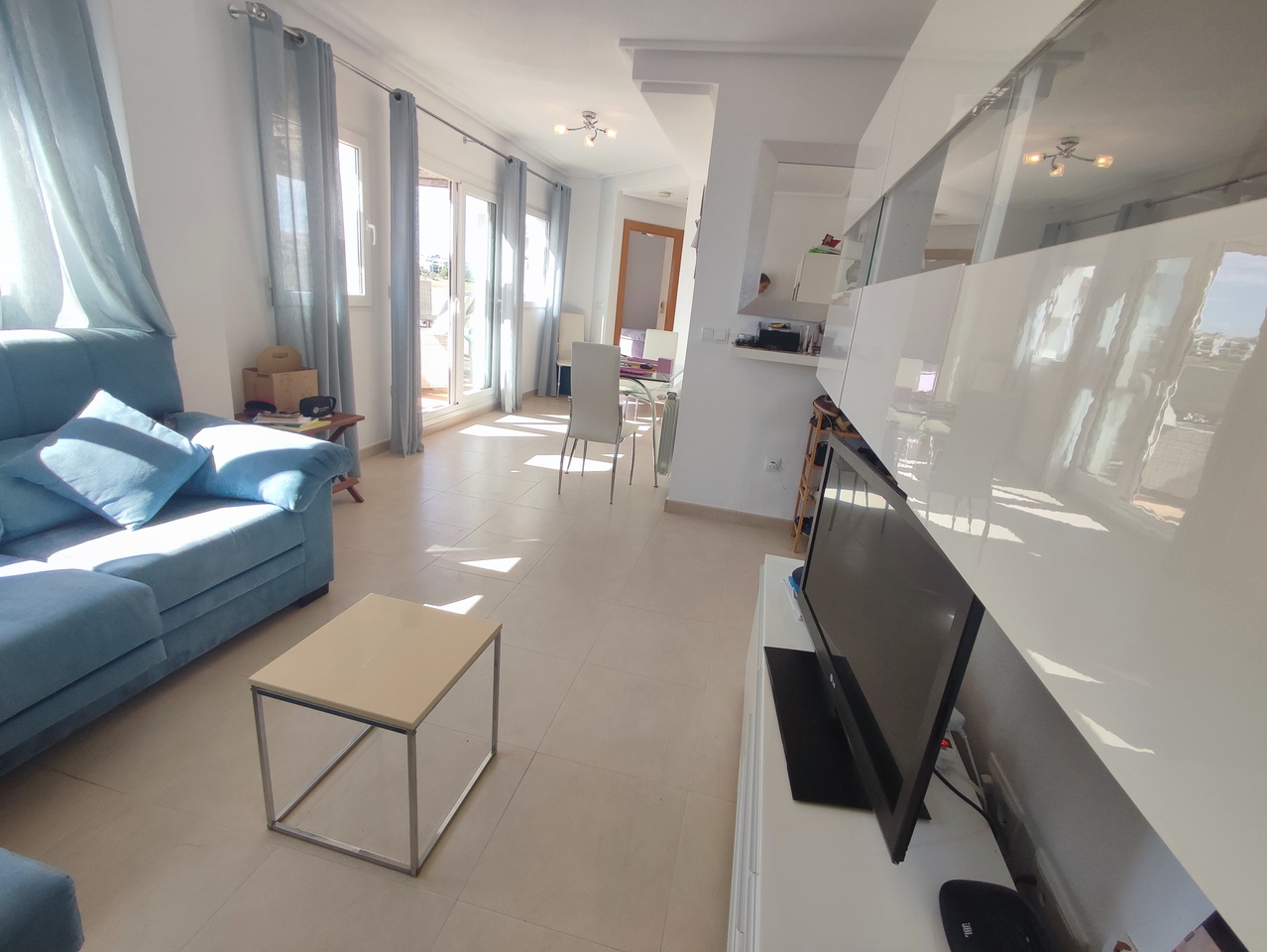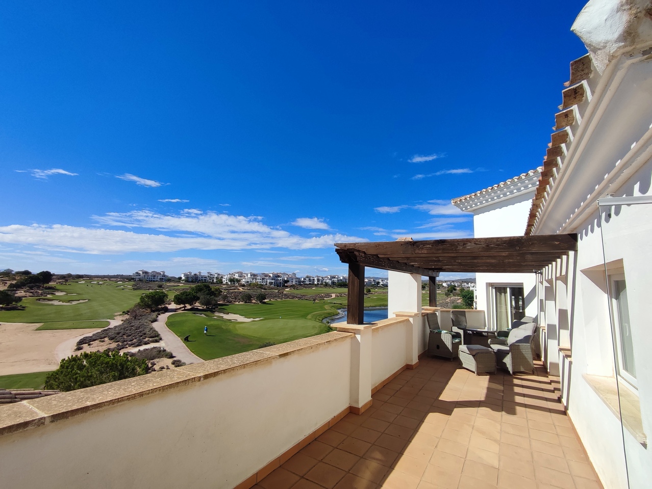 This penthouse has stunning views of the golf, lake and gardens. The long terrace is south west facing and perfect to capture the sun and sunsets. A section has been covered in to create extra storage but could also be renovated into an outside kitchen.There is air conditioning in the main lounge and ceiling fans in the 2 bedrooms.The picture windows provide plenty of light in the main living area.This penthouse can be renovated into open plan, please ask for examples.The apartment is being sold furnished minus personal possessions, complete with a private underground parking space and would make an ideal second or permanent home.The first thing that impresses you about Hacienda Riquelme Golf Resort is the wide-open spaces, the extensive gardens and the low-density construction, which create a relaxing environment to enjoy a very safe and peaceful life or holiday. The apartments are set out spaciously around the magnificent and challenging 18 hole golf course part of the Jack Nicklaus Golf Trail.All apartments have unlimited internet, air-conditioning for summer and heating for winter, private underground parking space and a communal lift.In the heart of the resort you will find the beautiful renovated Hacienda where you will find a supermarket, clubhouse, restaurant and bar. The inner court yard becomes the hive of entertainment in the Summer, whilst the large terrace set in the stunning gardens is open all year for “al fesco” dining and drinking.Facilities:Gated Community.24 hour security."El Cason" Bar, Restaurant, Clubhouse.Supermarket.Summer Entertainment.19 large community swimming pools.Communal gardens.Trees, 5 lakes.Wild flowers & local wildlife.Driving range.Tennis courts.Paddle tennis courts.Football / Basketball court.Outside gym area.Children's play areas.Hacienda Riquelme is very well connected by the main motorways. Murcia Airport (20 mins)Mar Menor beaches (15 mins)Mediterranean beaches (20 mins)For those who like historical buildings, architecture or a desire to shop, the lovely cities of Murcia and Cartagena provide plenty of entertainment. Murcia (30 mins)Cartagena (45 mins) Murcia Airport (20 mins)Near to the bustling popular village of Sucina with shops, restaurants, bars, chemist, supermarket and lots more (5 minutes)For more information on the apartments available please contact us.
