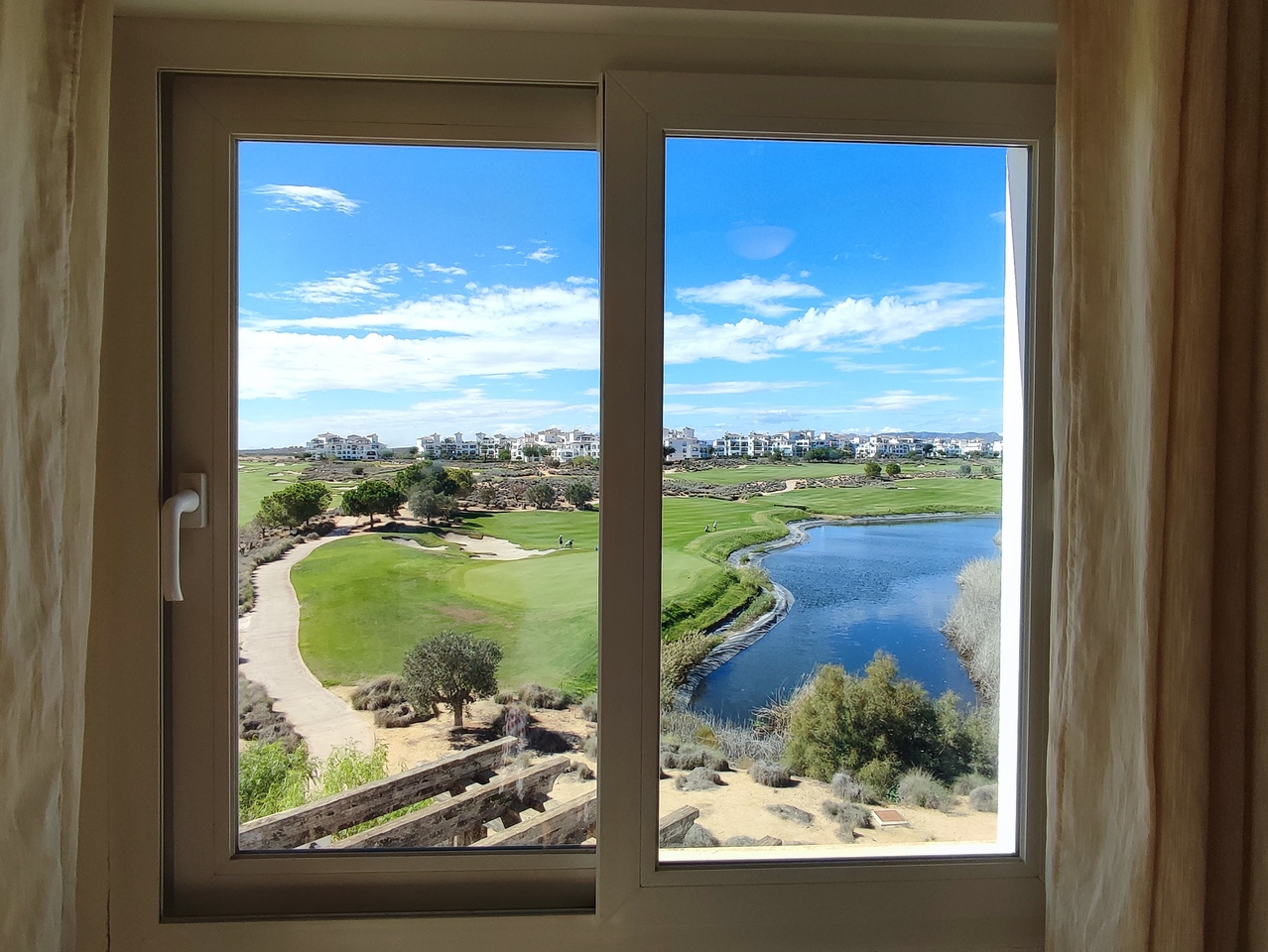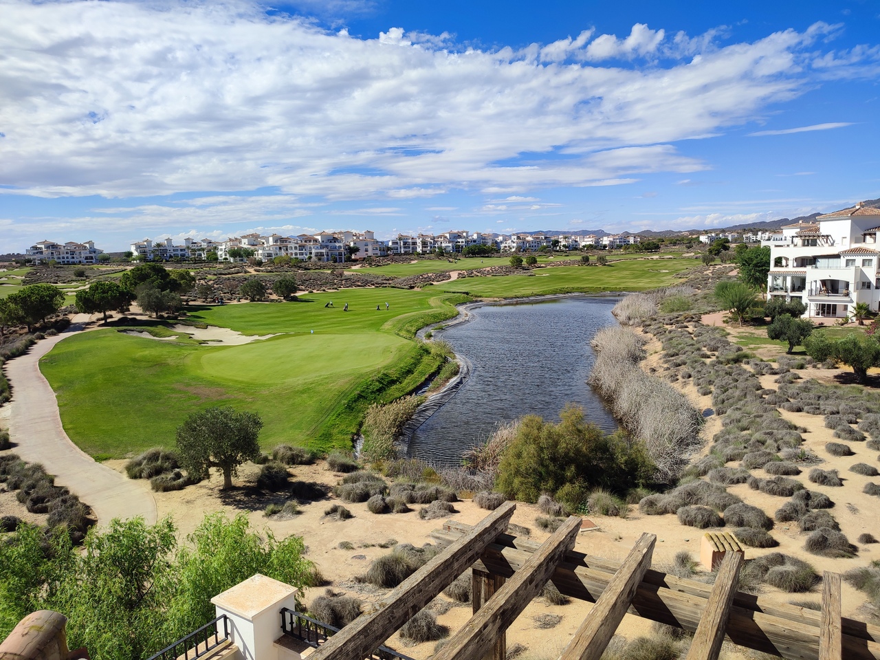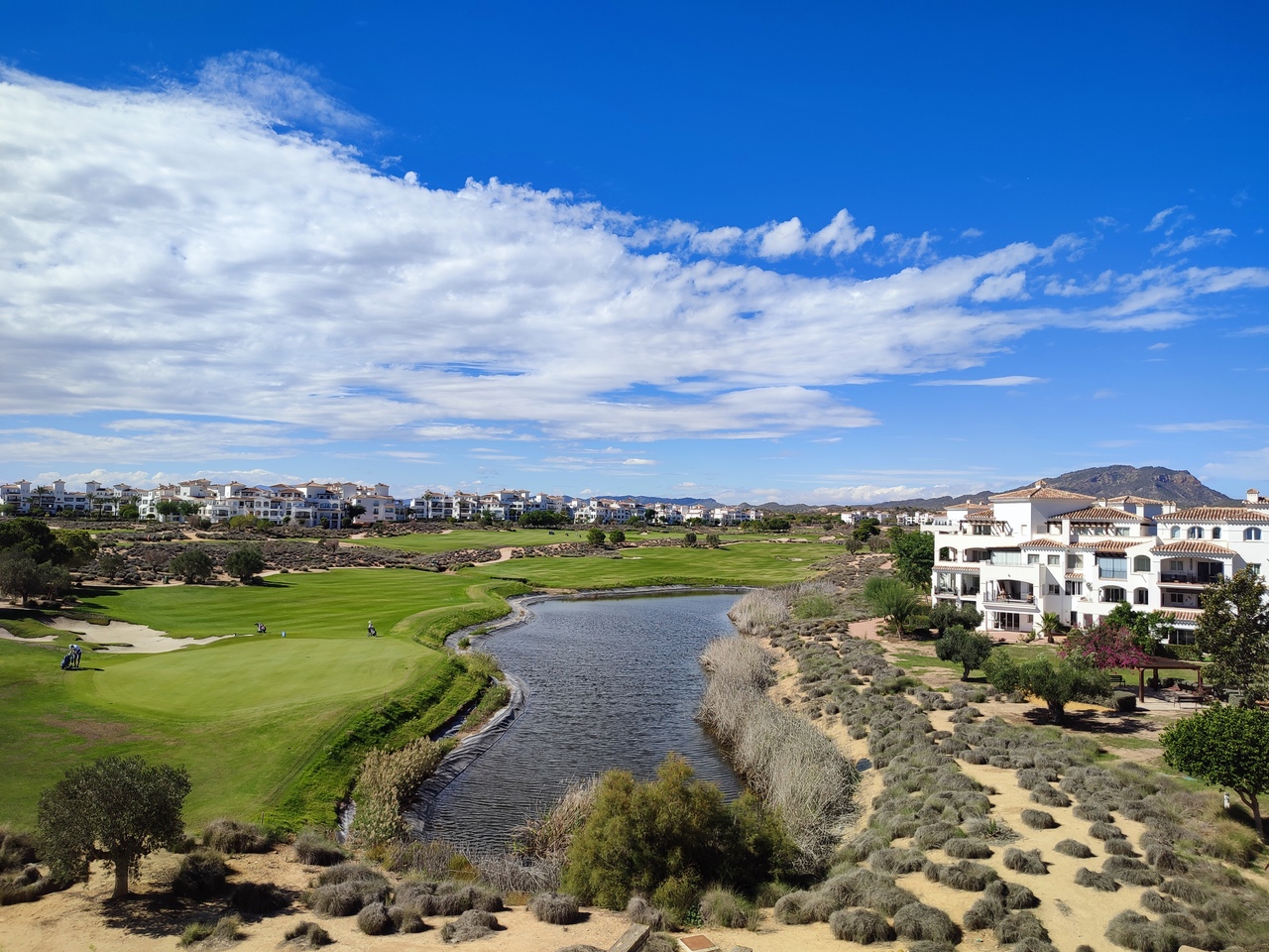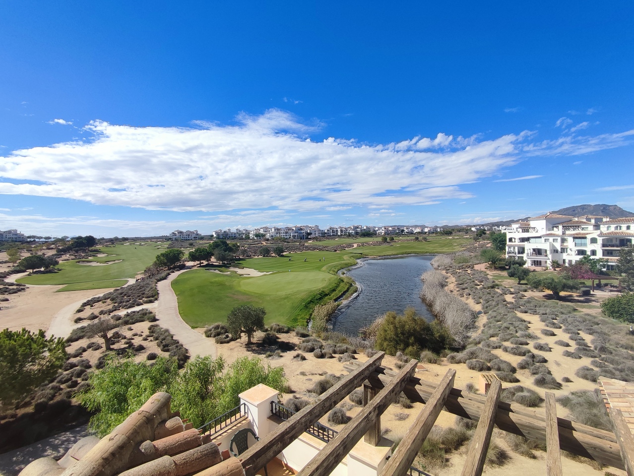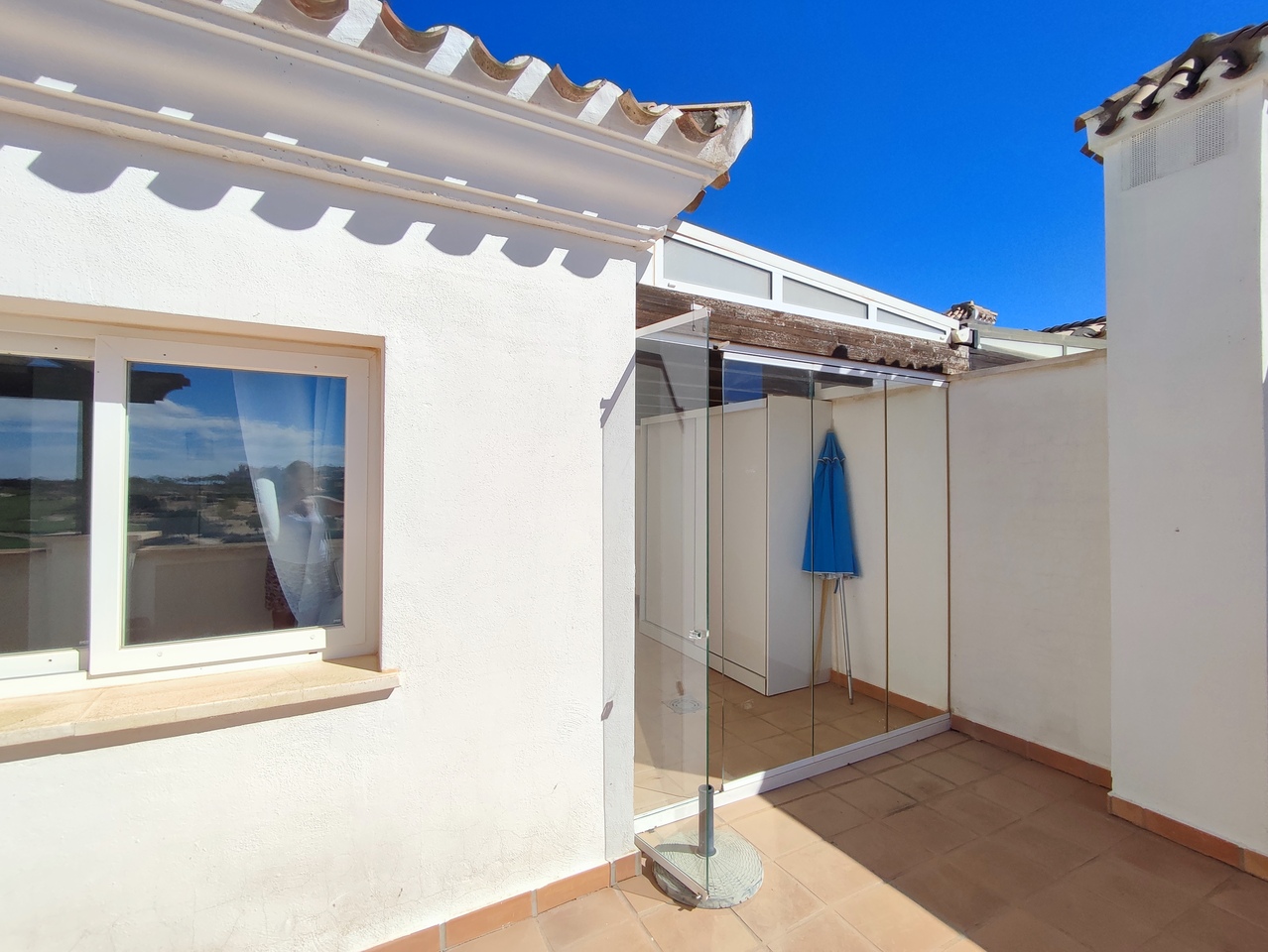 This penthouse has stunning views of the golf, lake and gardens. The long terrace is south west facing and perfect to capture the sun and sunsets. A section has been covered in to create extra storage but could also be renovated into an outside kitchen.There is air conditioning in the main lounge and ceiling fans in the 2 bedrooms.The picture windows provide plenty of light in the main living area.This penthouse can be renovated into open plan, please ask for examples.The apartment is being sold furnished minus personal possessions, complete with a private underground parking space and would make an ideal second or permanent home.The first thing that impresses you about Hacienda Riquelme Golf Resort is the wide-open spaces, the extensive gardens and the low-density construction, which create a relaxing environment to enjoy a very safe and peaceful life or holiday. The apartments are set out spaciously around the magnificent and challenging 18 hole golf course part of the Jack Nicklaus Golf Trail.All apartments have unlimited internet, air-conditioning for summer and heating for winter, private underground parking space and a communal lift.In the heart of the resort you will find the beautiful renovated Hacienda where you will find a supermarket, clubhouse, restaurant and bar. The inner court yard becomes the hive of entertainment in the Summer, whilst the large terrace set in the stunning gardens is open all year for “al fesco” dining and drinking.Facilities:Gated Community.24 hour security."El Cason" Bar, Restaurant, Clubhouse.Supermarket.Summer Entertainment.19 large community swimming pools.Communal gardens.Trees, 5 lakes.Wild flowers & local wildlife.Driving range.Tennis courts.Paddle tennis courts.Football / Basketball court.Outside gym area.Children's play areas.Hacienda Riquelme is very well connected by the main motorways. Murcia Airport (20 mins)Mar Menor beaches (15 mins)Mediterranean beaches (20 mins)For those who like historical buildings, architecture or a desire to shop, the lovely cities of Murcia and Cartagena provide plenty of entertainment. Murcia (30 mins)Cartagena (45 mins) Murcia Airport (20 mins)Near to the bustling popular village of Sucina with shops, restaurants, bars, chemist, supermarket and lots more (5 minutes)For more information on the apartments available please contact us.