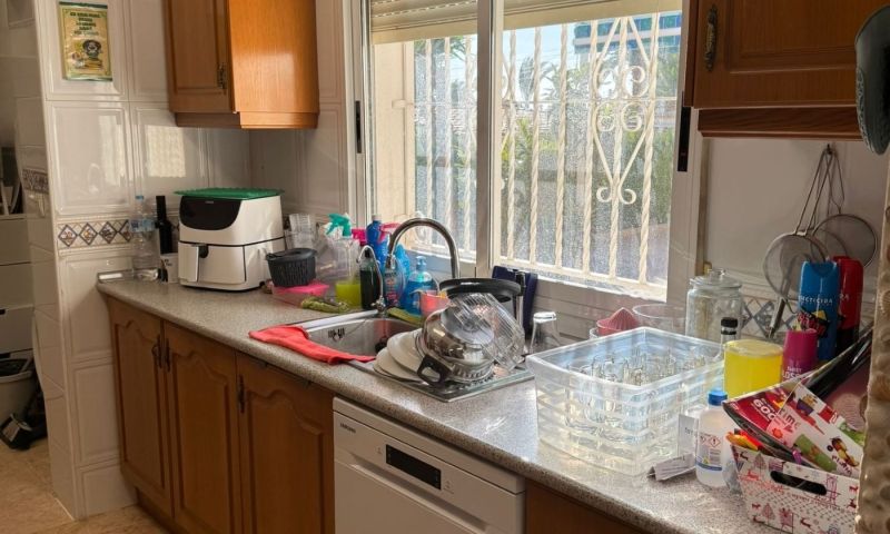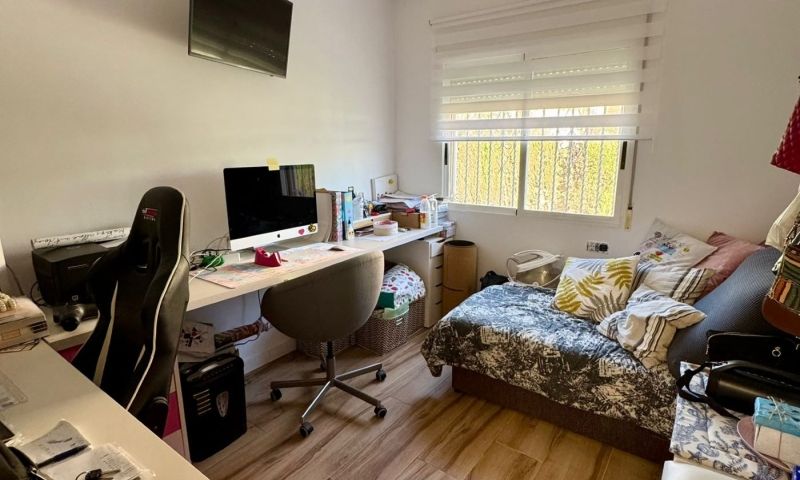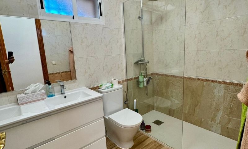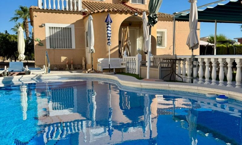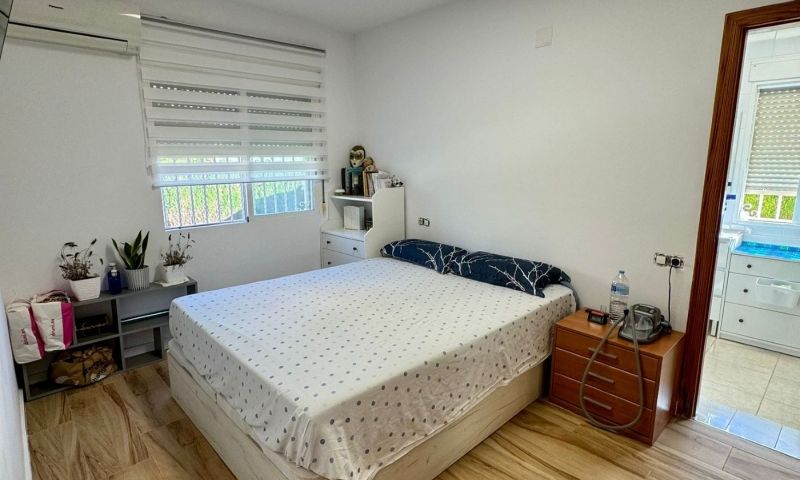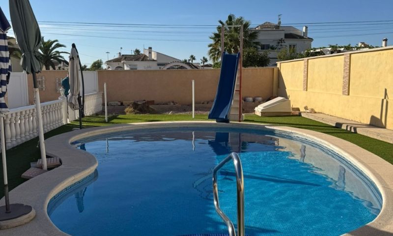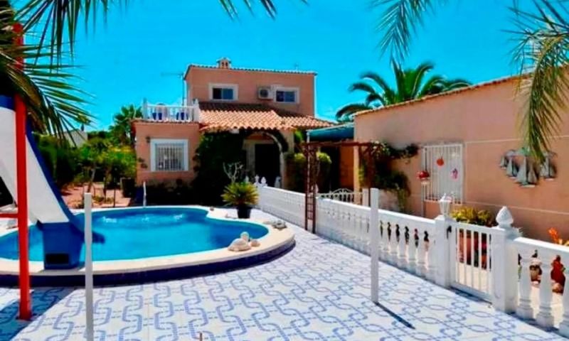 This spacious 5-bedroom, 3-bathroom villa offers 190 square meters of living space on a 500 square meter plot, perfect for families or those looking for extra space. The ground floor features a cozy living room, a kitchen, 2 bathrooms and 4 bedrooms, providing ample space for daily living.Upstairs, with its own private entrance from the garden, you will find a cozy living room, a kitchen, 1 bathroom and 1 bedroom with direct access to a solarium overlooking the pool, perfect for guests or an extended family.The property also includes a private garage, a swimming pool and a storage room. Located close to all amenities, it offers the convenience of nearby shops and restaurants, while being just a short walk from both the salt lake and La Mata Natural Park, combining peaceful nature with everyday convenience.