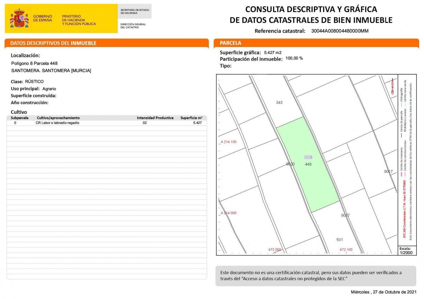 Rural land of 5,427m2 for sale in the Vereda Los Cacheros area in Santomera, Murcia. Rustic agrarian type, currently it is planted with lemon trees with traditional irrigation from the Acequia Zaraiche. Due to its dimensions, there is the possibility of building on the land.