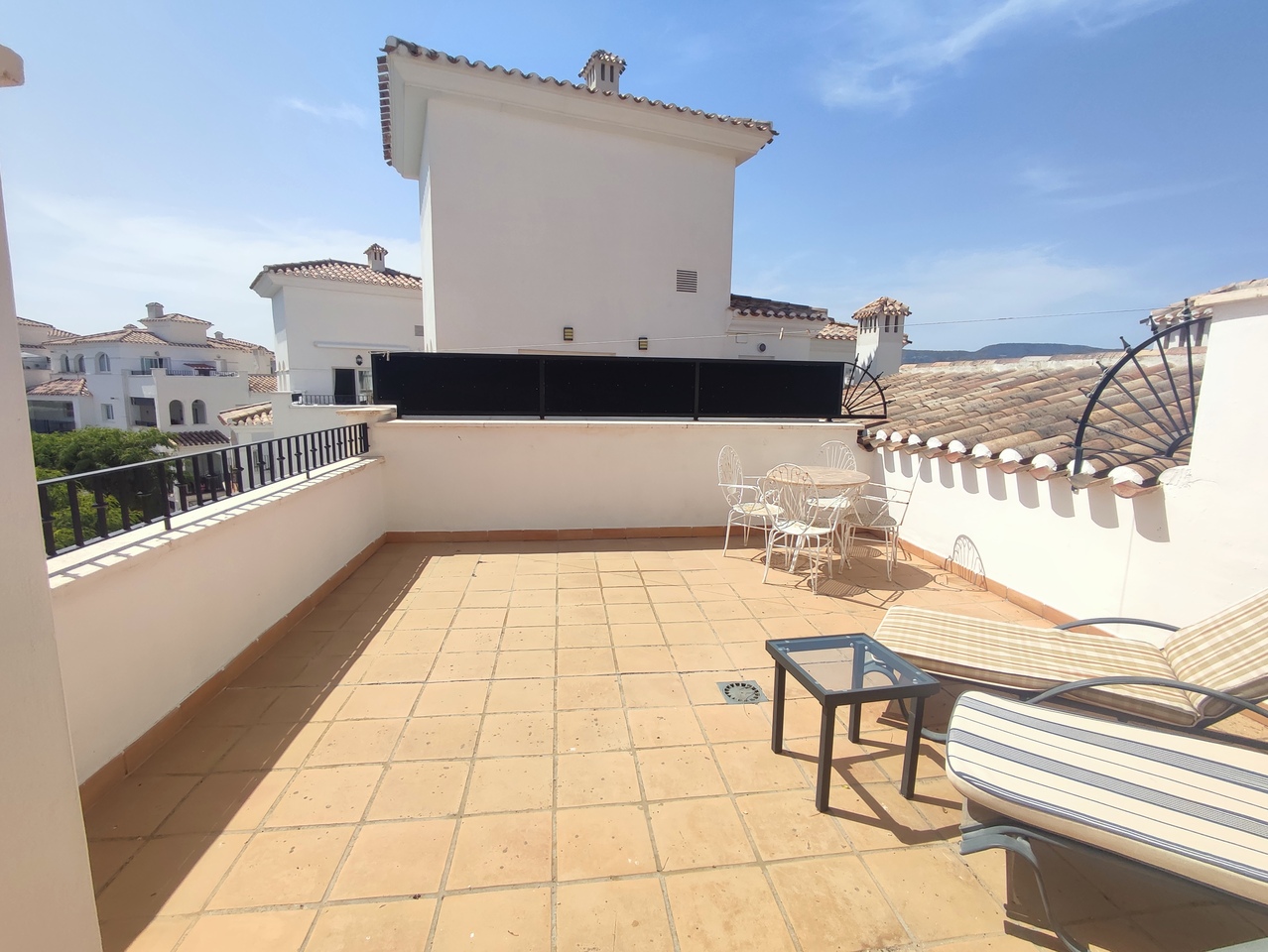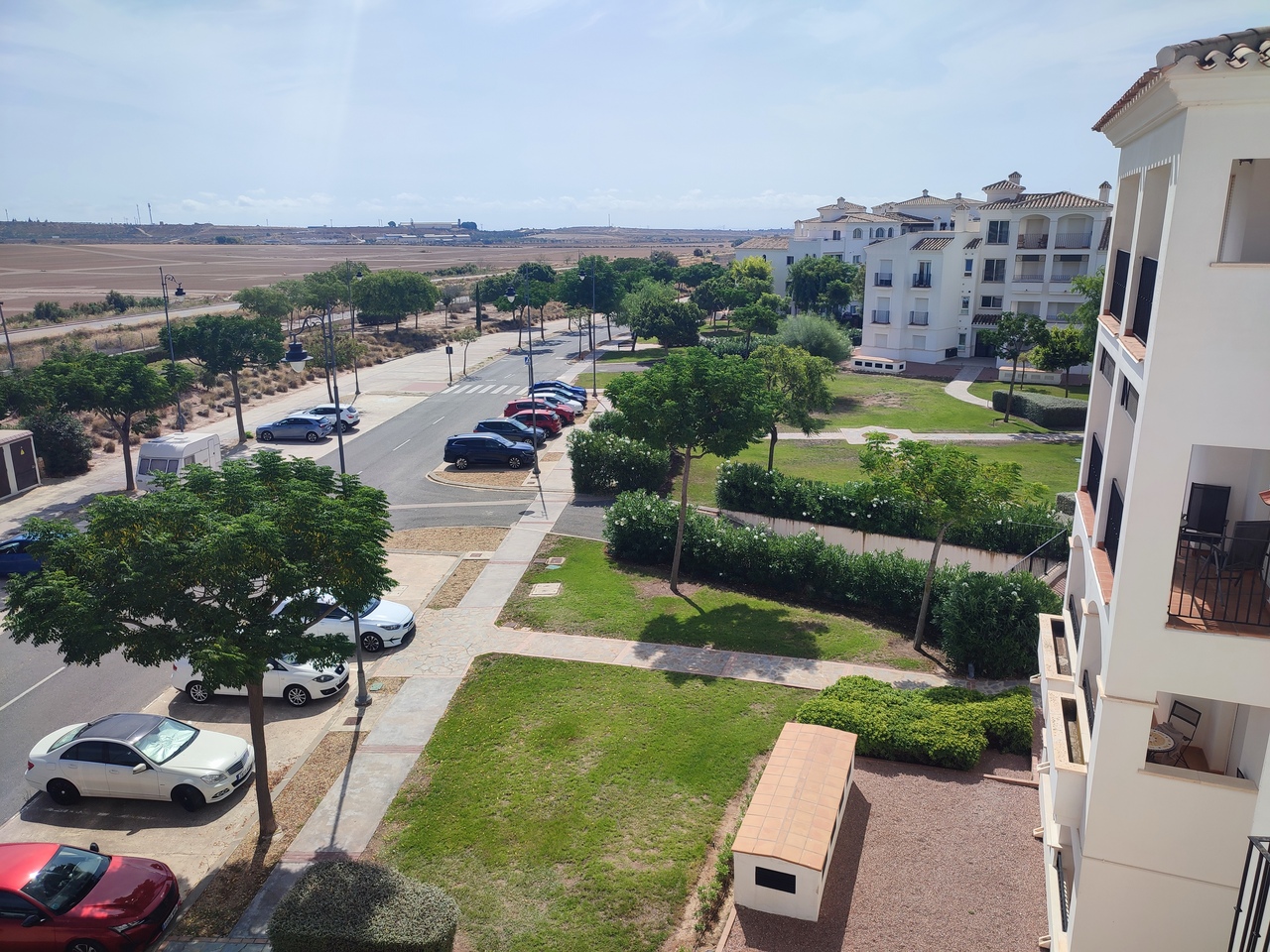 This curved wall design penthouse has bio fold patio doors opening to a large square sunny terrace with golf, lake and pool views. It is ready to be enjoyed as a holiday home or for permanent living.The apartment has a large underground parking space with a storage room.The first thing that impresses you about Hacienda Riquelme Golf Resort is the wide-open spaces, the extensive gardens and the low-density construction, which create a relaxing environment to enjoy a very safe and peaceful life or holiday. The apartments are set out spaciously around the magnificent and challenging 18 hole golf course part of the Jack Nicklaus Golf Trail.All apartments have unlimited internet, air-conditioning for summer and heating for winter, private underground parking space and a communal lift.In the heart of the resort you will find the beautiful renovated Hacienda where you will find a supermarket, clubhouse, restaurant and bar. The inner court yard becomes the hive of entertainment in the Summer, whilst the large terrace set in the stunning gardens is open all year for “al fesco” dining and drinking.Facilities:Gated Community.24 hour security."El Cason" Bar, Restaurant, Clubhouse. "Sips" Coffee ShopSupermarket.Summer Entertainment.19 large community swimming pools.Communal gardens.Trees, 5 lakes.Wild flowers & local wildlife.Driving range & Golf ShopTennis courts.Paddle tennis courts.Football / Basketball court.Outside gym area.Children's play areas.Hacienda Riquelme is very well connected by the main motorways. Murcia Airport (20 mins)Mar Menor beaches (15 mins)Mediterranean beaches (20 mins)For those who like historical buildings, architecture or a desire to shop, the lovely cities of Murcia and Cartagena provide plenty of entertainment. Murcia (30 mins)Cartagena (45 mins) Murcia Airport (20 mins)Near to the bustling popular village of Sucina with shops, restaurants, bars, chemist, supermarket and lots more (5 minutes)For more information on the apartments available please contact usi