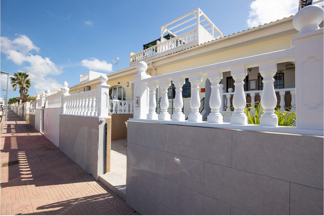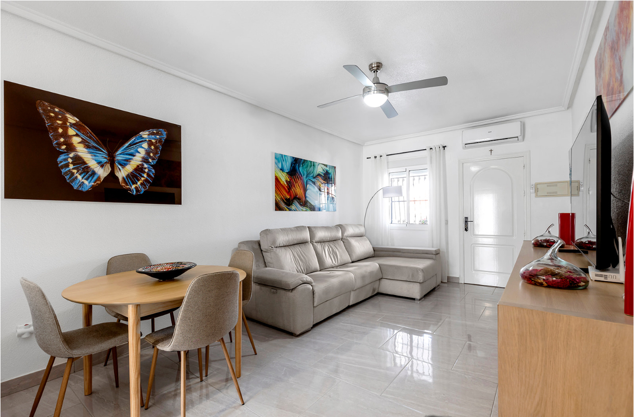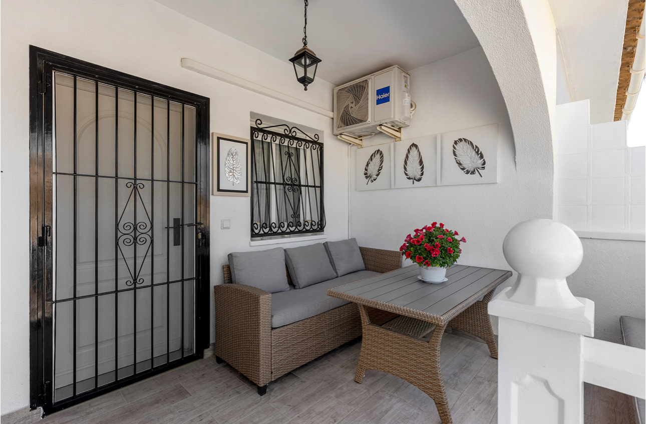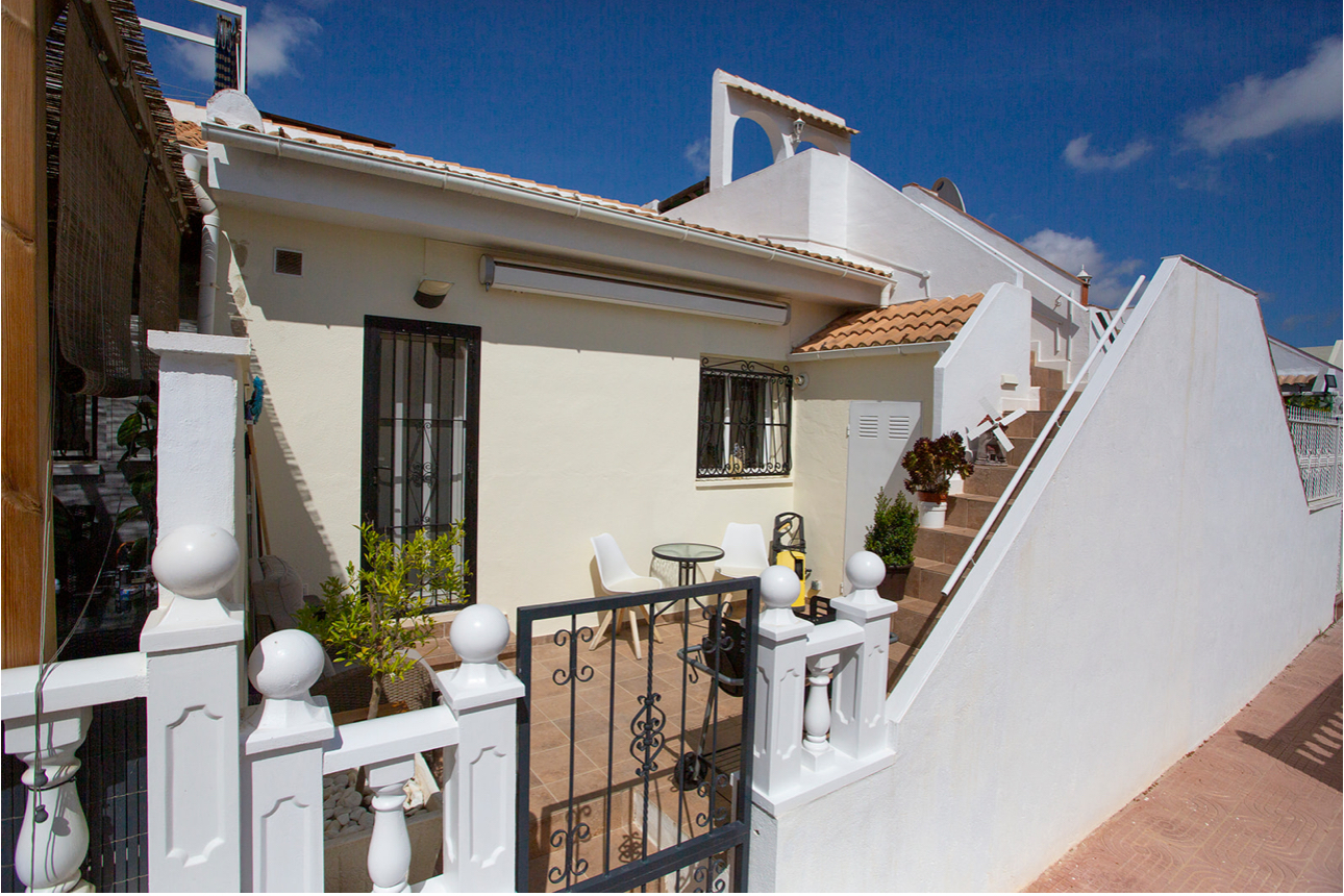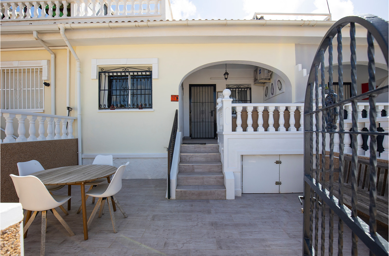 Charmerende rækkehus med solarium, fælles pool og to terrasser i Monteazul, BenijófarDette hyggelige rækkehus ligger i et af de mest fredelige og behagelige områder i Monteazul-urbanisationen i Benijófar. Med et bebygget areal på 65 m² ligger det på en grund på 105 m², hvilket giver en perfekt balance mellem komfort og udendørs plads.Når du kommer ind i huset, bliver du mødt af et moderne design, der maksimerer det naturlige lys og giver en følelse af rummelighed. Ejendommen har to lyse soveværelser, hvoraf det ene er en-suite, hvilket giver et ideelt niveau af privatliv til afslapning. De to badeværelser, hvoraf det ene har eget bad, er omhyggeligt designet med kvalitetsfinish, der giver en afslappende atmosfære.Hvad angår udendørsområderne, har huset to terrasser: en på forsiden, som er ideel til at nyde udsigten og til udendørs fritid, og en anden på bagsiden, som giver mere privatliv og ro. Derudover har ejendommen et solarium, som er perfekt til at nyde solen hele året rundt eller til at skabe et afslappende rum.Ejendommens vestlige orientering sikrer, at du kan nyde spektakulære solnedgange fra dit hjem. Monteazul-urbaniseringen er en meget stille enklave, omgivet af træer og store grønne områder, hvilket favoriserer et naturligt og fredfyldt miljø.Ejendommen har også adgang til en fælles swimmingpool, der er ideel til at nyde en forfriskende dukkert på varme sommerdage. Ejendommen er godt forbundet og giver nem adgang til alle de væsentlige faciliteter i Benijófar, men er alligevel langt nok væk fra stress og jag til at sikre total ro.Kort sagt er dette rækkehus et fremragende valg for dem, der leder efter livskvalitet, komfort og et afslappende og naturligt miljø, alt sammen med en privilegeret beliggenhed.