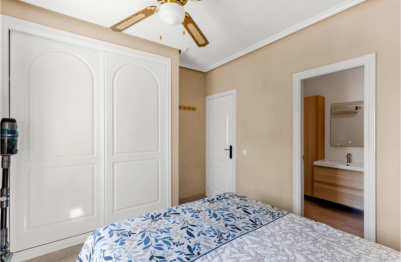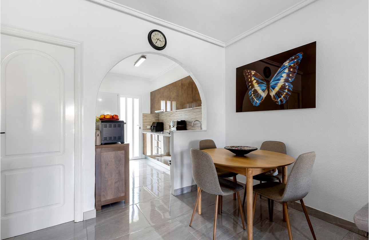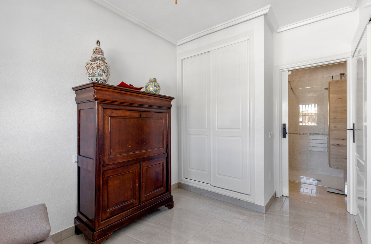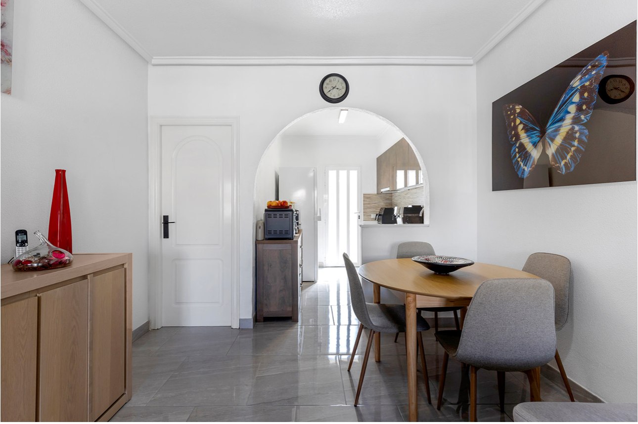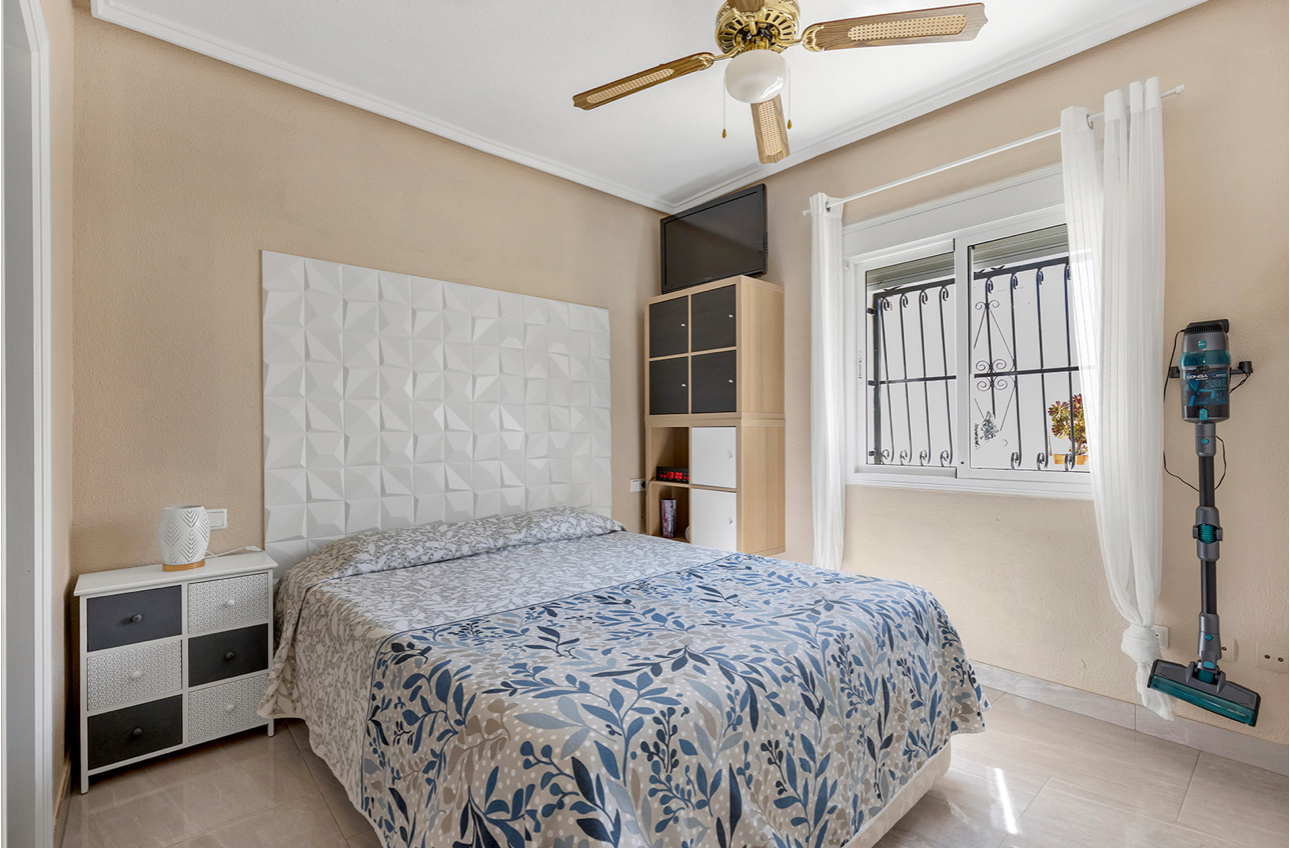 Charmerende rækkehus med solarium, fælles pool og to terrasser i Monteazul, BenijófarDette hyggelige rækkehus ligger i et af de mest fredelige og behagelige områder i Monteazul-urbanisationen i Benijófar. Med et bebygget areal på 65 m² ligger det på en grund på 105 m², hvilket giver en perfekt balance mellem komfort og udendørs plads.Når du kommer ind i huset, bliver du mødt af et moderne design, der maksimerer det naturlige lys og giver en følelse af rummelighed. Ejendommen har to lyse soveværelser, hvoraf det ene er en-suite, hvilket giver et ideelt niveau af privatliv til afslapning. De to badeværelser, hvoraf det ene har eget bad, er omhyggeligt designet med kvalitetsfinish, der giver en afslappende atmosfære.Hvad angår udendørsområderne, har huset to terrasser: en på forsiden, som er ideel til at nyde udsigten og til udendørs fritid, og en anden på bagsiden, som giver mere privatliv og ro. Derudover har ejendommen et solarium, som er perfekt til at nyde solen hele året rundt eller til at skabe et afslappende rum.Ejendommens vestlige orientering sikrer, at du kan nyde spektakulære solnedgange fra dit hjem. Monteazul-urbaniseringen er en meget stille enklave, omgivet af træer og store grønne områder, hvilket favoriserer et naturligt og fredfyldt miljø.Ejendommen har også adgang til en fælles swimmingpool, der er ideel til at nyde en forfriskende dukkert på varme sommerdage. Ejendommen er godt forbundet og giver nem adgang til alle de væsentlige faciliteter i Benijófar, men er alligevel langt nok væk fra stress og jag til at sikre total ro.Kort sagt er dette rækkehus et fremragende valg for dem, der leder efter livskvalitet, komfort og et afslappende og naturligt miljø, alt sammen med en privilegeret beliggenhed.