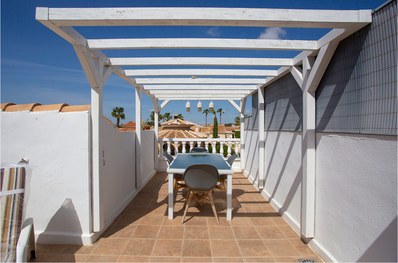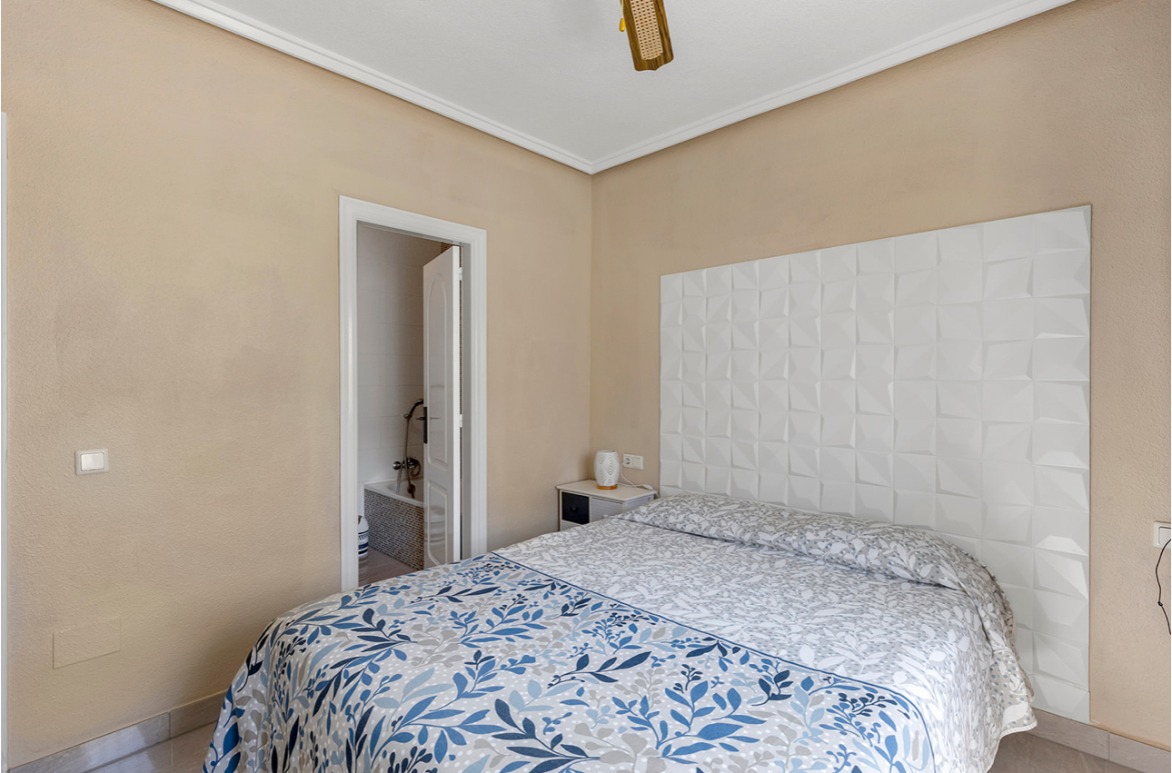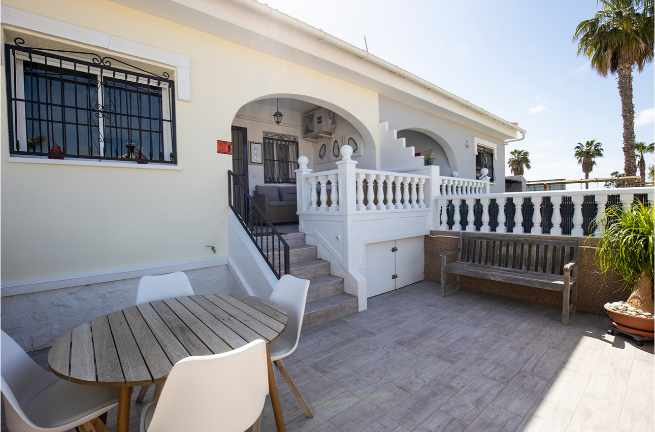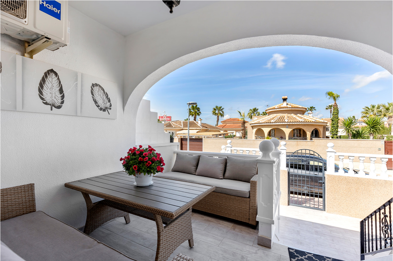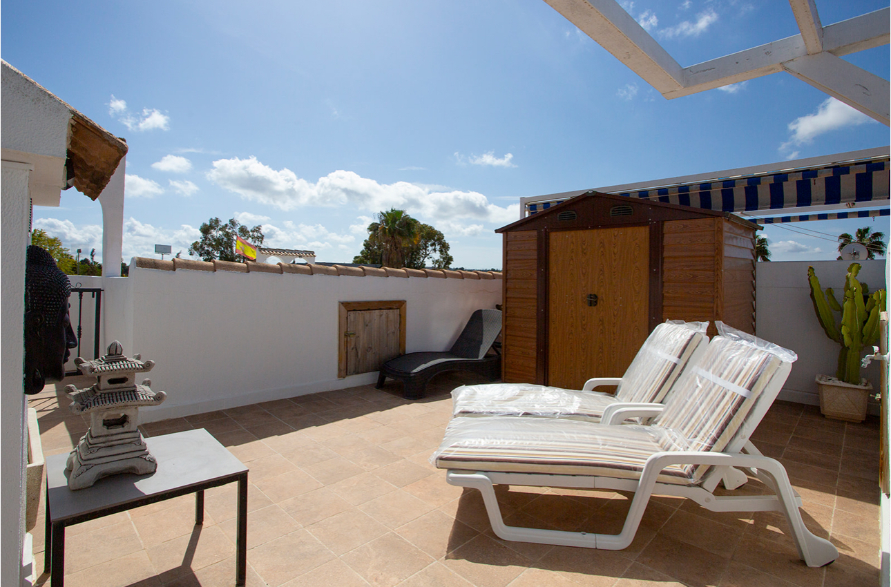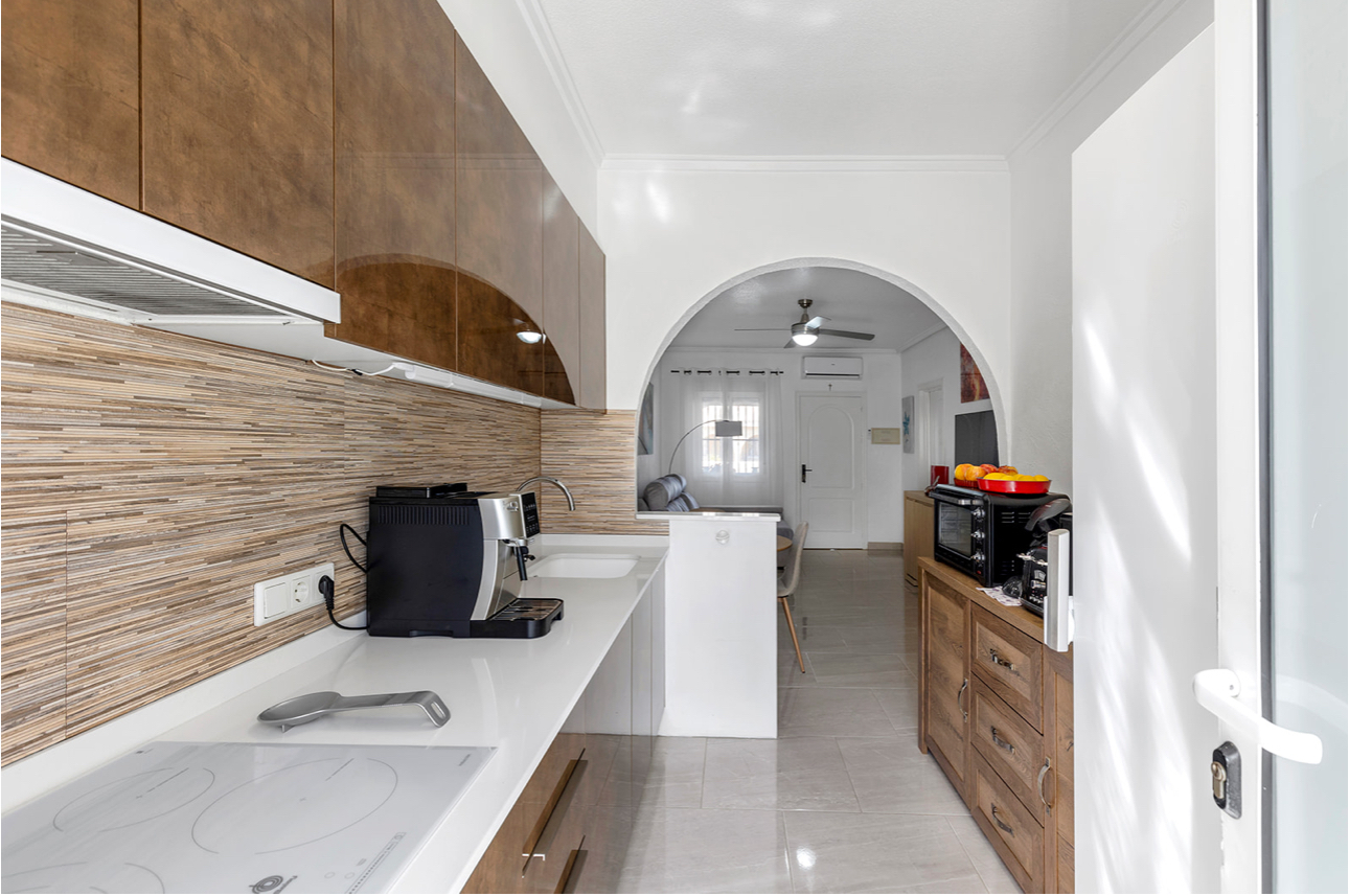 Charmerende rækkehus med solarium, fælles pool og to terrasser i Monteazul, BenijófarDette hyggelige rækkehus ligger i et af de mest fredelige og behagelige områder i Monteazul-urbanisationen i Benijófar. Med et bebygget areal på 65 m² ligger det på en grund på 105 m², hvilket giver en perfekt balance mellem komfort og udendørs plads.Når du kommer ind i huset, bliver du mødt af et moderne design, der maksimerer det naturlige lys og giver en følelse af rummelighed. Ejendommen har to lyse soveværelser, hvoraf det ene er en-suite, hvilket giver et ideelt niveau af privatliv til afslapning. De to badeværelser, hvoraf det ene har eget bad, er omhyggeligt designet med kvalitetsfinish, der giver en afslappende atmosfære.Hvad angår udendørsområderne, har huset to terrasser: en på forsiden, som er ideel til at nyde udsigten og til udendørs fritid, og en anden på bagsiden, som giver mere privatliv og ro. Derudover har ejendommen et solarium, som er perfekt til at nyde solen hele året rundt eller til at skabe et afslappende rum.Ejendommens vestlige orientering sikrer, at du kan nyde spektakulære solnedgange fra dit hjem. Monteazul-urbaniseringen er en meget stille enklave, omgivet af træer og store grønne områder, hvilket favoriserer et naturligt og fredfyldt miljø.Ejendommen har også adgang til en fælles swimmingpool, der er ideel til at nyde en forfriskende dukkert på varme sommerdage. Ejendommen er godt forbundet og giver nem adgang til alle de væsentlige faciliteter i Benijófar, men er alligevel langt nok væk fra stress og jag til at sikre total ro.Kort sagt er dette rækkehus et fremragende valg for dem, der leder efter livskvalitet, komfort og et afslappende og naturligt miljø, alt sammen med en privilegeret beliggenhed.