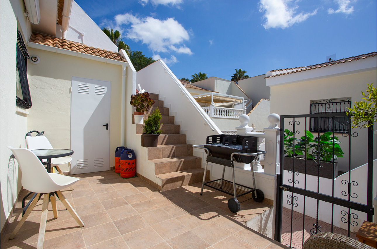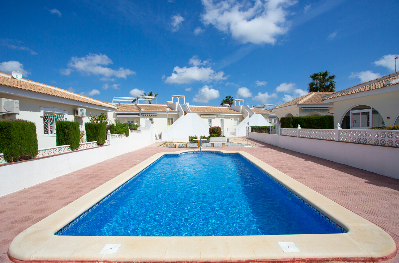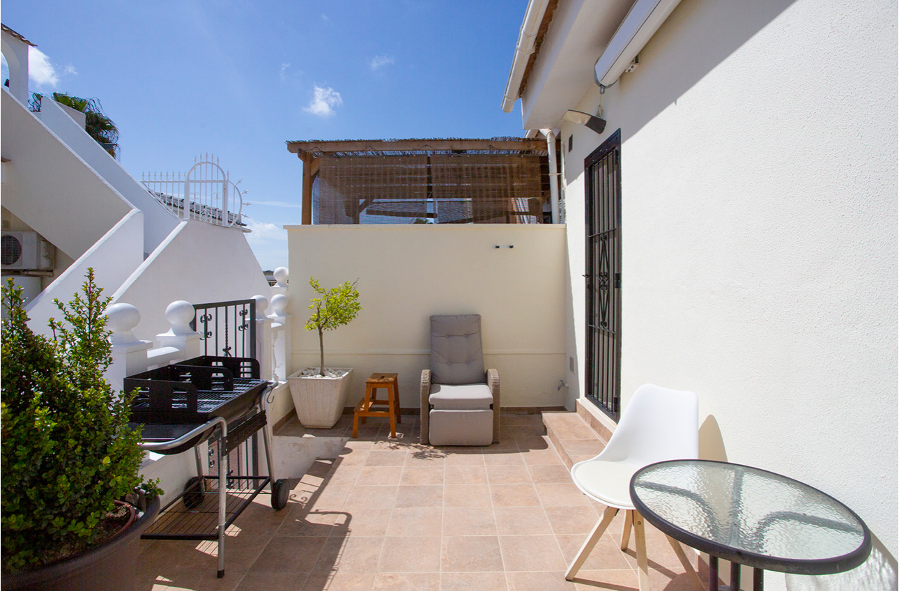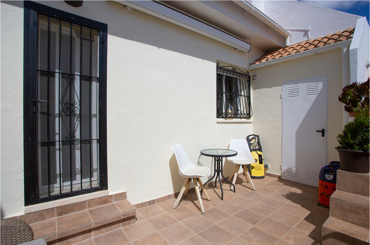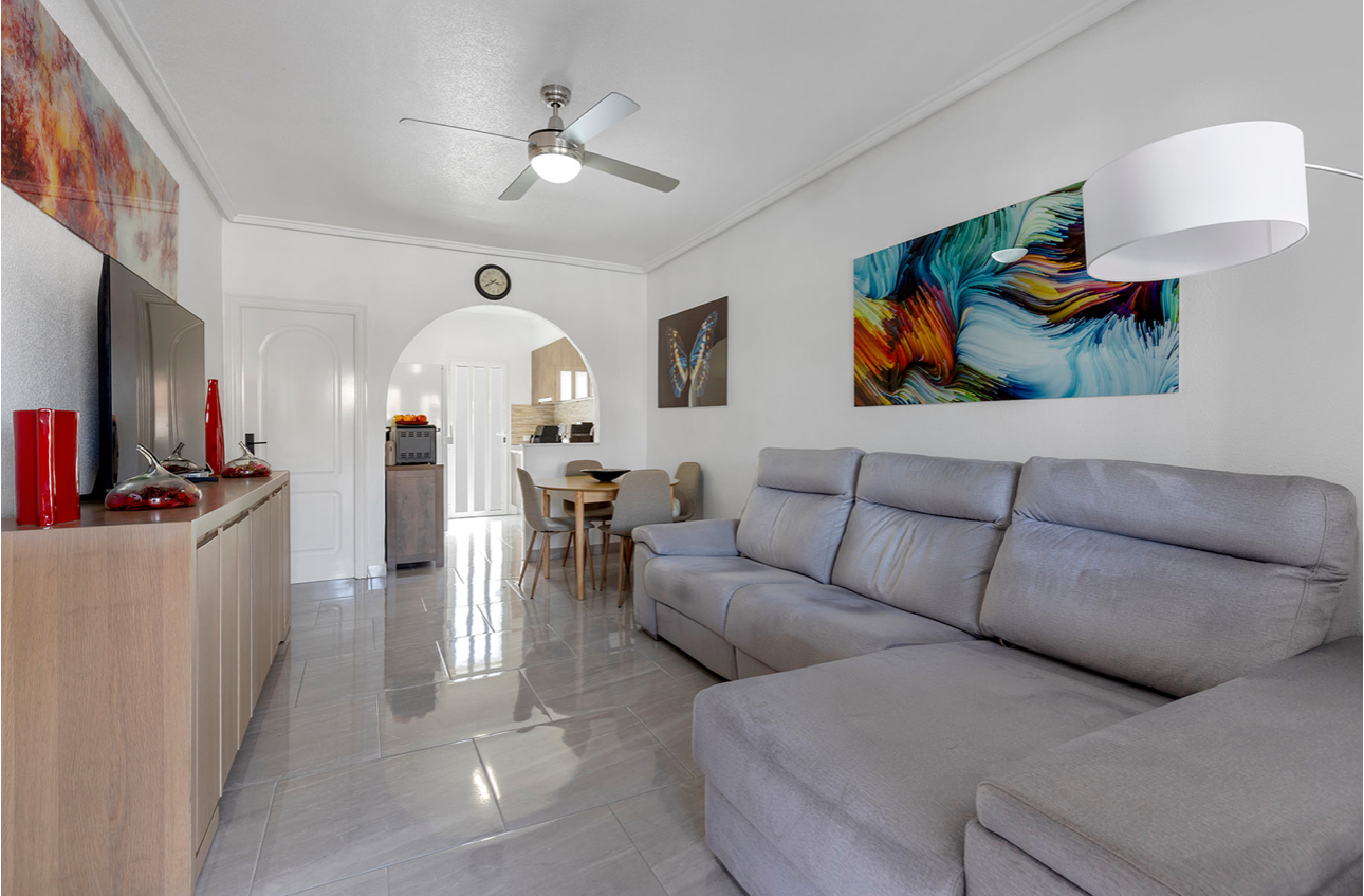 Charmerende rækkehus med solarium, fælles pool og to terrasser i Monteazul, BenijófarDette hyggelige rækkehus ligger i et af de mest fredelige og behagelige områder i Monteazul-urbanisationen i Benijófar. Med et bebygget areal på 65 m² ligger det på en grund på 105 m², hvilket giver en perfekt balance mellem komfort og udendørs plads.Når du kommer ind i huset, bliver du mødt af et moderne design, der maksimerer det naturlige lys og giver en følelse af rummelighed. Ejendommen har to lyse soveværelser, hvoraf det ene er en-suite, hvilket giver et ideelt niveau af privatliv til afslapning. De to badeværelser, hvoraf det ene har eget bad, er omhyggeligt designet med kvalitetsfinish, der giver en afslappende atmosfære.Hvad angår udendørsområderne, har huset to terrasser: en på forsiden, som er ideel til at nyde udsigten og til udendørs fritid, og en anden på bagsiden, som giver mere privatliv og ro. Derudover har ejendommen et solarium, som er perfekt til at nyde solen hele året rundt eller til at skabe et afslappende rum.Ejendommens vestlige orientering sikrer, at du kan nyde spektakulære solnedgange fra dit hjem. Monteazul-urbaniseringen er en meget stille enklave, omgivet af træer og store grønne områder, hvilket favoriserer et naturligt og fredfyldt miljø.Ejendommen har også adgang til en fælles swimmingpool, der er ideel til at nyde en forfriskende dukkert på varme sommerdage. Ejendommen er godt forbundet og giver nem adgang til alle de væsentlige faciliteter i Benijófar, men er alligevel langt nok væk fra stress og jag til at sikre total ro.Kort sagt er dette rækkehus et fremragende valg for dem, der leder efter livskvalitet, komfort og et afslappende og naturligt miljø, alt sammen med en privilegeret beliggenhed.