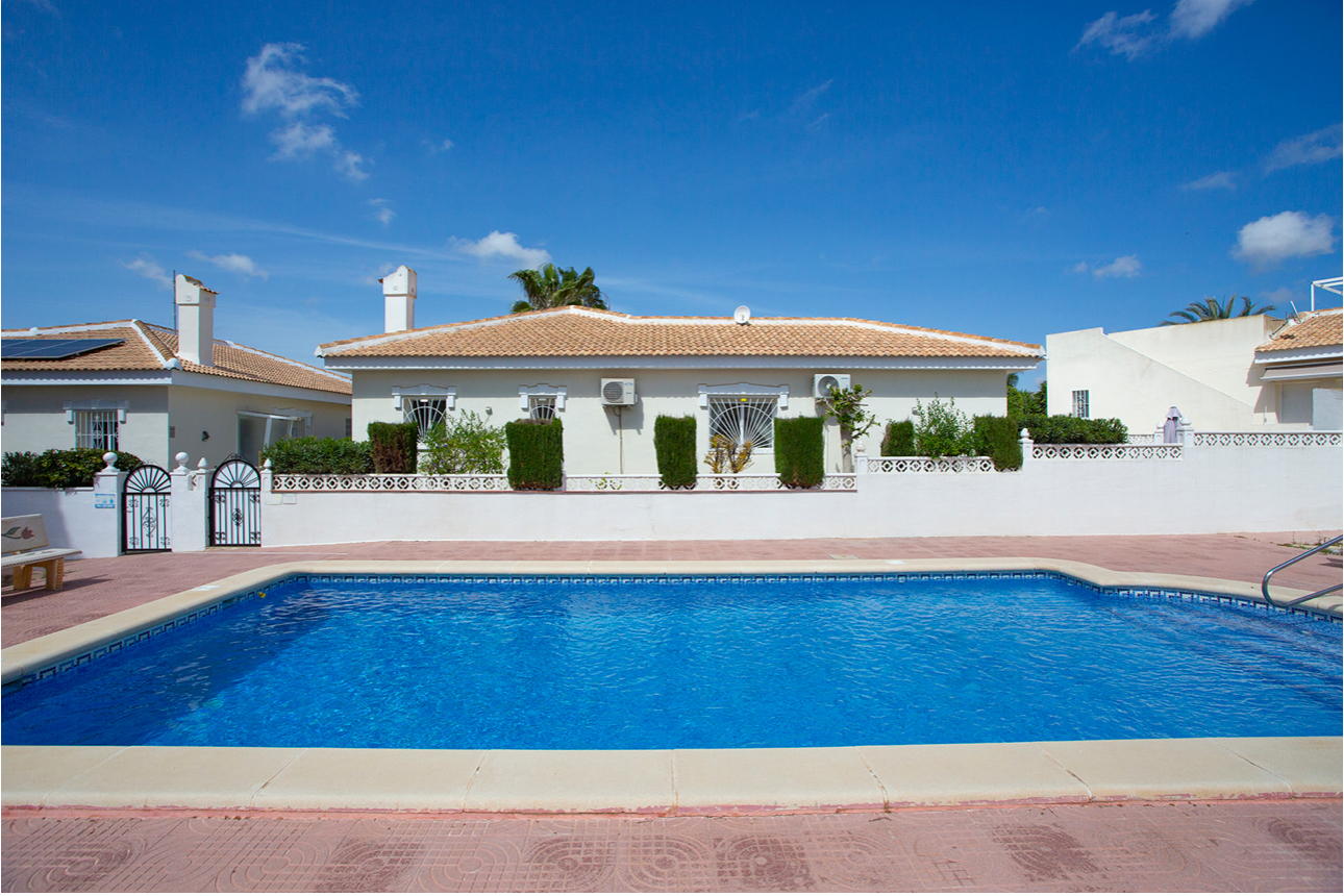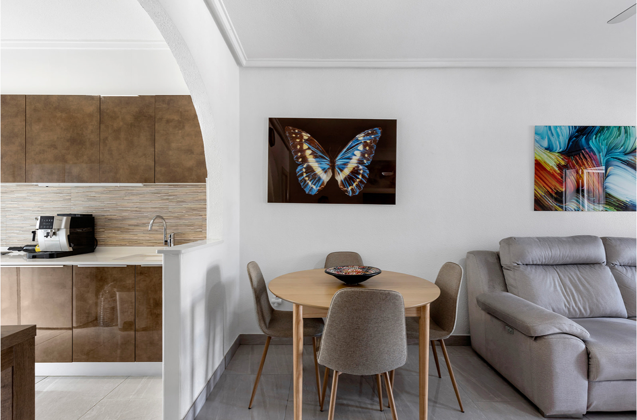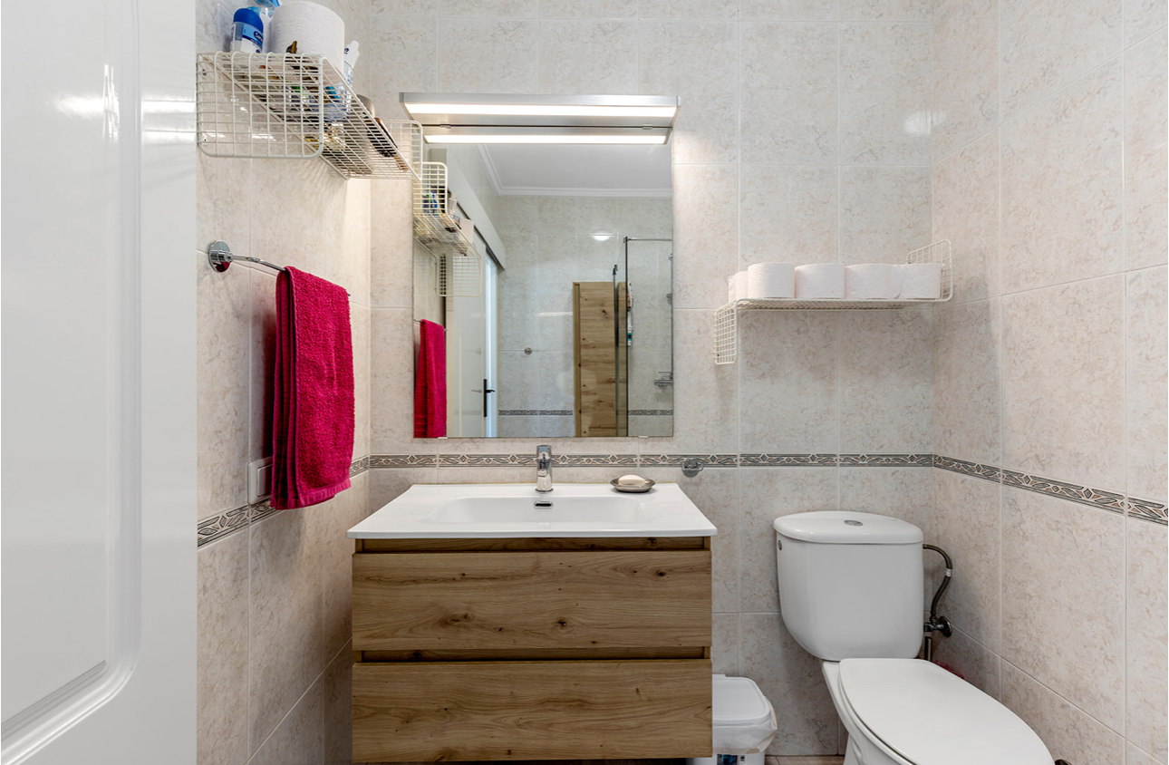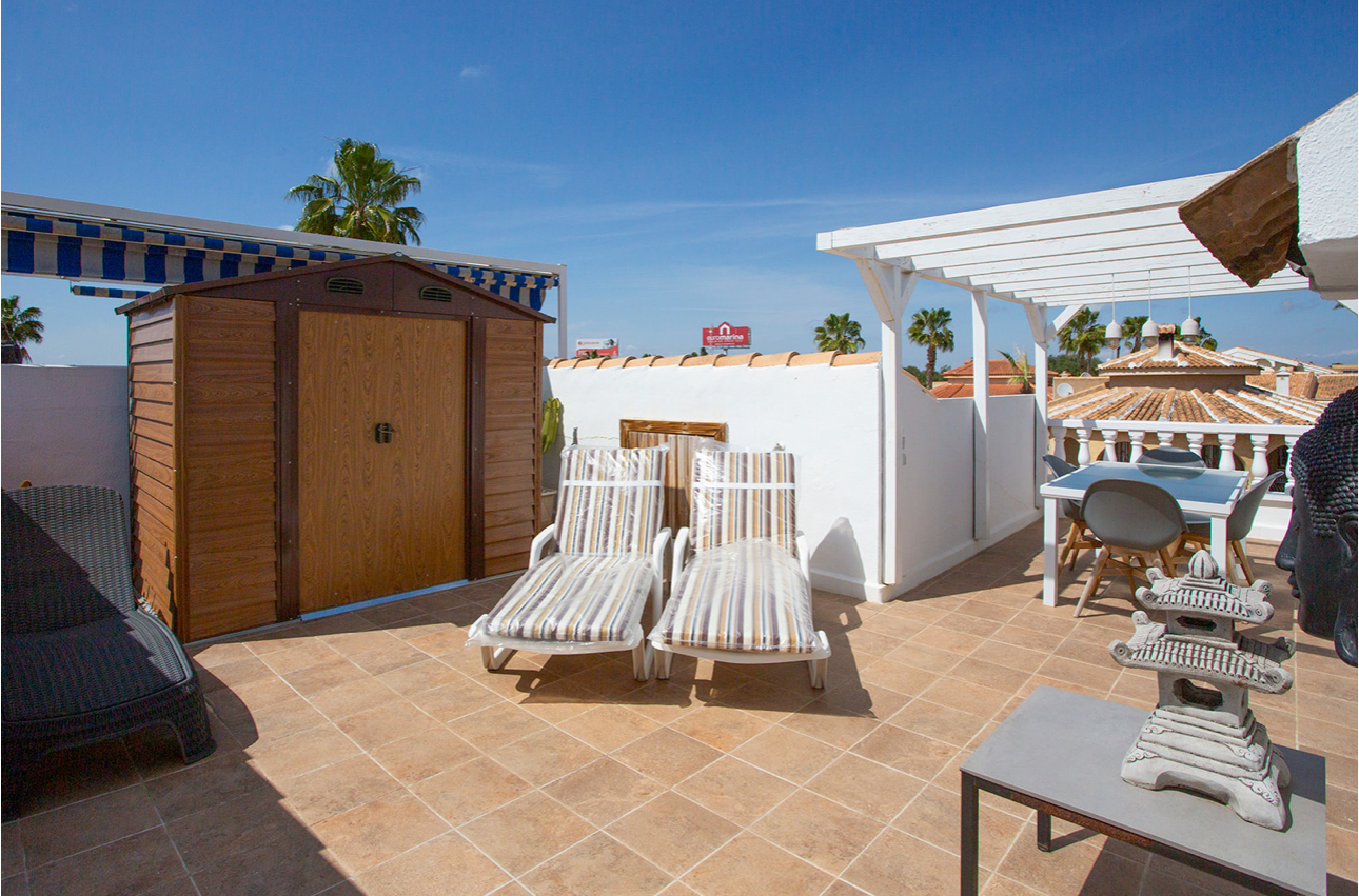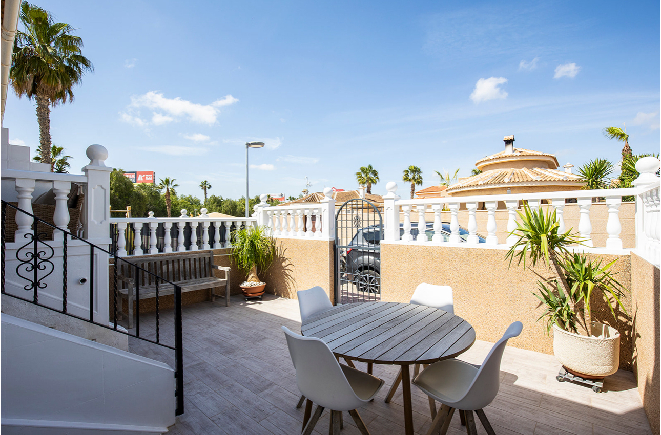Charmerende rækkehus med solarium, fælles pool og to terrasser i Monteazul, BenijófarDette hyggelige rækkehus ligger i et af de mest fredelige og behagelige områder i Monteazul-urbanisationen i Benijófar. Med et bebygget areal på 65 m² ligger det på en grund på 105 m², hvilket giver en perfekt balance mellem komfort og udendørs plads.Når du kommer ind i huset, bliver du mødt af et moderne design, der maksimerer det naturlige lys og giver en følelse af rummelighed. Ejendommen har to lyse soveværelser, hvoraf det ene er en-suite, hvilket giver et ideelt niveau af privatliv til afslapning. De to badeværelser, hvoraf det ene har eget bad, er omhyggeligt designet med kvalitetsfinish, der giver en afslappende atmosfære.Hvad angår udendørsområderne, har huset to terrasser: en på forsiden, som er ideel til at nyde udsigten og til udendørs fritid, og en anden på bagsiden, som giver mere privatliv og ro. Derudover har ejendommen et solarium, som er perfekt til at nyde solen hele året rundt eller til at skabe et afslappende rum.Ejendommens vestlige orientering sikrer, at du kan nyde spektakulære solnedgange fra dit hjem. Monteazul-urbaniseringen er en meget stille enklave, omgivet af træer og store grønne områder, hvilket favoriserer et naturligt og fredfyldt miljø.Ejendommen har også adgang til en fælles swimmingpool, der er ideel til at nyde en forfriskende dukkert på varme sommerdage. Ejendommen er godt forbundet og giver nem adgang til alle de væsentlige faciliteter i Benijófar, men er alligevel langt nok væk fra stress og jag til at sikre total ro.Kort sagt er dette rækkehus et fremragende valg for dem, der leder efter livskvalitet, komfort og et afslappende og naturligt miljø, alt sammen med en privilegeret beliggenhed.