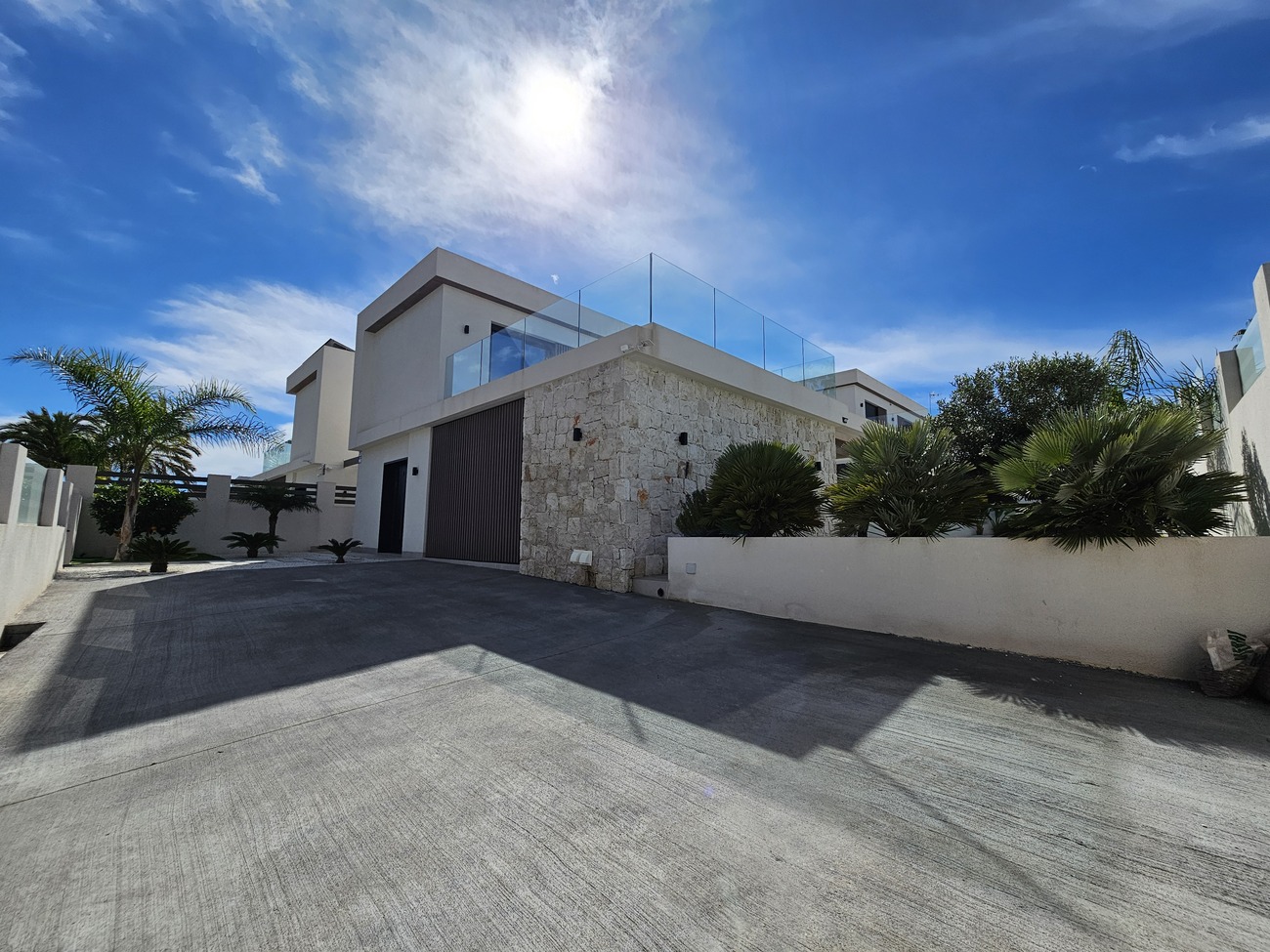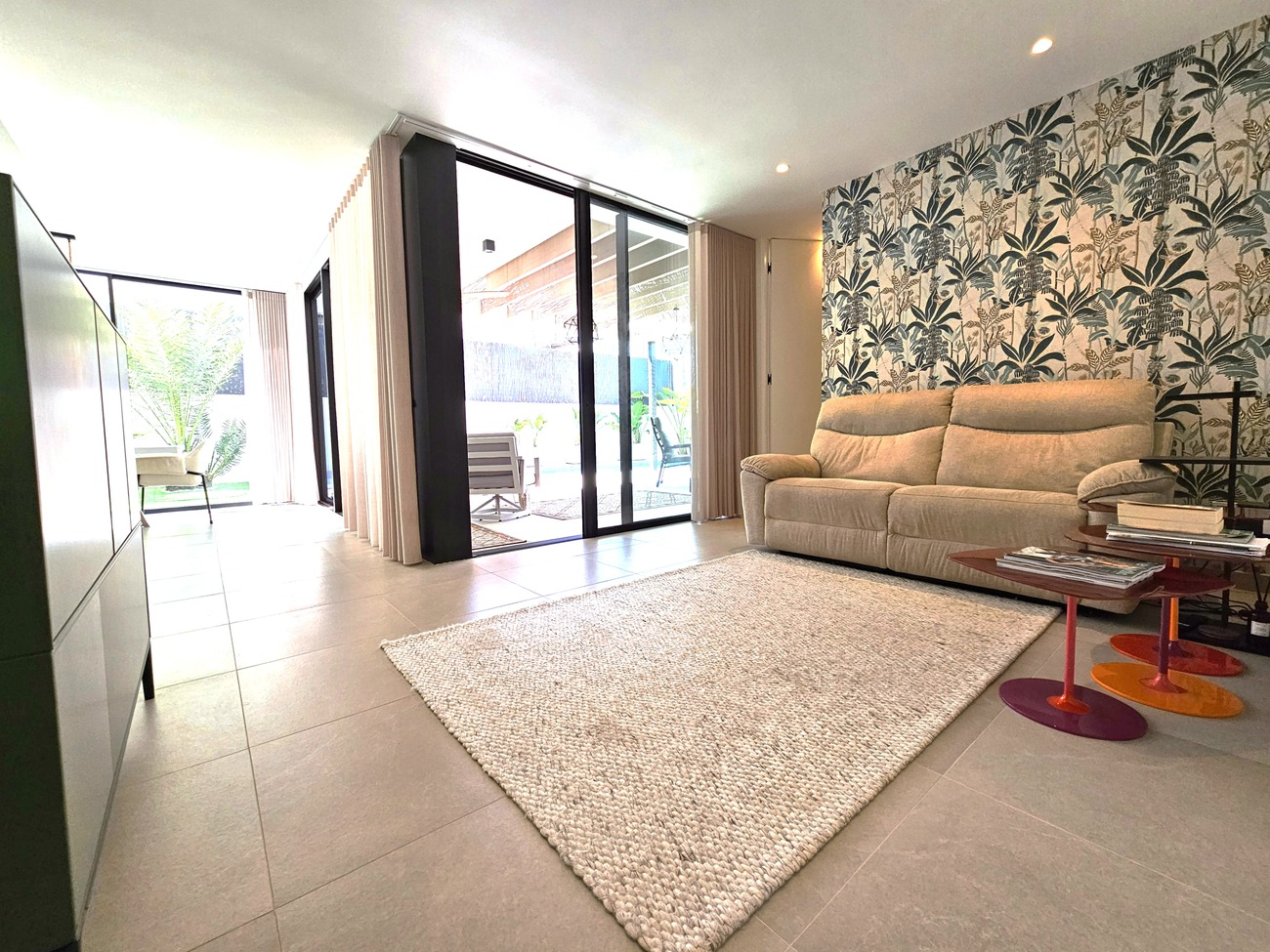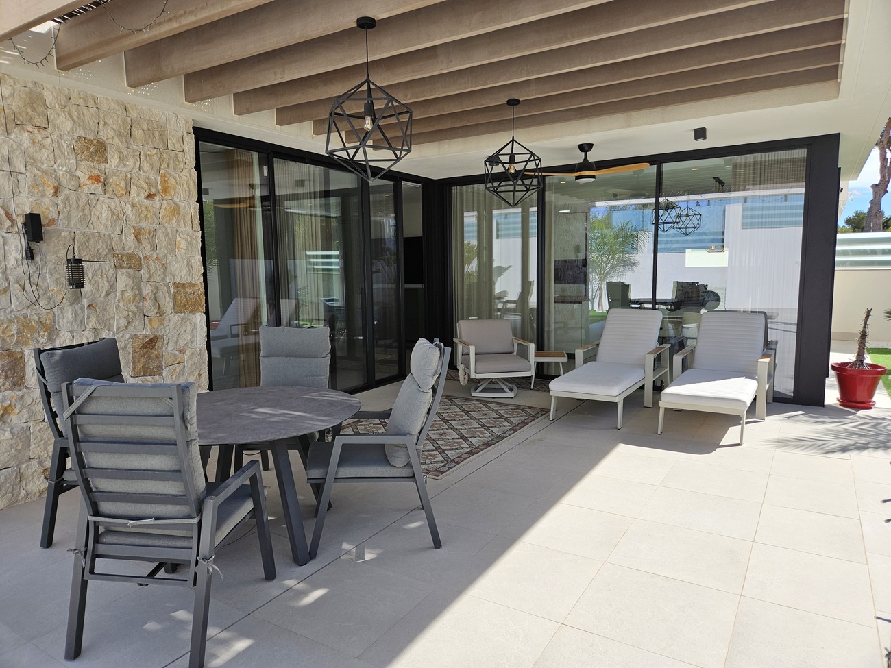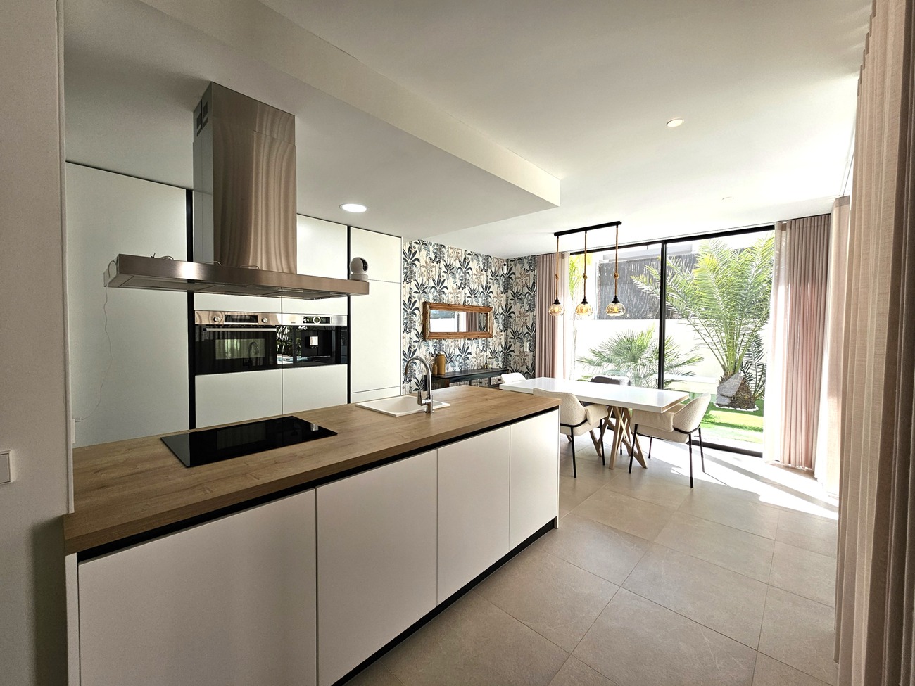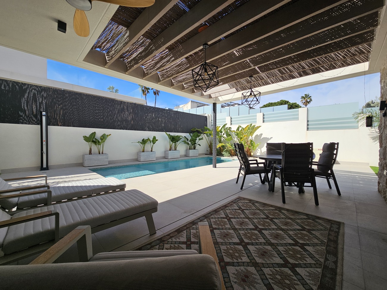 Prepare to be captivated by this stunning, almost-new property, built in 2022, and designed for modern living and effortless enjoyment! Boasting a meticulously planned layout, this partly furnished home offers 132M² of beautifully constructed space on a generous 359M² plot, complemented by a sprawling 62M² terrace perfect for soaking up the sun. Imagine lounging by your private 8x4 heated pool illuminated by LED lights, while enjoying the eco-friendly benefits of solar panels that drastically reduce your electricity bills. From the automated parking door and electric blinds to the state-of-the-art security system (interior and exterior), no detail has been overlooked. With features like ducted air conditioning, Bosch white goods, and underfloor heating in the bathrooms, comfort and luxury are paramount. Enjoy the privacy of your artificial grass lawn, framed by natural stone walls, fruit trees, and lush palm trees, all kept thriving by an automatic irrigation system. This is more than a home; it's a lifestyle waiting to be embraced!