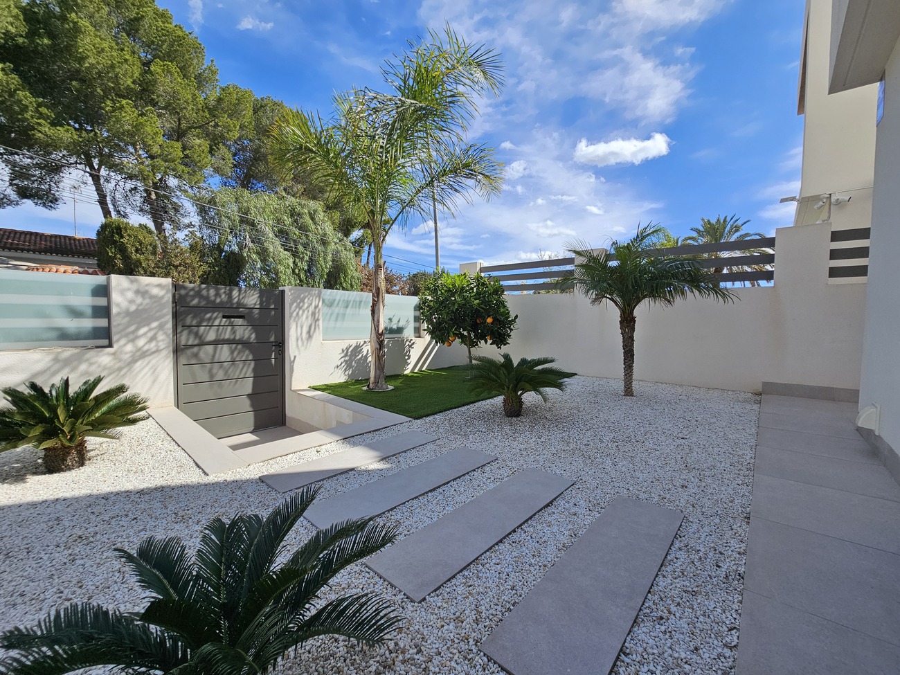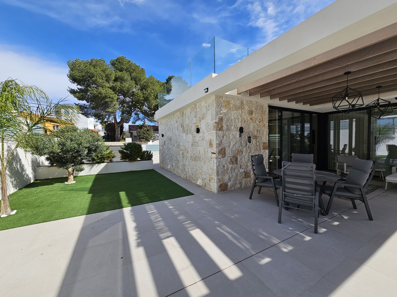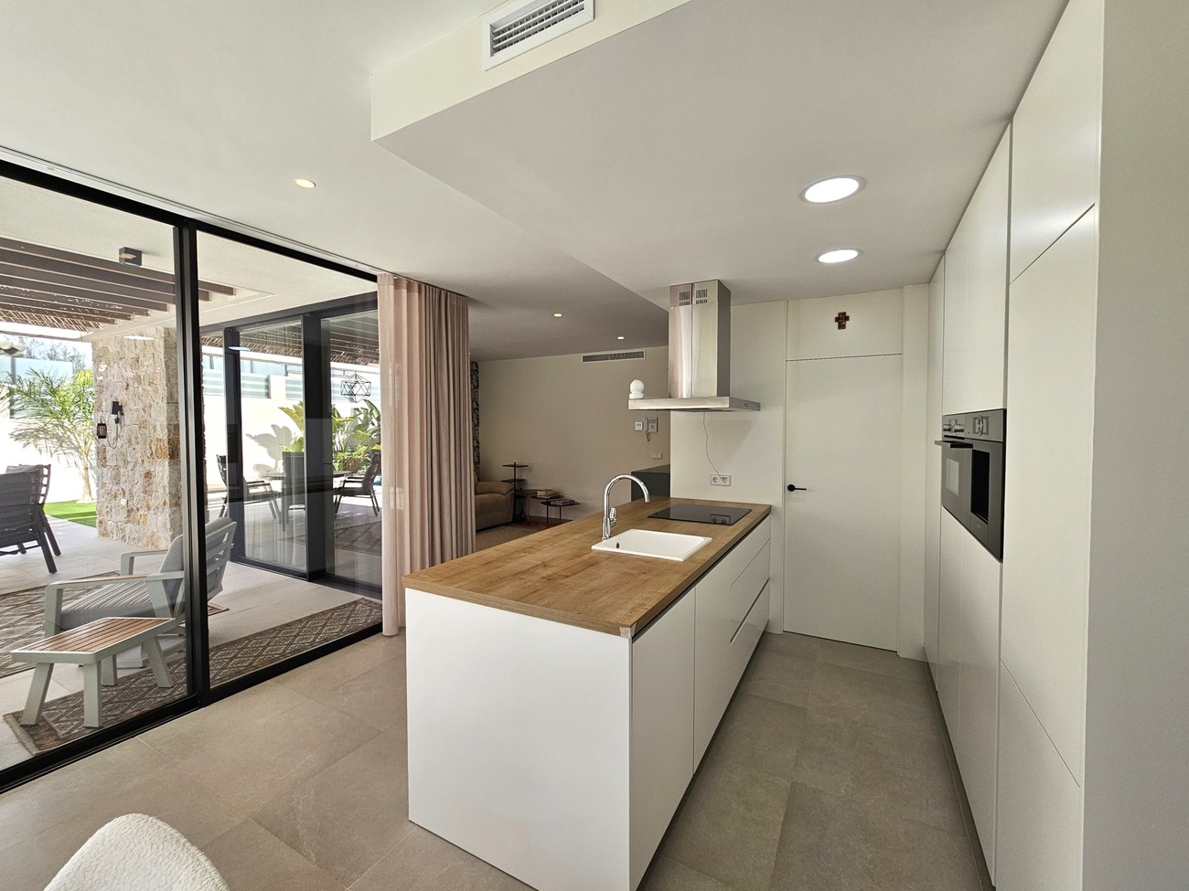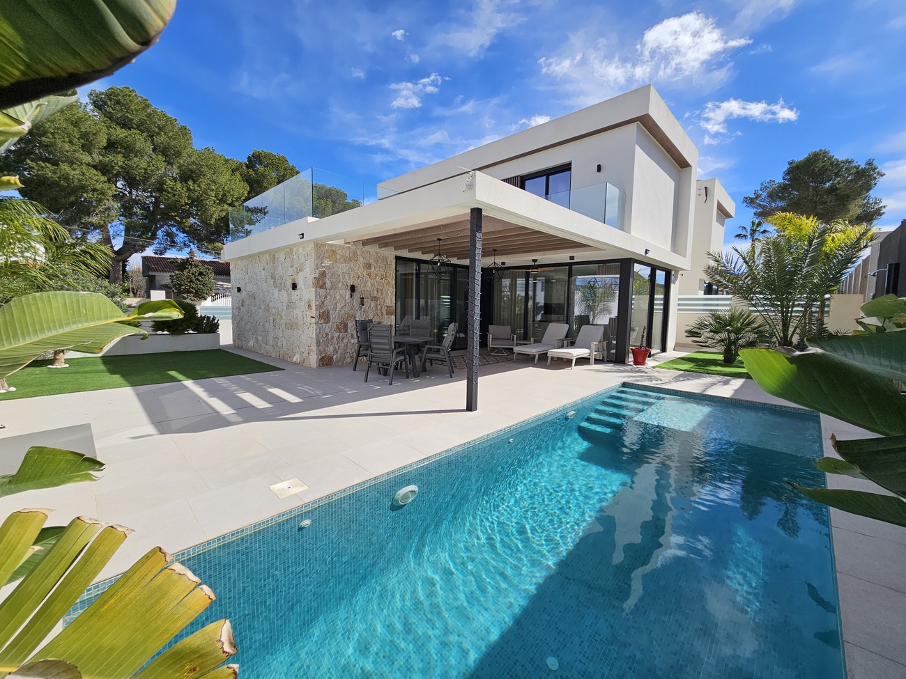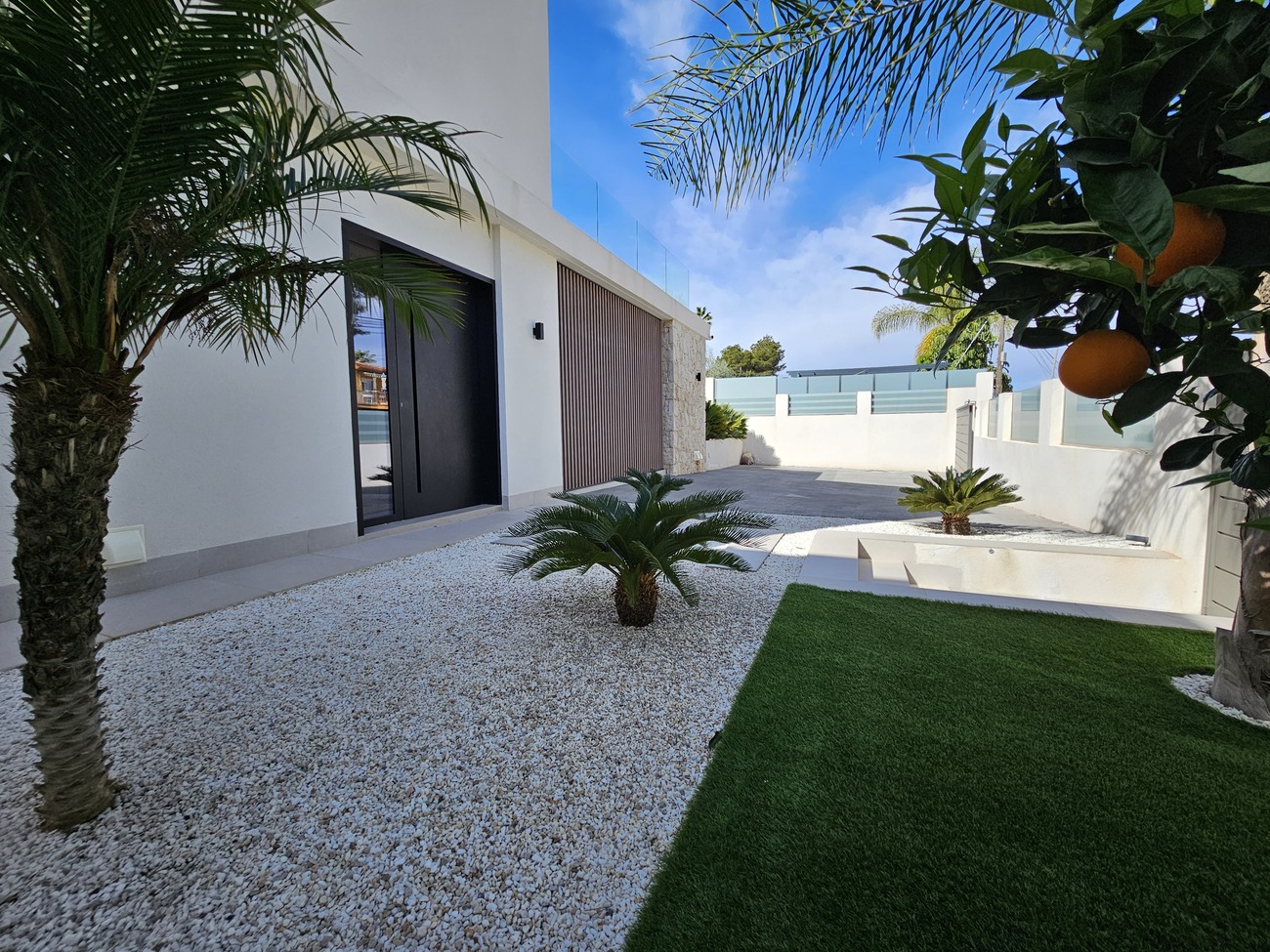 Prepare to be captivated by this stunning, almost-new property, built in 2022, and designed for modern living and effortless enjoyment! Boasting a meticulously planned layout, this partly furnished home offers 132M² of beautifully constructed space on a generous 359M² plot, complemented by a sprawling 62M² terrace perfect for soaking up the sun. Imagine lounging by your private 8x4 heated pool illuminated by LED lights, while enjoying the eco-friendly benefits of solar panels that drastically reduce your electricity bills. From the automated parking door and electric blinds to the state-of-the-art security system (interior and exterior), no detail has been overlooked. With features like ducted air conditioning, Bosch white goods, and underfloor heating in the bathrooms, comfort and luxury are paramount. Enjoy the privacy of your artificial grass lawn, framed by natural stone walls, fruit trees, and lush palm trees, all kept thriving by an automatic irrigation system. This is more than a home; it's a lifestyle waiting to be embraced!