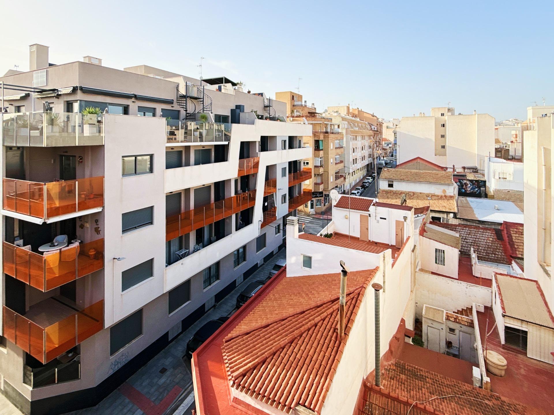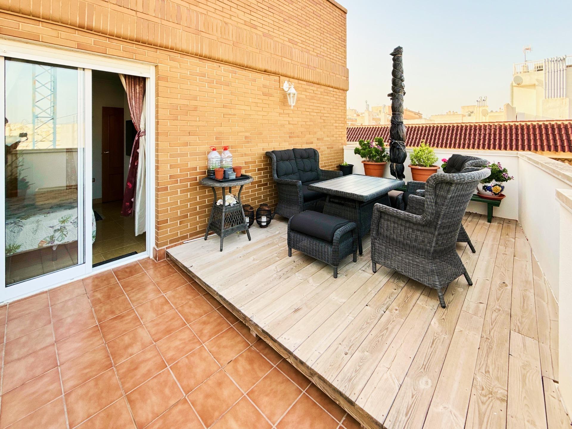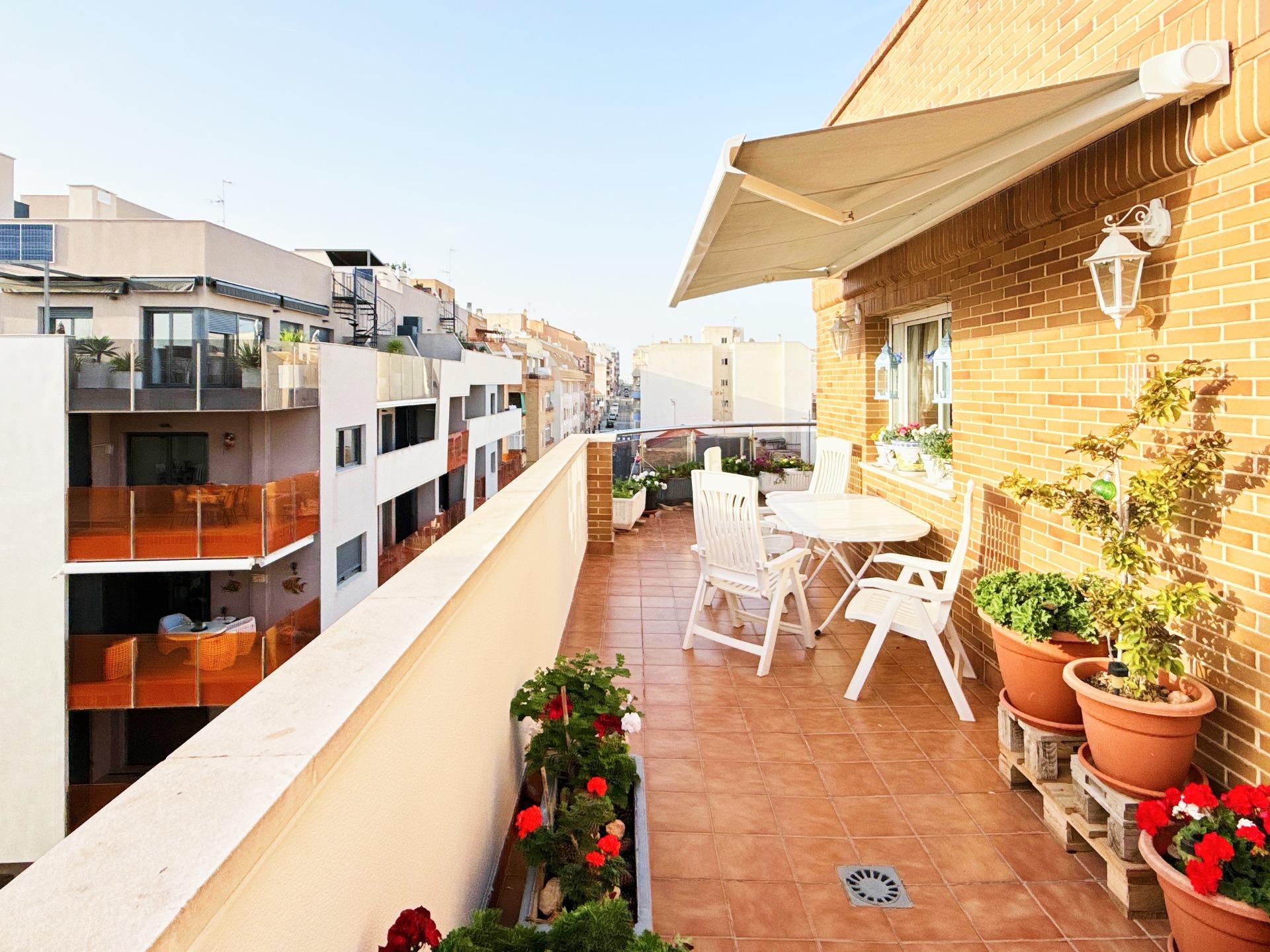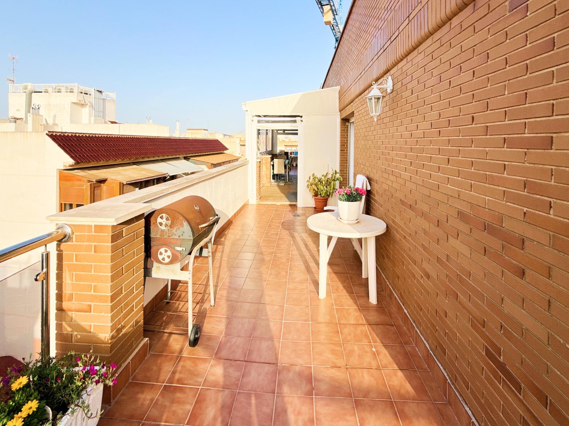 Vi præsenterer denne helt fantastiske penthouse i centrum af Torrevieja. Penthousen består af 4 soveværelser og 2 badeværelser (det ene en suite til master bedroom). Dens to terrasser giver mulighed for at slappe af forskellige steder, nyde flere orienteringer og drage fordel af al solen og skyggen afhængigt af tidspunktet på dagen. To af soveværelserne er direkte forbundet med hovedterrassen, der omkranser den L-formede bolig, og det ene soveværelse har egen terrasse på cirka 15 kvadratmeter. Ligeledes er der på hovedterrassen et rum med en pergola, hvor du kan nyde et godt måltid med familie og venner, et skønt øjebliks afslapning, og drage fordel af de mere end 300 solskinsdage, som Torreviejas misundelsesværdige klima byder på. Derudover har den et fuldt udstyret selvstændigt køkken med udgang til terrassen og den overdækkede og glaserede del af terrassen, som er strategisk placeret ud for køkkenet. I dette hus finder vi finish af høj kvalitet og naturligt lys hele dagen. Prisen inkluderer en parkeringsplads og et depotrum i en bygning 100 meter væk, så du kan glemme alt om at søge efter parkering i området. Penthouse-lejlighedens centrale beliggenhed giver os mulighed for at have alle faciliteter kun få minutters gang væk. Plaza de la Constitución ligger 3 minutters gang derfra, og Paseo de Vista Alegre og havnen er 7 minutters gang (500 meter). Kom og besøg denne storslåede ejendom NU og vær målløs!
