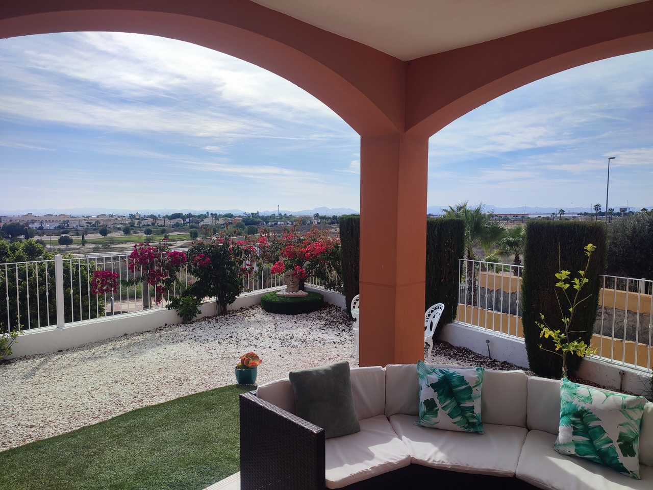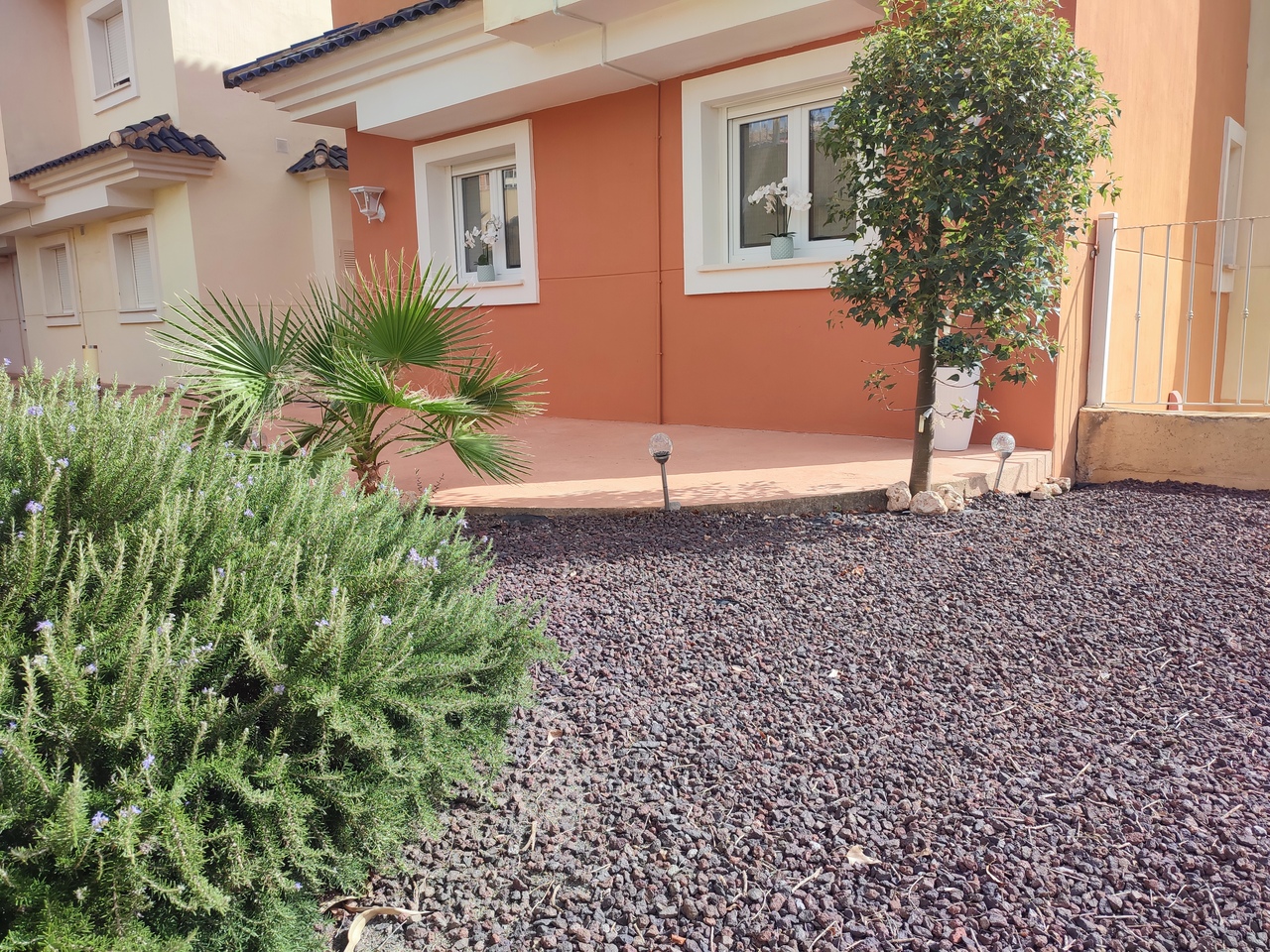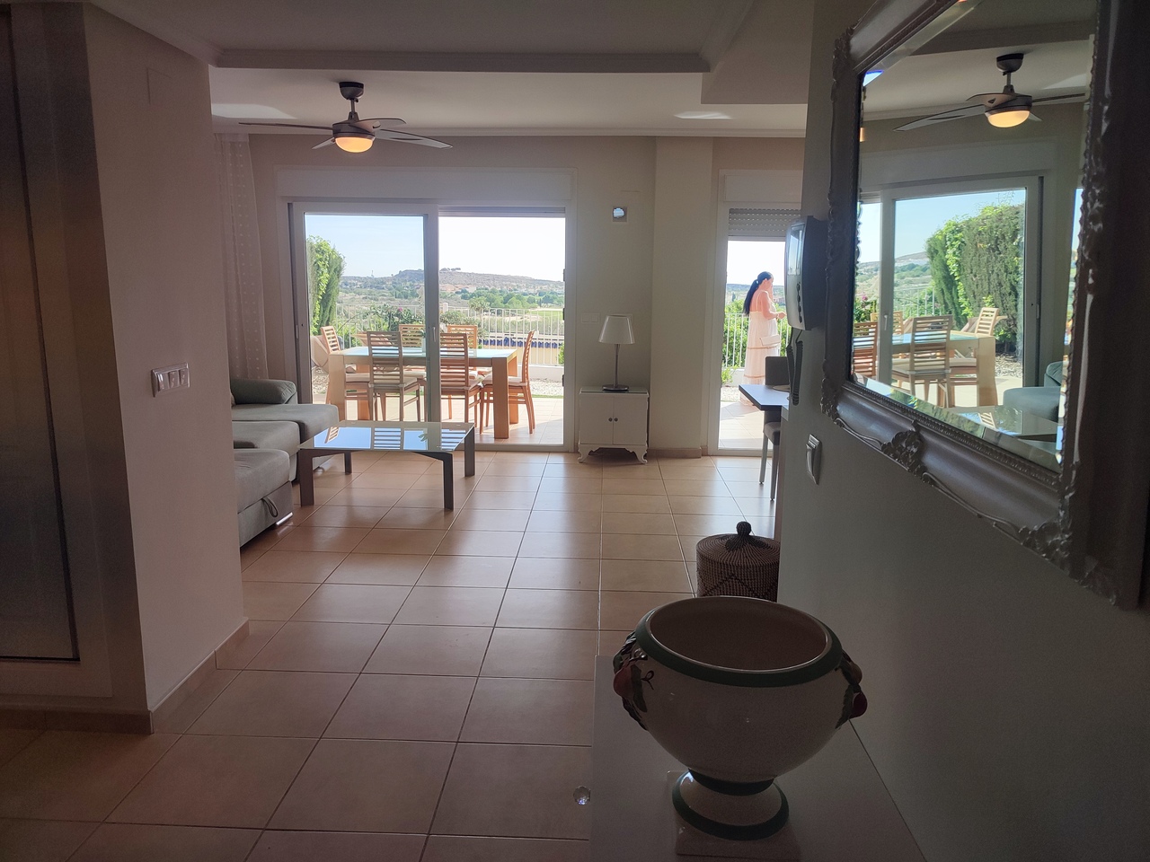 This apartment is on an elevated corner plot on Altaona golf & country village, great sunny garden of 105m2. Decorated in a modern design there is a large open plan kitchen and living area. 2 bedrooms, 2 bathrooms, (1 en-suite) utility room, big terrace and large garden.With beautiful views of mountains and golf course you also have access to a large communal salt water pool.The property is located in an urbanization at the foot of a mountain area called El Valle; with walking access to the path towards the mountains for hiking and biking lovers, a place where your children could play outside and ride their bikes on the street with no stress for you. The opening of the NEW CORVERA AIRPORT is having a great impact on the adjacent Resorts. The Club House and the 18 holes of the Golf course are already open.The location of this complex is ideal and very convenient, only: * 15 min. Murcia center * 20 min. Beach * 5 min. new airport * 8 min. new shopping center in La Alberca. *10 minutes. Hospital Arrixaca.