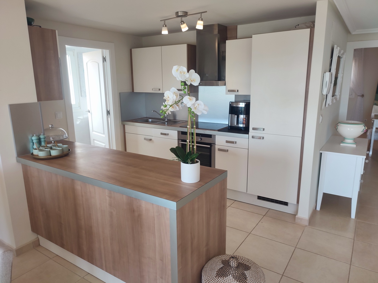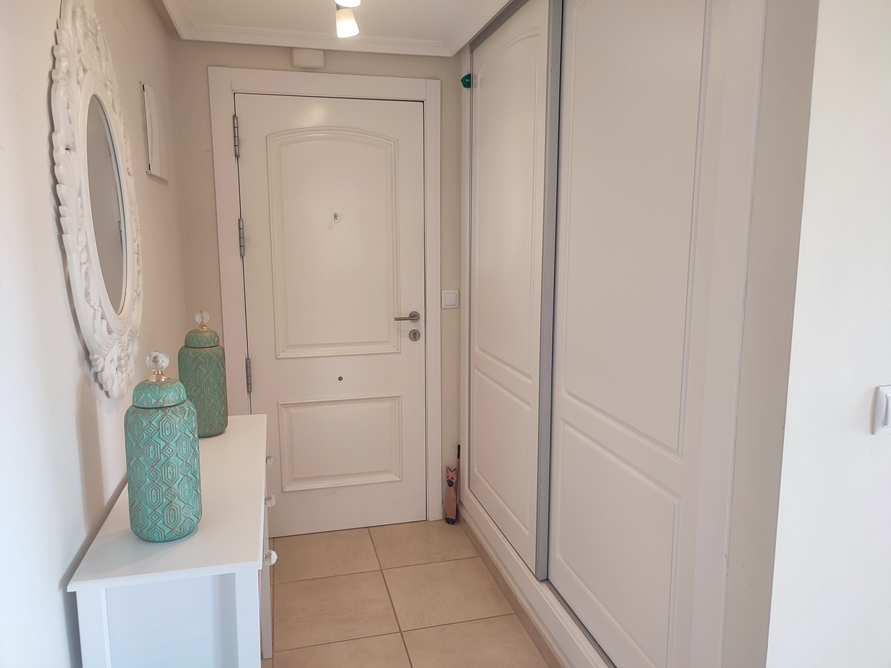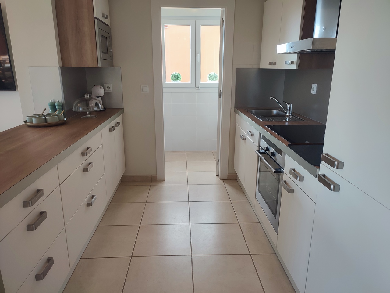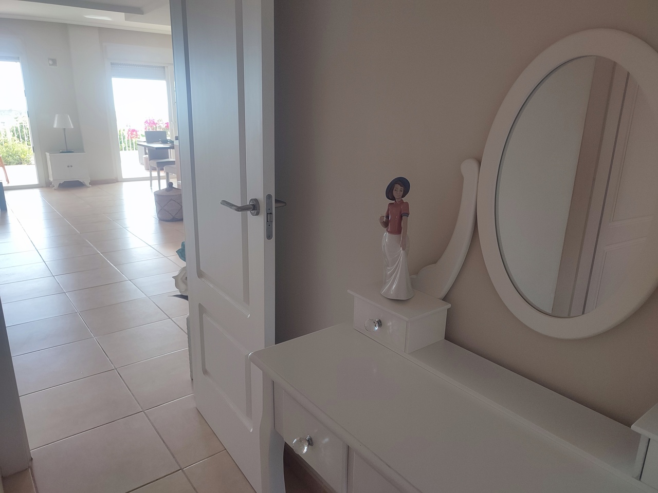 This apartment is on an elevated corner plot on Altaona golf & country village, great sunny garden of 105m2. Decorated in a modern design there is a large open plan kitchen and living area. 2 bedrooms, 2 bathrooms, (1 en-suite) utility room, big terrace and large garden.With beautiful views of mountains and golf course you also have access to a large communal salt water pool.The property is located in an urbanization at the foot of a mountain area called El Valle; with walking access to the path towards the mountains for hiking and biking lovers, a place where your children could play outside and ride their bikes on the street with no stress for you. The opening of the NEW CORVERA AIRPORT is having a great impact on the adjacent Resorts. The Club House and the 18 holes of the Golf course are already open.The location of this complex is ideal and very convenient, only: * 15 min. Murcia center * 20 min. Beach * 5 min. new airport * 8 min. new shopping center in La Alberca. *10 minutes. Hospital Arrixaca.