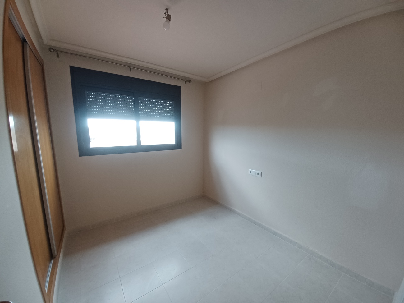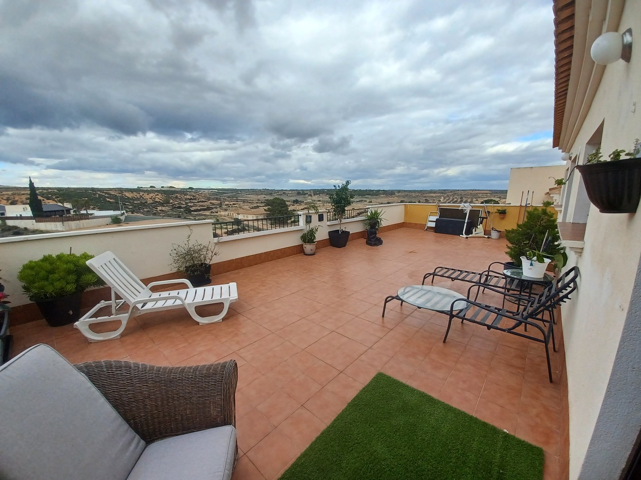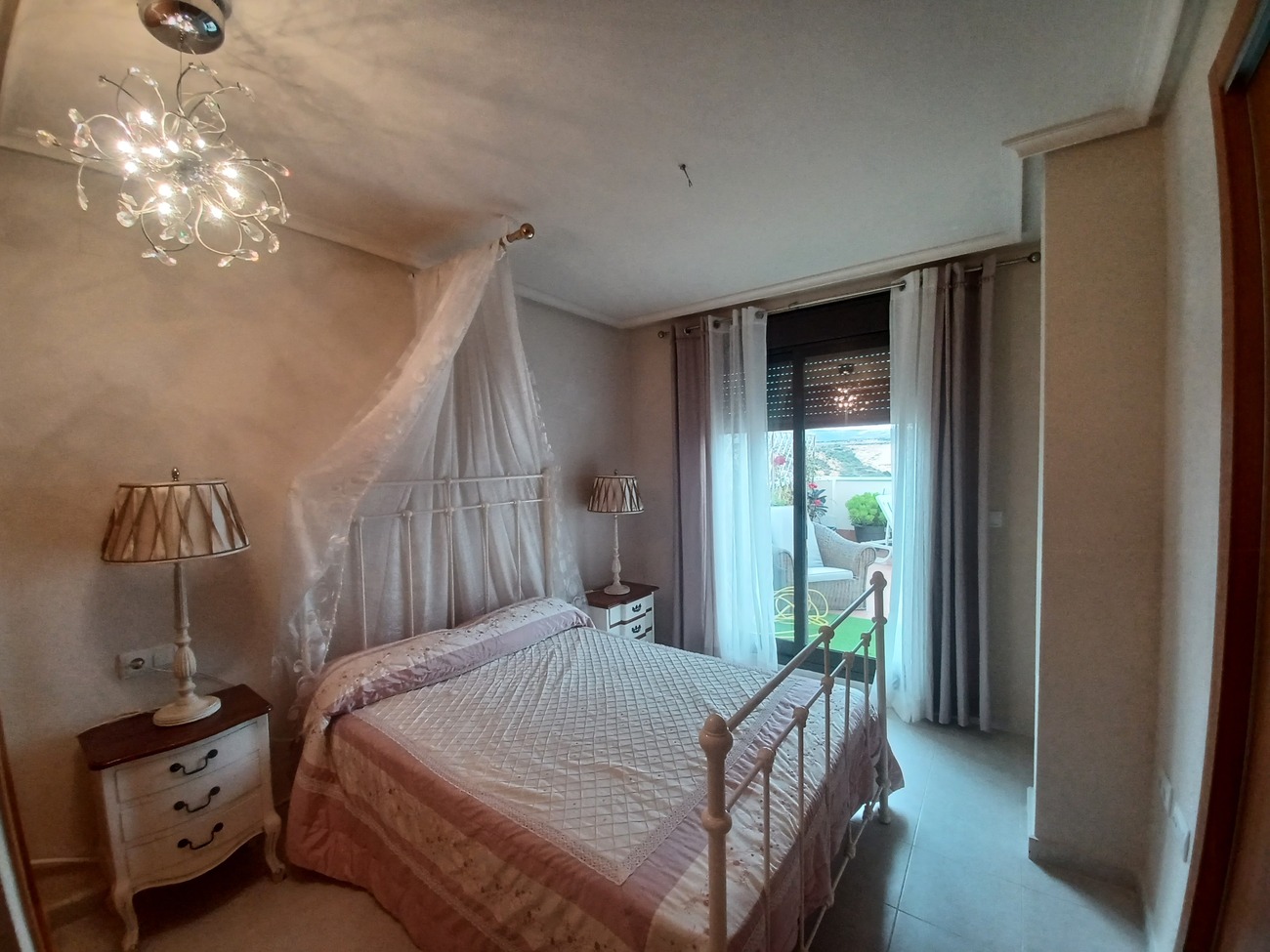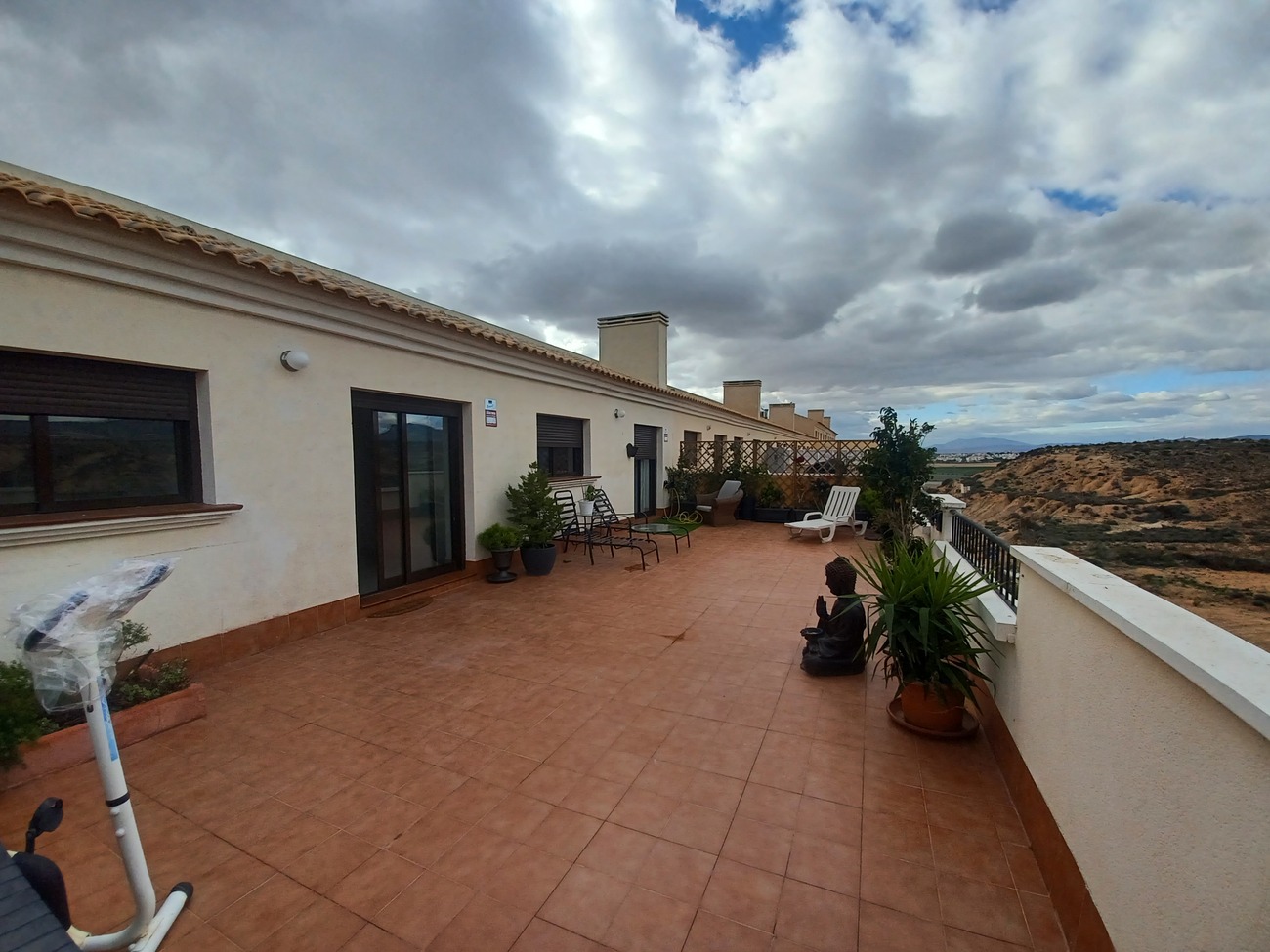 This spacious penthouse apartment offers plenty of outside space and modern interior.  The penthouse enters into a living/dining room with wardrobe storage at the front door, window, patio doors to a spacous outdoor terrace of 60m2, with views over the countryside and plenty of space to enjoy the sunshine and outdoor dining.  The kitchen is next to the living room, fully equipt with fitted kitchen cupboards, oven, hob, extractor, fridge freezer and washing machine.  there is a hallway from the living room leading to 2 double bedrooms, the first on the left hand side is a standard double with fitted wardrobes, window and blind.  The master bedroom is a double with double bed and bedside cabinet included, 2 double wardrobes and ensuite bathroom with double sink, walk in shower and wc.  The main bathroom has a shower, wc and vanity unit. The penthouse is situated on the top floor of La Vereda building with communal swimming pool and lift. Situated in the popular village of Sucina with supermarkets, bars, restaurants and all amenities to hand, it is a very convenient place to stay with everything within a short walk.  Just 20 minutes to the coast and 20 minutes to the airport.
