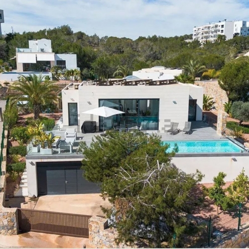 The exclusive frontline golf villas of the Ciruelo Community are located in a privileged location on Las Colinas Golf & Country Club golf course. The Ciruelo Community is made up of different villas, with a carefully studied location to optimise their orientation and views, as well as to ensure the enjoyment of the Mediterranean sun and light. This community has been developed following the Bisbita villa model, which has a large plot of 976 m² with 200 m² of constructed area and a private swimming pool of 40 m². It includes three bedrooms, two bathrooms —an en suite and a guest toilet—, a fully equipped open plan kitchen and a closed garage with two parking spaces.Its one-floor distribution and its large windows maximise its integration into the environment and facilitate outdoor living. Conceived for the enjoyment of the Mediterranean climate and landscape, this exclusive villa is very unique within the residential complex, both for its avant-garde design and its high-quality standards.The project is the work of the architectural studio Abeman Arquitectos.