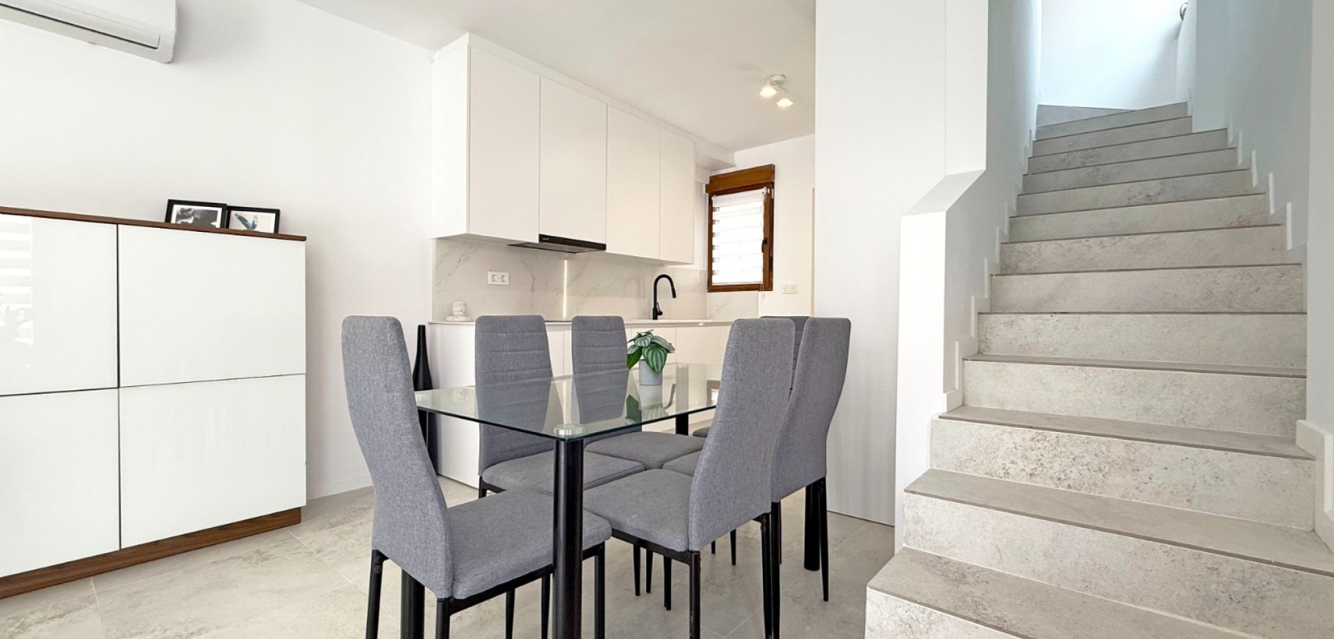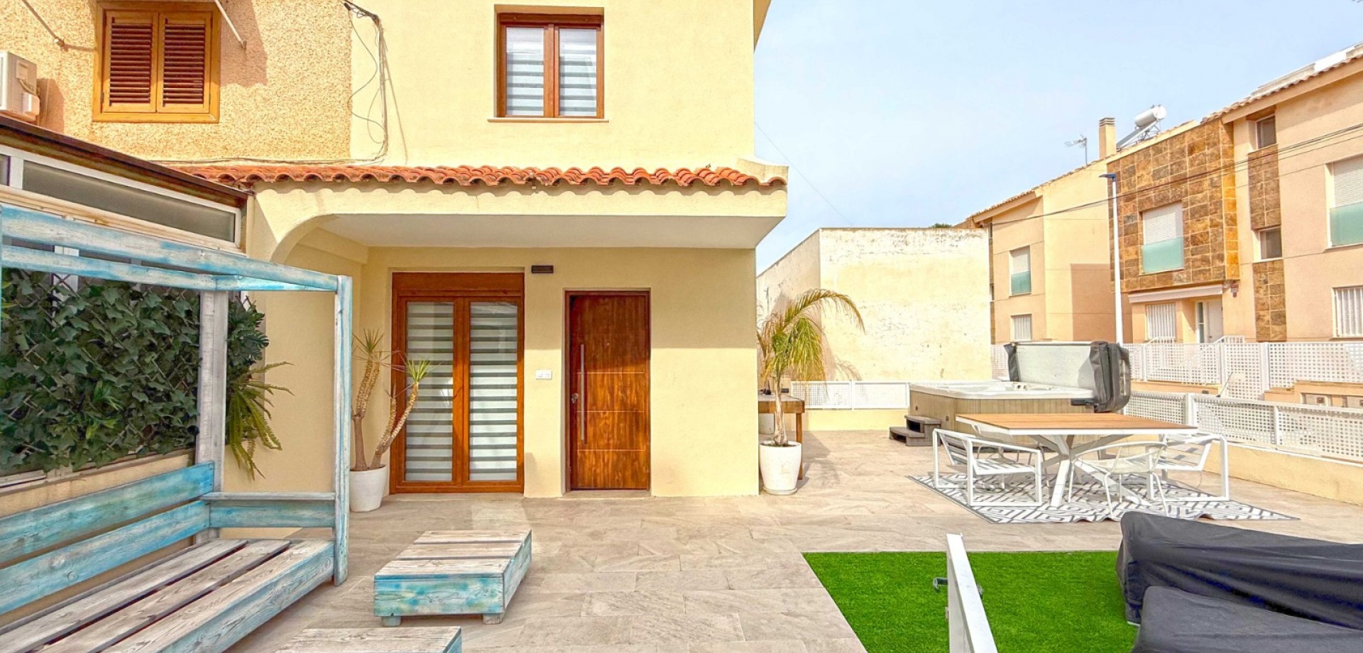 Step into coastal luxury with this beautifully renovated 3-bedroom, 2-bathroom corner townhouse, ideally located just 100 meters from the beach in Santiago de la Ribera. This fully furnished property offers a bright and modern open-plan living room, kitchen, and dining area, perfect for entertaining or relaxing. Enjoy the sunshine on the large terrace—ideal for outdoor dining and soaking up the Mediterranean breeze. Unwind in your private jacuzzi after a day at the beach. With stylish finishes throughout and a thoughtful renovation, this home is move-in ready for year-round living or as a holiday retreat. A rare opportunity to own a slice of paradise, just steps from the sea!